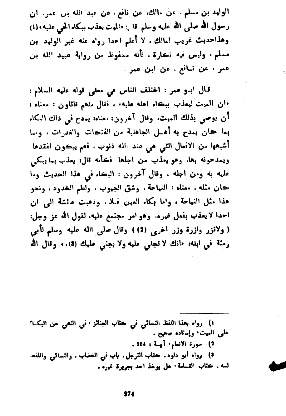 الْوَلِيدُ بْنُ مُسْلِمٍ عَنْ مَالِكٍ عَنْ نَافِعٍ عَنْ عَبْدِ اللَّهِ بْنِ عُمَرَ أَنَّ رَسُولَ اللَّهِ صَلَّى اللَّهُ عَلَيْهِ وَسَلَّمَ قَالَ الْمَيِّتُ يُعَذَّبُ بِبُكَاءِ الْحَيِّ عَلَيْهِ وَهَذَا حَدِيثٌ غَرِيبٌ لمالك لَا أَعْلَمُ أَحَدًا رَوَاهُ عَنْهُ غَيْرَ الْوَلِيدِ بْنِ مُسْلِمٍ وَلَيْسَ فِيهِ نَكَارَةٌ لِأَنَّهُ مَحْفُوظٌ مِنْ رِوَايَةِ عُبَيْدِ اللَّهِ بْنِ عُمَرَ عَنْ نَافِعٍ عَنِ ابْنِ عُمَرَ قَالَ أَبُو عُمَرَ اخْتَلَفَ النَّاسُ فِي مَعْنَى قَوْلِهِ عَلَيْهِ السَّلَامُ إِنَّ الْمَيِّتَ لَيُعَذَّبُ بِبُكَاءِ أَهْلِهِ عَلَيْهِ فَقَالَ مِنْهُمْ قَائِلُونَ مَعْنَاهُ أَنْ يُوصِيَ بِذَلِكَ الْمَيِّتُ وَقَالَ آخَرُونَ مَعْنَاهُ يُمْدَحُ فِي ذَلِكَ الْبُكَاءِ بِمَا كَانَ يُمْدَحُ بِهِ أَهْلُ الْجَاهِلِيَّةِ مِنَ الْفَتَكَاتِ وَالْغَدَرَاتِ وَمَا أَشْبَهَهَا مِنَ الْأَفْعَالِ الَّتِي هِيَ عِنْدَ اللَّهِ ذُنُوبٌ فَهُمْ يَبْكُونَ لِفَقْدِهَا وَيَمْدَحُونَهُ بِهَا وَهُوَ يُعَذَّبُ مِنْ أَجْلِهَا فَكَأَنَّهُ قَالَ يُعَذَّبُ بِمَا يُبْكَى عَلَيْهِ بِهِ وَمِنْ أَجْلِهِ وَقَالَ آخَرُونَ الْبُكَاءُ فِي هَذَا الْحَدِيثِ وَمَا كَانَ مِثْلُهُ مَعْنَاهُ النِّيَاحَةُ وَشَقُّ الْجُيُوبِ وَلَطْمُ الْخُدُودِ وَنَحْوُ هَذَا مِثْلَ النِّيَاحَةِ وَأَمَّا بُكَاءُ الْعَيْنِ فَلَا وَذَهَبَتْ عَائِشَةُ إِلَى أَنَّ أَحَدًا لَا يُعَذَّبُ بِفِعْلِ غَيْرِهِ وَهُوَ أَمْرٌ مُجْتَمَعٌ عَلَيْهِ لِقَوْلِ اللَّهُ عَزَّ وَجَلَّ وَلَا تَزِرُ وَازِرَةٌ وِزْرَ أُخْرَى) وَقَالَ صَلَّى اللَّهُ عَلَيْهِ وَسَلَّمَ لِأَبِي رِمْثَةَ فِي ابْنِهِ إِنَّكَ لَا تَجْنِي عَلَيْهِ وَلَا يَجْنِي عَلَيْكَ وَقَالَ الله