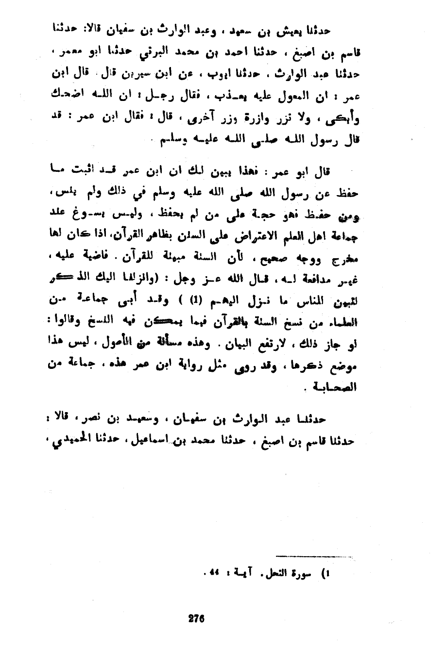 حَدَّثَنَا يَعِيشُ بْنُ سَعِيدٍ وَعَبْدُ الْوَارِثِ بْنُ سُفْيَانَ قَالَا حَدَّثَنَا قَاسِمُ بْنُ أَصْبَغَ حَدَّثَنَا أَحْمَدُ بْنُ مُحَمَّدٍ الْبِرْتِيُّ حَدَّثَنَا أَبُو مَعْمَرٍ حَدَّثَنَا عَبْدُ الْوَارِثِ حَدَّثَنَا أَيُّوبُ عَنِ ابْنِ سِيرِينَ قَالَ قَالَ ابْنُ عُمَرَ إِنَّ الْمُعَوَّلَ عَلَيْهِ يُعَذَّبُ فَقَالَ رَجُلٌ إِنَّ اللَّهَ أَضْحَكَ وَأَبْكَى وَلَا تَزِرُ وَازِرَةٌ وِزْرَ أُخْرَى قَالَ فَقَالَ ابْنُ عُمَرَ قَدْ قَالَ رَسُولُ اللَّهِ صَلَّى اللَّهُ عَلَيْهِ وَسَلَّمَ قَالَ أَبُو عُمَرَ فَهَذَا يُبَيِّنُ لَكَ أَنَّ ابْنَ عُمَرَ قَدْ أَثْبَتَ مَا حَفِظَ عَنْ رَسُولِ اللَّهِ صَلَّى اللَّهُ عَلَيْهِ وَسَلَّمَ فِي ذَلِكَ وَلَمْ يَنْسَ وَمَنْ حَفِظَ فَهُوَ حُجَّةٌ عَلَى مَنْ لَمْ يَحْفَظْ وَلَيْسَ يُسَوَّغُ عِنْدَ جَمَاعَةِ أَهْلِ الْعِلْمِ الِاعْتِرَاضُ عَلَى السُّنَنِ بِظَاهِرِ الْقُرْآنِ إِذَا كَانَ لَهَا مَخْرَجٌ وَوَجْهٌ صَحِيحٌ لِأَنَّ السُّنَّةَ مُبَيِّنَةٌ لِلْقُرْآنِ قَاضِيَةٌ عَلَيْهِ غَيْرُ مُدَافِعَةٍ لَهُ قَالَ اللَّهُ عَزَّ وَجَلَّ وَأَنْزَلْنَا إِلَيْكَ الذِّكْرَ لِتُبَيِّنَ لِلنَّاسِ مَا نُزِّلَ إِلَيْهِمْ وَقَدْ أَبَى جَمَاعَةٌ مِنَ الْعُلَمَاءِ مِنْ نَسْخِ السُّنَّةِ بِالْقُرْآنِ فِيمَا يُمْكِنُ فِيهِ النُّسَخُ وَقَالُوا لَوْ جَازَ ذَلِكَ لَارْتَفَعَ الْبَيَانُ وَهَذِهِ مَسْأَلَةٌ مِنَ الْأُصُولِ لَيْسَ هَذَا مَوْضِعَ ذِكْرِهَا وَقَدْ رَوَى مِثْلَ رِوَايَةِ ابْنِ عُمَرَ هَذِهِ جَمَاعَةٌ مِنَ الصَّحَابَةِ حَدَّثَنَا عَبْدُ الْوَارِثِ بْنُ سُفْيَانَ وَسَعِيدُ بْنُ نَصْرٍ قَالَا حَدَّثَنَا قَاسِمُ بْنُ أَصْبَغَ حَدَّثَنَا مُحَمَّدُ بْنُ إِسْمَاعِيلَ حَدَّثَنَا الْحُمَيْدِيُّ