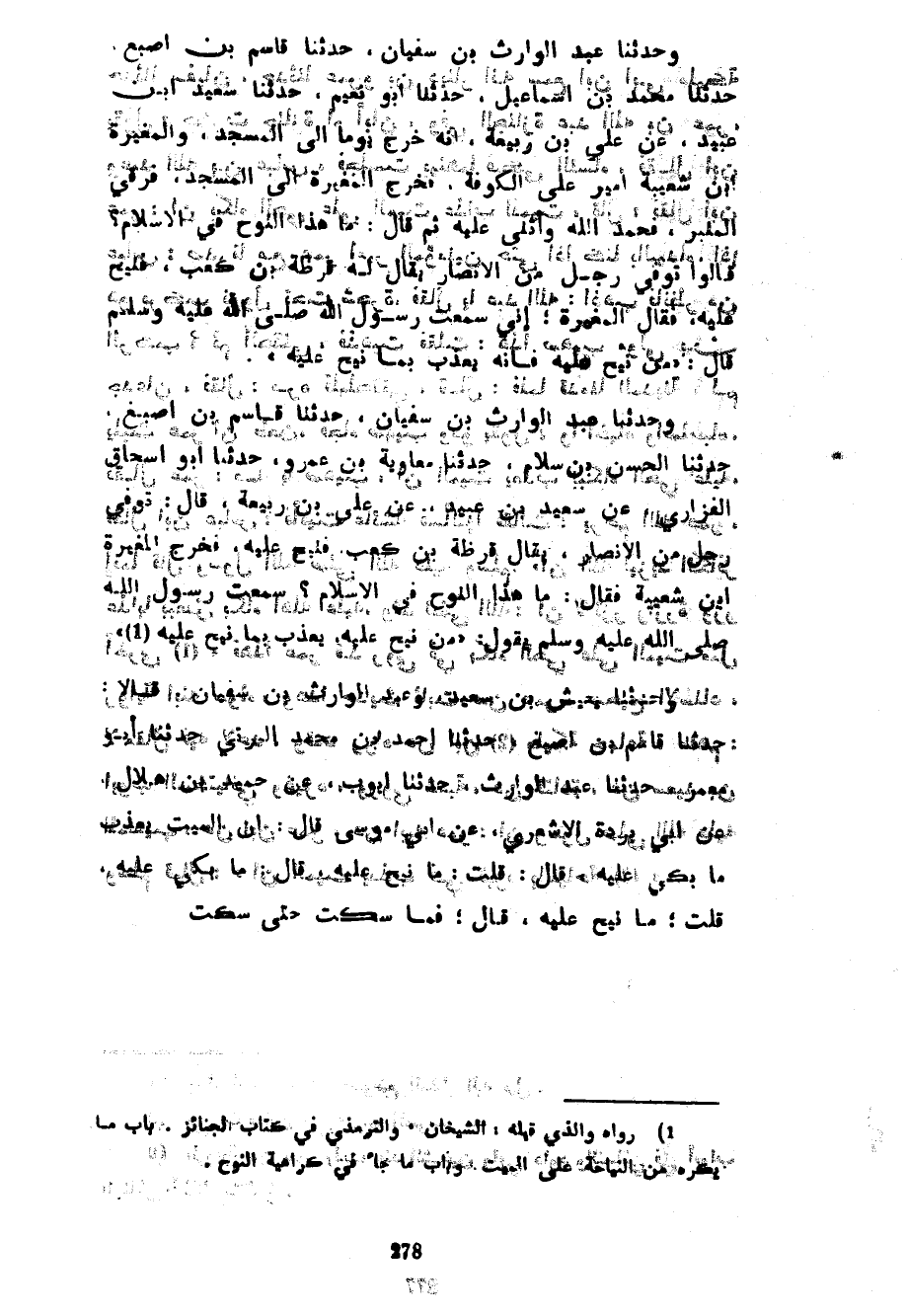 وَحَدَّثَنَا عَبْدُ الْوَارِثِ بْنُ سُفْيَانَ حَدَّثَنَا قَاسِمُ بْنُ أَصْبَغَ حَدَّثَنَا مُحَمَّدُ بْنُ إِسْمَاعِيلَ حَدَّثَنَا أَبُو نُعَيْمٍ حَدَّثَنَا سَعِيدُ بْنُ عُبَيْدٍ عَنْ عَلِيِّ بْنِ رَبِيعَةَ أَنَّهُ خَرَجَ يَوْمًا إِلَى المسجد والمغيرة بن شعيبة أَمِيرٌ عَلَى الْكُوفَةِ فَخَرَجَ الْمُغِيرَةُ إِلَى الْمَسْجِدِ فَرَقِيَ الْمِنْبَرَ فَحَمِدَ اللَّهَ وَأَثْنَى عَلَيْهِ ثُمَّ قَالَ مَا هَذَا النَّوْحُ فِي الْإِسْلَامِ قَالُوا تُوُفِّيَ رَجُلٌ مِنَ الْأَنْصَارِ يُقَالُ لَهُ قَرَظَةُ بْنُ كَعْبٍ فَنِيحَ عَلَيْهِ فَقَالَ الْمُغِيرَةُ إِنِّي سَمِعْتُ رَسُولَ اللَّهِ صَلَّى اللَّهُ عَلَيْهِ وسلم قَالَ مَنْ نِيحَ عَلَيْهِ فَإِنَّهُ يُعَذَّبُ بِمَا نِيحَ عَلَيْهِ وَحَدَّثَنَا عَبْدُ الْوَارِثِ بْنُ سُفْيَانَ حَدَّثَنَا قَاسِمُ بْنُ أَصْبَغَ حَدَّثَنَا الْحَسَنُ بْنُ سَلَامٍ حَدَّثَنَا مُعَاوِيَةُ بْنُ عَمْرٍو حَدَّثَنَا أَبُو إِسْحَاقَ الْفَزَارِيُّ عَنْ سَعِيدِ بْنِ عُبَيْدٍ عَنْ عَلِيِّ بْنِ رَبِيعَةَ قَالَ تُوُفِّيَ رَجُلٌ مِنَ الْأَنْصَارِ يُقَالُ قَرَظَةُ بْنُ كَعْبٍ فَنِيحَ عَلَيْهِ فخرج المغيرة بن شعيبة فَقَالَ مَا هَذَا النَّوْحُ فِي الْإِسْلَامِ سَمِعْتُ رسول الله صلى الله عليه وسلم يقول مَنْ نِيحَ عَلَيْهِ يُعَذَّبْ بِمَا نِيحَ عَلَيْهِ وَحَدَّثَنَا يَعِيشُ بْنُ سَعِيدٍ وَعَبْدُ الْوَارِثِ بْنُ سُفْيَانَ قَالَا حَدَّثَنَا قَاسِمُ بْنُ أَصْبَغَ حَدَّثَنَا أَحْمَدُ بْنُ مُحَمَّدٍ الْبِرْتِيُّ حَدَّثَنَا أَبُو مَعْمَرٍ حَدَّثَنَا عَبْدُ الْوَارِثِ حَدَّثَنَا أَيُّوبُ عَنْ حُمَيْدِ بْنِ هِلَالٍ عَنْ أَبِي بُرْدَةَ الْأَشْعَرِيِّ عَنْ أَبِي مُوسَى قَالَ إِنَّ الْمَيِّتَ يُعَذَّبُ مَا بُكِيَ عَلَيْهِ قَالَ قُلْتُ مَا نِيحَ عَلَيْهِ قَالَ مَا بُكِيَ عَلَيْهِ قُلْتُ مَا نِيحَ عَلَيْهِ قَالَ فَمَا سَكَتَ حَتَّى سَكَتُّ