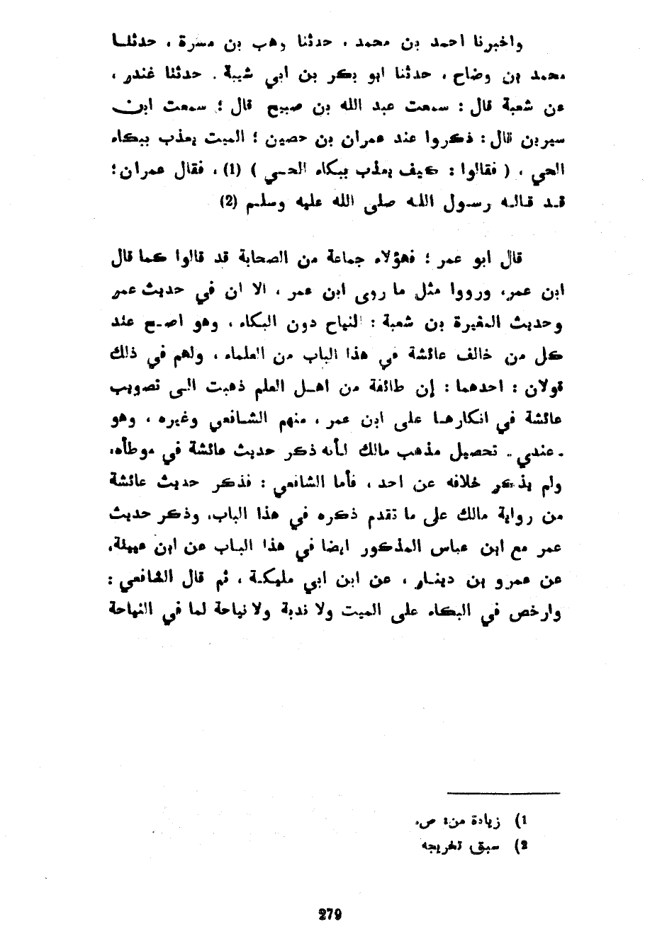 وَأَخْبَرَنَا أَحْمَدُ بْنُ مُحَمَّدٍ حَدَّثَنَا وَهْبُ بْنُ مَسَرَّةَ حَدَّثَنَا مُحَمَّدُ بْنُ وَضَّاحٍ حَدَّثَنَا أَبُو بَكْرِ بْنُ أَبِي شَيْبَةَ حَدَّثَنَا غُنْدَرٌ عَنْ شُعْبَةَ قَالَ سَمِعْتُ عَبْدَ اللَّهِ بْنَ صُبَيْحٍ قَالَ سَمِعْتُ ابْنَ سِيرِينَ قَالَ ذَكَرُوا عِنْدَ عِمْرَانَ بْنِ حُصَيْنٍ الْمَيِّتُ يُعَذَّبُ بِبُكَاءِ الْحَيِّ (فَقَالُوا كَيْفَ يُعَذَّبُ بِبُكَاءِ الْحَيِّ) فَقَالَ عِمْرَانُ قَدْ قَالَهُ رَسُولُ اللَّهِ صَلَّى اللَّهُ عَلَيْهِ وَسَلَّمَ قَالَ أَبُو عُمَرَ فَهَؤُلَاءِ جَمَاعَةٌ مِنَ الصَّحَابَةِ قَدْ قَالُوا كَمَا قَالَ ابْنُ عُمَرَ وَرَوَوْا مِثْلَ مَا رَوَى ابْنُ عُمَرَ إِلَّا أَنَّ فِي حَدِيثِ عُمَرَ وَحَدِيثِ الْمُغِيرَةِ بْنِ شُعْبَةَ النِّيَاحُ دُونَ الْبُكَاءِ وَهُوَ أَصَحُّ عِنْدَ كُلِّ مَنْ خَالَفَ عَائِشَةَ فِي هَذَا الْبَابِ مِنَ الْعُلَمَاءِ وَلَهُمْ فِي ذَلِكَ قَوْلَانِ أَحَدُهُمَا أَنَّ طَائِفَةً مِنْ أَهْلِ الْعِلْمِ ذَهَبَتْ إِلَى تَصْوِيبِ عَائِشَةَ فِي إِنْكَارِهَا عَلَى ابْنِ عُمَرَ مِنْهُمْ الشَّافِعِيُّ وَغَيْرُهُ وَهُوَ عِنْدِي تَحْصِيلُ مَذْهَبِ مَالِكٍ لِأَنَّهُ ذَكَرَ حَدِيثَ عَائِشَةَ فِي مُوَطَّئِهِ وَلَمْ يُذْكَرْ خِلَافُهُ عَنْ أَحَدٍ فَأَمَّا الشَّافِعِيُّ فَذَكَرَ حَدِيثَ عَائِشَةَ مِنْ رِوَايَةِ مَالِكٍ عَلَى مَا تَقَدَّمَ ذِكْرُهُ فِي هَذَا الْبَابِ وَذَكَرَ حَدِيثَ عُمَرَ مَعَ ابْنِ عَبَّاسٍ الْمَذْكُورَ أَيْضًا فِي هَذَا الْبَابِ عَنِ ابْنُ عُيَيْنَةَ عَنْ عَمْرِو بْنِ دِينَارٍ عَنِ ابْنِ أَبِي مُلَيْكَةَ ثُمَّ قَالَ الشَّافِعِيُّ وَأُرَخِّصُ فِي الْبُكَاءِ عَلَى الْمَيِّتِ وَلَا نُدْبَةَ وَلَا نِيَاحَةَ لِمَا فِي النياحة