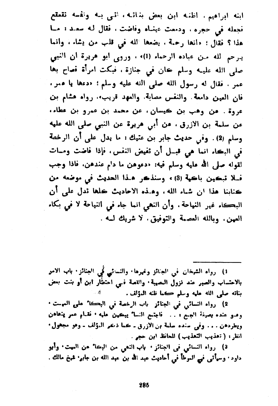 ابْنِهِ إِبْرَاهِيمَ أَظُنُّهُ ابْنَ بَعْضِ بَنَاتِهِ أُتِيَ بِهِ وَنَفْسُهُ تَقَعْقَعُ فَجَعَلَهُ فِي حِجْرِهِ وَدَمِعَتْ عَيْنَاهُ وَفَاضَتْ فَقَالَ لَهُ سَعْدٌ مَا هَذَا فَقَالَ إِنَّهَا رَحْمَةٌ يَضَعُهَا اللَّهُ فِي قَلْبِ مَنْ يَشَاءُ وَإِنَّمَا يَرْحَمُ اللَّهُ مِنْ عِبَادِهِ الرُّحَمَاءَ وَرَوَى أَبُو هُرَيْرَةَ أَنَّ النَّبِيَّ صَلَّى اللَّهُ عَلَيْهِ وَسَلَّمَ كَانَ فِي جِنَازَةٍ فَبَكَتِ امْرَأَةٌ فَصَاحَ بِهَا عُمَرُ فَقَالَ لَهُ رَسُولُ اللَّهِ صَلَّى اللَّهُ عَلَيْهِ وَسَلَّمَ دَعْهَا يَا عُمَرُ فَإِنَّ الْعَيْنَ دَامِعَةٌ وَالنَّفْسَ مُصَابَةٌ وَالْعَهْدَ قَرِيبٌ رَوَاهُ هِشَامُ بْنُ عُرْوَةَ عَنْ وَهْبِ بْنِ كَيْسَانَ عَنْ مُحَمَّدِ بْنِ عَمْرِو بْنِ عَطَاءٍ عَنْ سَلَمَةَ بْنِ الْأَزْرَقِ عَنْ أَبِي هُرَيْرَةَ عَنِ النَّبِيِّ صَلَّى اللَّهُ عليه وسلم وَفِي حَدِيثِ جَابِرِ بْنِ عَتِيكٍ مَا يَدُلُّ عَلَى أَنَّ الرُّخْصَةَ فِي الْبُكَاءِ إِنَّمَا هِيَ قَبْلَ أَنْ تَفِيضَ النَّفْسُ فَإِذَا فَاضَتْ وَمَاتَ لِقَوْلِهِ صَلَّى اللَّهُ عَلَيْهِ وَسَلَّمَ فِيهِ دَعُوهُنَّ مَا دَامَ عِنْدَهُنَّ فَإِذَا وَجَبَ فَلَا تَبْكِيَنَّ بَاكِيَةٌ وَسَنَذْكُرُ هَذَا الْحَدِيثَ فِي مَوْضِعِهِ مِنْ كِتَابِنَا هَذَا إِنْ شَاءَ اللَّهُ وَهَذِهِ الْأَحَادِيثُ كُلُّهَا تَدُلُّ عَلَى أَنَّ الْبُكَاءَ غَيْرُ النِّيَاحَةِ وَأَنَّ النَّهْيَ إِنَّمَا جَاءَ فِي النِّيَاحَةِ لَا فِي بُكَاءِ الْعَيْنِ وَبِاللَّهِ الْعِصْمَةُ وَالتَّوْفِيقُ لَا شريك له