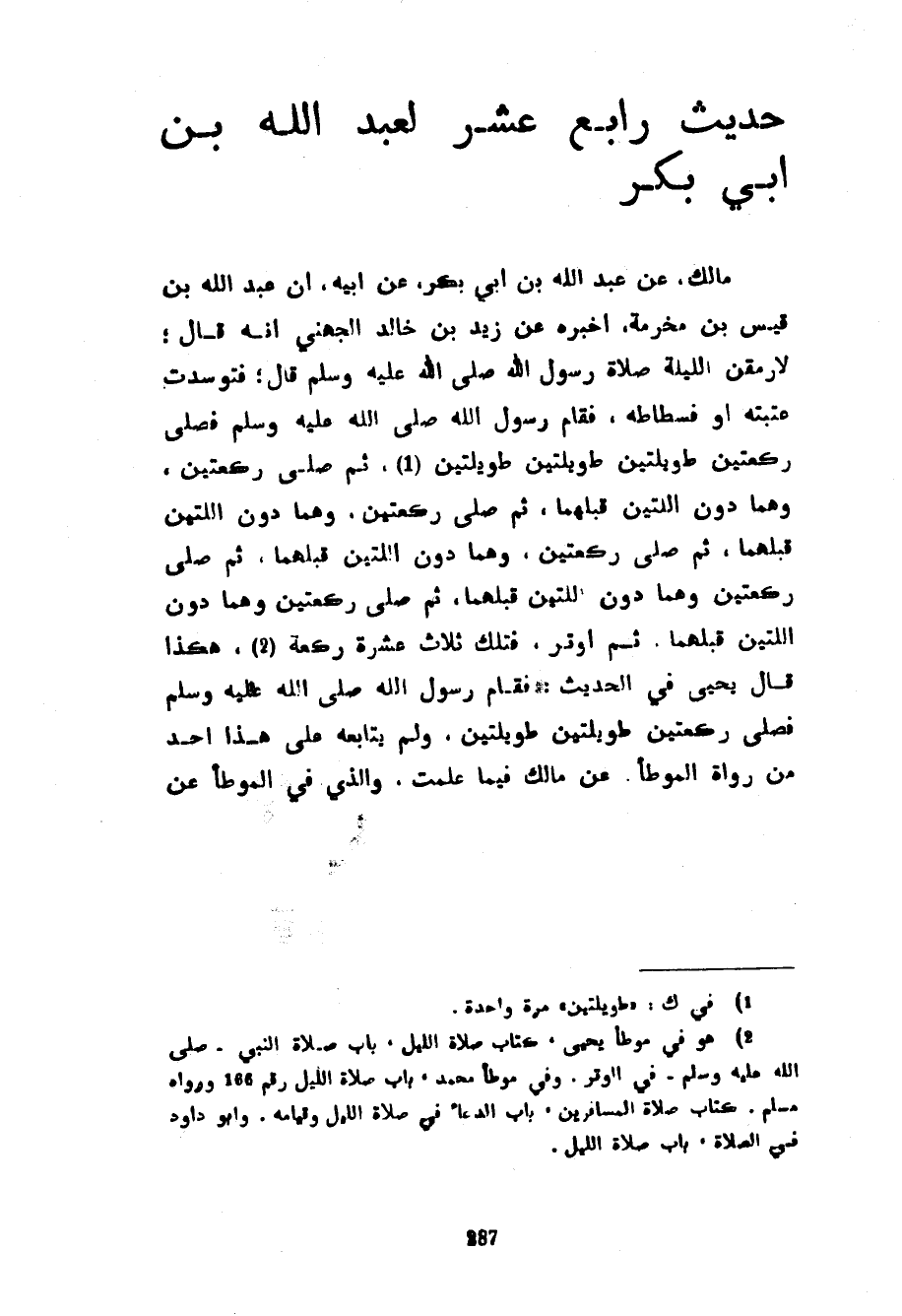 حَدِيثٌ رَابِعَ عَشَرَ لِعَبْدِ اللَّهِ بْنِ أَبِي بَكْرٍ مَالِكٌ عَنْ عَبْدِ اللَّهِ بْنِ أَبِي بَكْرٍ عَنْ أَبِيهِ أَنَّ عَبْدَ اللَّهِ بْنَ قَيْسِ بْنِ مَخْرَمَةَ أَخْبَرَهُ عَنْ زَيْدِ بْنِ خَالِدٍ الْجُهَنِيِّ أَنَّهُ قَالَ لَأَرْمُقَنَّ اللَّيْلَةَ صَلَاةَ رسول الله صلى الله عليه وسلم قال فَتَوَسَّدْتُ عَتَبَتَهُ أَوْ فُسْطَاطَهُ فَقَامَ رَسُولُ اللَّهِ صَلَّى اللَّهُ عَلَيْهِ وَسَلَّمَ فَصَلَّى رَكْعَتَيْنِ طَوِيلَتَيْنِ طَوِيلَتَيْنِ طَوِيلَتَيْنِ ثُمَّ صَلَّى رَكْعَتَيْنِ وَهُمَا دُونَ اللَّتَيْنِ قَبْلَهُمَا ثُمَّ صَلَّى رَكْعَتَيْنِ وَهُمَا دُونَ اللَّتَيْنِ قَبْلَهُمَا ثُمَّ صَلَّى رَكْعَتَيْنِ وَهُمَا دُونَ اللَّتَيْنِ قَبْلَهُمَا ثُمَّ صَلَّى رَكْعَتَيْنِ وَهُمَا دُونَ اللَّتَيْنِ قَبْلَهُمَا ثُمَّ صَلَّى رَكْعَتَيْنِ وَهُمَا دُونَ اللَّتَيْنِ قَبْلَهُمَا ثُمَّ أَوْتَرَ فَتِلْكَ ثَلَاثَ عَشْرَةَ رَكْعَةً هَكَذَا قَالَ يَحْيَى فِي الْحَدِيثِ فَقَامَ رَسُولُ اللَّهِ صَلَّى اللَّهُ عَلَيْهِ وَسَلَّمَ فَصَلَّى رَكْعَتَيْنِ طَوِيلَتَيْنِ طَوِيلَتَيْنِ وَلَمْ يُتَابِعْهُ عَلَى هَذَا أَحَدٌ مِنْ رُوَاةِ الْمُوَطَّأِ عَنْ مَالِكٍ فِيمَا عَلِمْتُ وَالَّذِي فِي الْمُوَطَّأِ عَنْ