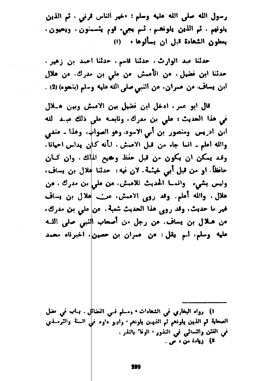 رَسُولُ اللَّهِ صَلَّى اللَّهُ عَلَيْهِ وَسَلَّمَ النَّاسَ قَرْنِي ثُمَّ الَّذِينَ يَلُونَهُمْ ثُمَّ الَّذِينَ يلونهم ثم يجيء قوم يتسمنون ويحيون يُعْطُونَ الشَّهَادَةَ قَبْلَ أَنْ يُسْأَلُوهَا حَدَّثَنَا عَبْدُ الْوَارِثِ حَدَّثَنَا قَاسِمٌ حَدَّثَنَا أَحْمَدُ بْنُ زهير حَدَّثَنَا ابْنُ فُضَيْلٍ عَنِ الْأَعْمَشِ عَنْ عَلِيِّ بْنِ مُدْرِكٍ عَنْ هِلَالِ بْنِ يَسَافٍ عَنْ عِمْرَانَ عَنِ النَّبِيِّ صَلَّى اللَّهُ عَلَيْهِ وَسَلَّمَ (بِنَحْوِهِ) قَالَ أَبُو عُمَرَ أَدْخَلَ ابْنُ فُضَيْلٍ بَيْنَ الْأَعْمَشِ وَبَيْنَ هِلَالٍ فِي هَذَا الْحَدْيِثِ عَلِيَّ بْنَ مُدْرِكٍ وَتَابَعَهُ عَلَى ذَلِكَ عَبْدُ اللَّهِ بْنُ إِدْرِيسَ وَمَنْصُورُ بْنُ أَبِي الْأَسْوَدِ وَهُو الصَّوَابُ وَهَذَا عِنْدِي وَاللَّهُ أَعْلَمُ إِنَّمَا جَاءَ مِنْ قِبَلِ الْأَعْمَشِ لِأَنَّهُ كَانَ يُدَلِّسُ أَحْيَانًا وَقَدْ يُمْكِنُ أَنْ يَكُونَ مِنْ قِبَلِ حِفْظِ وَكِيعٍ لِذَلِكَ وَإِنْ كَانَ حَافِظًا أَوْ مِنْ قِبَلِ أَبِي خَيْثَمَةَ لِأَنَّ فِيهِ حَدَّثَنَا هِلَالُ بْنُ يَسَافٍ وَلَيْسَ بِشَيْءٍ وَإِنَّمَا الْحَدِيثُ لِلْأَعْمَشِ عَنْ عَلِيِّ بْنِ مُدْرِكٍ عَنْ هِلَالٍ وَاللَّهُ أَعْلَمُ وَقَدْ رَوَى الْأَعْمَشُ عَنْ هِلَالِ بْنِ يَسَافٍ غَيْرَ مَا حَدِيثٍ وَقَدْ رَوَى هَذَا الْحَدْيِثَ شُعْبَةُ عَنْ عَلِيِّ بْنِ مُدْرِكٍ عَنْ هِلَالِ بْنِ يَسَافٍ عَنْ رَجُلٍ مِنْ أَصْحَابِ النَّبِيِّ صَلَّى اللَّهُ عَلَيْهِ وَسَلَّمَ لَمْ يَقُلْ عَنْ عِمْرَانَ بْنِ حُصَيْنٍ أَخْبَرَنَاهُ مُحَمَّدُ