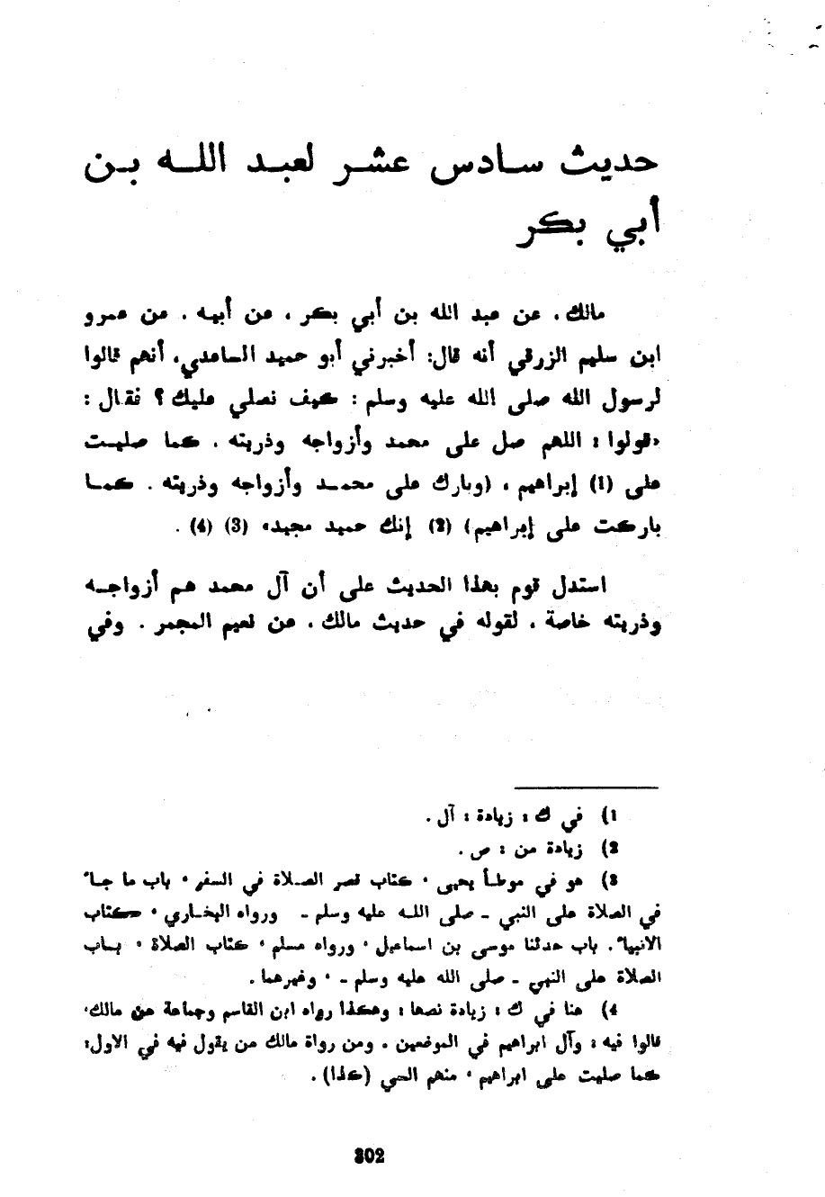 حَدِيثٌ سَادِسَ عَشَرَ لِعَبْدِ اللَّهِ بْنِ أَبِي بَكْرٍ مَالِكٌ عَنْ عَبْدِ اللَّهِ بْنِ أَبِي بَكْرٍ عَنْ أَبِيهِ عَنْ عَمْرِو بْنِ سُلَيْمٍ الزُّرَقِيِّ أَنَّهُ قَالَ أَخْبَرَنِي أَبُو حُمَيْدٍ السَّاعِدِيُّ أَنَّهُمْ قَالُوا لِرَسُولِ اللَّهِ صَلَّى اللَّهُ عَلَيْهِ وَسَلَّمَ كَيْفَ نُصَلِّي عَلَيْكَ فَقَالَ قُولُوا اللَّهُمَّ صلى عَلَى مُحَمَّدٍ وَأَزْوَاجِهِ وَذُرِّيَّتِهِ كَمَا صَلَّيْتَ عَلَى إِبْرَاهِيمَ (وَبَارِكْ عَلَى مُحَمَّدٍ وَأَزْوَاجِهِ وَذُرِّيَّتِهِ كَمَا بَارَكَتْ عَلَى إِبْرَاهِيمَ) إِنَّكَ حُمَيْدٌ مَجِيدٌ اسْتَدَلَّ قَوْمٌ بِهَذَا الْحَدِيثِ عَلَى أَنَّ آلَ مُحَمَّدٍ هُمْ أَزْوَاجُهُ وَذُرِّيَّتُهُ خَاصَّةً لِقَوْلِهِ فِي حَدِيثِ مَالِكٍ عَنْ نُعَيْمٍ الْمُجْمِرِ وَفِي