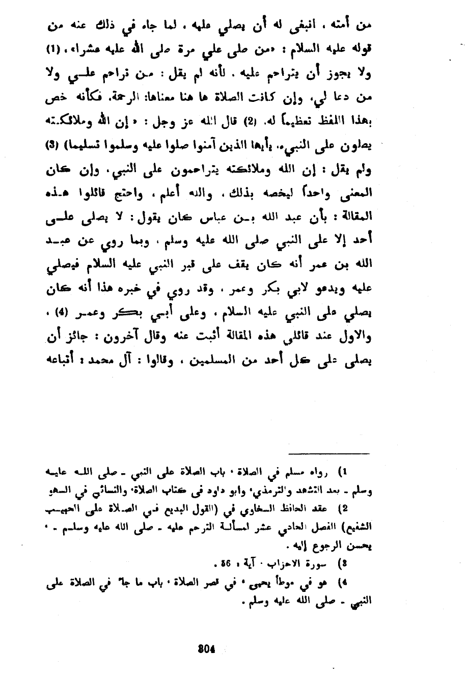 مِنْ أُمَّتِهِ انْبَغَى لَهُ أَنْ يُصَلِّيَ عَلَيْهِ لِمَا جَاءَ فِي ذَلِكَ عَنْهُ مِنْ قَوْلِهِ عَلَيْهِ السَّلَامُ مَنْ صَلَّى عَلَيَّ مَرَّةً صَلَّى اللَّهُ عَلَيْهِ عَشْرًا وَلَا يَجُوزُ أَنْ يُتَرَاحَمَ عَلَيْهِ لِأَنَّهُ لَمْ يَقُلْ مَنْ تَرَاحَمَ عَلَيَّ وَلَا مَنْ دَعَا لِي وَإِنْ كَانَتِ الصَّلَاةُ ها هنا مَعْنَاهَا الرَّحْمَةُ فَكَأَنَّهُ خُصَّ بِهَذَا اللَّفْظِ تَعْظِيمًا لَهُ قَالَ اللَّهُ عَزَّ وَجَلَّ إِنَّ اللَّهَ وملائكته يصلون على النبي يأيها الَّذِينَ آمَنُوا صَلُّوا عَلَيْهِ وَسَلِّمُوا تَسْلِيمًا وَلَمْ يَقُلْ إِنَّ اللَّهَ وَمَلَائِكَتَهُ يَتَرَاحَمُونَ عَلَى النَّبِيِّ وَإِنْ كَانَ الْمَعْنَى وَاحِدًا لِيَخُصَّهُ بِذَلِكَ وَاللَّهُ أعلم واحتج قائلوا هَذِهِ الْمَقَالَةِ بِأَنَّ عَبْدَ اللَّهِ بْنَ عَبَّاسٍ كَانَ يَقُولُ لَا يُصَلَّى عَلَى أَحَدٍ إِلَّا عَلَى النَّبِيِّ صَلَّى اللَّهُ عَلَيْهِ وَسَلَّمَ وَبِمَا رُوِيَ عَنْ عَبْدِ اللَّهِ بْنِ عُمَرَ أَنَّهُ كَانَ يَقِفُ عَلَى قَبْرِ النَّبِيِّ عَلَيْهِ السَّلَامُ فَيُصَلِّي عَلَيْهِ وَيَدْعُو لِأَبِي بَكْرٍ وَعُمَرَ وَقَدْ رُوِيَ فِي خَبَرِهِ هَذَا أَنَّهُ كَانَ يُصَلِّي عَلَى النَّبِيِّ عَلَيْهِ السَّلَامُ وَعَلَى أَبِي بَكْرٍ وَعُمَرَ وَالْأَوَّلُ عِنْدَ قَائِلِي هَذِهِ الْمَقَالَةِ أَثْبَتُ عَنْهُ وَقَالَ آخَرُونَ جَائِزٌ أَنْ يُصَلَّى عَلَى كُلِّ أَحَدٍ مِنَ الْمُسْلِمِينَ وَقَالُوا آلُ مُحَمَّدٍ أتباعه
