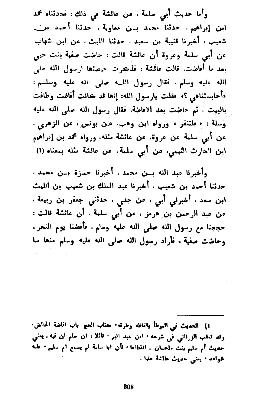 وَأَمَّا حَدِيثُ أَبِي سَلَمَةَ عَنْ عَائِشَةَ فِي ذَلِكَ فَحَدَّثَنَاهُ مُحَمَّدُ بْنُ إِبْرَاهِيمَ حَدَّثَنَا مُحَمَّدُ بْنُ مُعَاوِيَةَ حدثنا أحمد بن شعيب أَخْبَرَنَا قُتَيْبَةُ بْنُ سَعِيدٍ حَدَّثَنَا اللَّيْثُ عَنِ ابْنِ شِهَابٍ عَنْ أَبِي سَلَمَةَ وَعُرْوَةَ أَنَّ عَائِشَةَ قَالَتْ حَاضَتْ صَفِيَّةُ بِنْتُ حُيَيٍّ بَعْدَ مَا أَفَاضَتْ قَالَتْ عَائِشَةُ فَذَكَرْتُ حَيْضَتَهَا لِرَسُولِ اللَّهِ صَلَّى اللَّهُ عَلَيْهِ وَسَلَّمَ فَقَالَ رَسُولُ اللَّهِ صَلَّى اللَّهُ عَلَيْهِ وَسَلَّمَ أَحَابِسَتُنَا هِيَ فَقُلْتُ يَا رَسُولَ اللَّهِ إِنَّهَا قَدْ كَانَتْ أَفَاضَتْ وَطَافَتْ بِالْبَيْتِ ثُمَّ حَاضَتْ بَعْدَ الْإِفَاضَةِ فَقَالَ رَسُولُ اللَّهِ صَلَّى اللَّهُ عَلَيْهِ وَسَلَّمَ فَلْتَنْفِرْ وَرَوَاهُ ابْنُ وَهْبٍ عَنْ يُونُسَ عَنِ الزُّهْرِيِّ عَنْ أَبِي سَلَمَةَ عَنْ عُرْوَةَ عَنْ عَائِشَةَ مِثْلَهُ وَرَوَاهُ مُحَمَّدُ بْنُ إِبْرَاهِيمَ بْنِ الْحَارِثِ التَّيْمِيُّ عَنِ أَبِي سَلَمَةَ عَنْ عَائِشَةَ مِثْلَهُ بِمَعْنَاهُ وَأَخْبَرَنَا عَبْدُ اللَّهِ بْنُ مُحَمَّدٍ أَخْبَرَنَا حَمْزَةُ بْنُ مُحَمَّدٍ حَدَّثَنَا أَحْمَدُ بْنُ شُعَيْبٍ أَخْبَرَنَا عَبْدُ الْمَلِكِ بْنُ شُعَيْبِ بْنِ اللَّيْثِ بْنِ سَعْدٍ أَخْبَرَنِي أَبِي عَنْ جَدِّي حَدَّثَنِي جعفر بن ربيعة عن عبد الرحمن بن هُرْمُزَ عَنْ أَبِي سَلَمَةَ أَنَّ عَائِشَةَ قَالَتْ حَجَجْنَا مَعَ رَسُولِ اللَّهِ صَلَّى اللَّهُ عَلَيْهِ وَسَلَّمَ فَأَفَضْنَا يَوْمَ النَّحْرِ وَحَاضَتْ صَفِيَّةُ فَأَرَادَ رَسُولُ اللَّهِ صَلَّى اللَّهُ عَلَيْهِ وَسَلَّمَ مِنْهَا ما