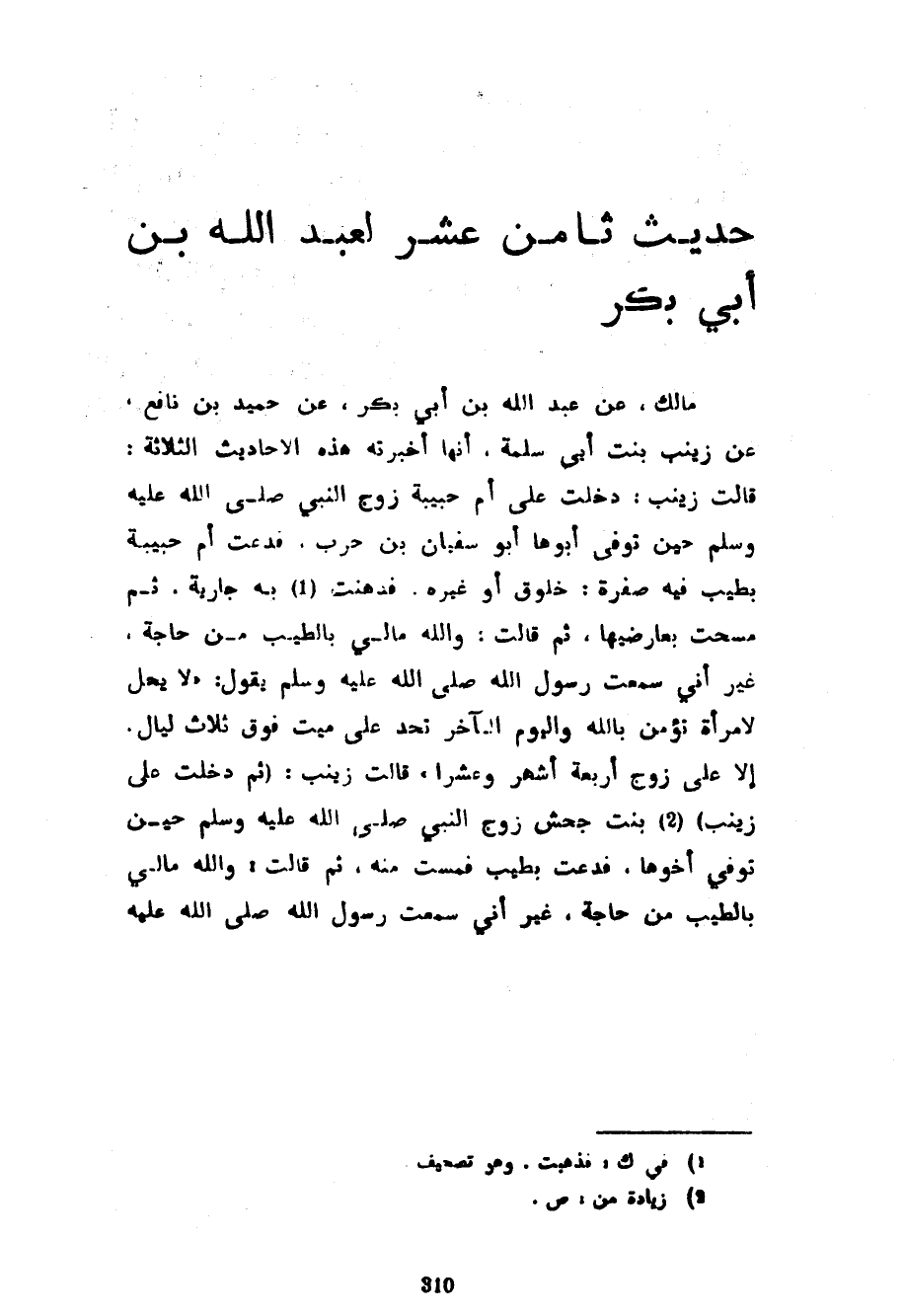 حَدِيثٌ ثَامِنَ عَشَرَ لِعَبْدِ اللَّهِ بْنِ أَبِي بَكْرٍ مَالِكٌ عَنْ عَبْدِ اللَّهِ بْنِ أَبِي بَكْرٍ عَنْ حُمَيْدِ بْنِ نَافِعٍ عَنْ زَيْنَبَ بِنْتِ أَبِي سَلَمَةَ أَنَّهَا أَخْبَرَتْهُ هَذِهِ الْأَحَادِيثَ الثَّلَاثَةَ قَالَتْ زَيْنَبُ دَخَلْتُ عَلَى أُمِّ حَبِيبَةَ زَوْجِ النَّبِيِّ صَلَّى اللَّهُ عَلَيْهِ وَسَلَّمَ حِينَ تُوُفِّيَ أَبُوهَا أَبُو سُفْيَانَ بْنُ حَرْبٍ فَدَعَتْ أُمُّ حَبِيبَةَ بِطِيبٍ فِيهِ صُفْرَةٌ خَلُوقٌ أَوْ غَيْرُهُ فَدَهَنَتْ بِهِ جَارِيَةً ثُمَّ مَسَحَتْ بِعَارِضَيْهَا ثم قالت والله مالي بِالطِّيبِ مِنْ حَاجَةٍ غَيْرَ أَنِّي سَمِعْتُ رَسُولَ اللَّهِ صَلَّى اللَّهُ عَلَيْهِ وَسَلَّمَ يَقُولُ لَا يَحِلُّ لِامْرَأَةٍ تُؤْمِنُ بِاللَّهِ وَالْيَوْمِ الْآخِرِ تَحُدَّ عَلَى مَيِّتٍ فَوْقَ ثَلَاثِ لَيَالٍ إِلَّا عَلَى زَوْجٍ أَرْبَعَةَ أَشْهُرٍ وَعَشْرًا قَالَتْ زَيْنَبُ (ثُمَّ دَخَلْتُ عَلَى زَيْنَبَ) بِنْتِ جَحْشٍ زَوْجِ النَّبِيِّ صَلَّى اللَّهُ عَلَيْهِ وَسَلَّمَ حِينَ تُوُفِّيَ أَخُوهَا فَدَعَتْ بِطِيبٍ فَمَسَّتْ مِنْهُ ثُمَّ قَالَتْ وَاللَّهِ مالي بِالطِّيبِ مِنْ حَاجَةٍ غَيْرَ أَنِّي سَمِعْتُ رَسُولَ اله صَلَّى اللَّهُ عَلَيْهِ وَسَلَّمَ