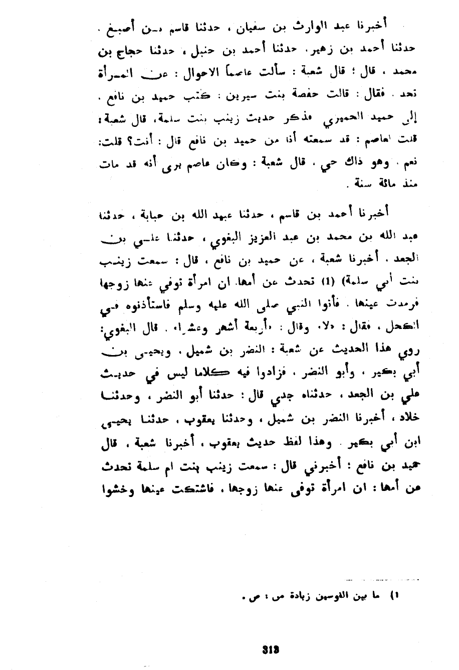 أَخْبَرَنَا عَبْدُ الْوَارِثِ بْنُ سُفْيَانَ حَدَّثَنَا قَاسِمُ بْنُ أَصْبَغَ حَدَّثَنَا أَحْمَدُ بْنُ زُهَيْرٍ حَدَّثَنَا أَحْمَدُ بْنُ حَنْبَلٍ حَدَّثَنَا حَجَّاجُ بْنُ مُحَمَّدٍ قَالَ قَالَ شُعْبَةُ سَأَلْتُ عَاصِمًا الْأَحْوَلَ عَنِ الْمَرْأَةِ تَحِدُّ فَقَالَ قَالَتْ حَفْصَةُ بِنْتُ سِيرِينَ كَتَبَ حُمَيْدُ بْنُ نَافِعٍ إِلَى حُمَيْدٍ الْحِمْيَرِيِّ فَذَكَرَ حَدِيثَ زَيْنَبَ بِنْتِ سَلَمَةَ قَالَ شُعْبَةُ قُلْتُ لِعَاصِمٍ قَدْ سَمِعْتُهُ أَنَا مِنْ حُمَيْدِ بْنِ نَافِعٍ قَالَ أَنْتَ قُلْتُ نَعَمْ وَهُوَ ذَاكَ حَيٌّ قَالَ شُعْبَةُ وَكَانَ عَاصِمٌ يَرَى أَنَّهُ قَدْ مَاتَ مُنْذُ مِائَةِ سَنَةٍ أَخْبَرَنَا أَحْمَدُ بْنُ قَاسِمٍ حَدَّثَنَا عُبَيْدُ اللَّهِ بْنُ حَبَابَةَ حَدَّثَنَا عَبْدُ اللَّهِ بْنُ مُحَمَّدِ بْنِ عَبْدِ الْعَزِيزِ الْبَغَوِيُّ حَدَّثَنَا عَلِيُّ بْنُ الْجَعْدِ أَخْبَرَنَا شُعْبَةُ عَنْ حُمَيْدِ بْنِ نَافِعٍ قَالَ سَمِعْتُ زَيْنَبَ بِنْتَ أَبِي سَلَمَةَ) تُحَدِّثُ عَنْ أُمِّهَا أَنَّ امْرَأَةً تُوُفِّيَ عَنْهَا زَوْجُهَا فَرَمِدَتْ عَيْنُهَا فَأَتَوُا النَّبِيَّ صَلَّى اللَّهُ عَلَيْهِ وَسَلَّمَ فَاسْتَأْذَنُوهُ فِي الْكُحْلِ فَقَالَ لَا وَقَالَ أَرْبَعَةَ أَشْهُرٍ وَعَشْرًا قَالَ الْبَغَوِيُّ رَوَى هَذَا الْحَدِيثَ عَنْ شُعْبَةَ النَّضْرُ بْنُ شُمَيْلٍ وَيَحْيَى بْنُ أَبِي بُكَيْرٍ وَأَبُو النَّضِرِ فَزَادُوا فِيهِ كَلَامًا لَيْسَ فِي حَدِيثِ عَلِيِّ بْنِ الْجَعْدِ حَدَّثَنَاهُ جَدِّي قَالَ حَدَّثَنَا أَبُو النَّضْرِ وَحَدَّثَنَا خَلَّادٌ أَخْبَرَنَا النَّضْرُ بْنُ شُمَيْلٍ وَحَدَّثَنَا يَعْقُوبُ حَدَّثَنَا يَحْيَى بْنُ أَبِي بُكَيْرٍ وَهَذَا لَفْظُ حَدِيثِ يَعْقُوبَ أَخْبَرَنَا شُعْبَةُ قَالَ حُمَيْدُ بْنُ نَافِعٍ أَخْبَرَنِي قَالَ سَمِعْتُ زَيْنَبَ بِنْتَ أُمِّ سَلَمَةَ تُحَدِّثُ عَنْ أُمِّهَا أَنَّ امْرَأَةً تُوُفِّيَ عَنْهَا زَوْجُهَا فَاشْتَكَتْ عَيْنَهَا وَخَشَوْا