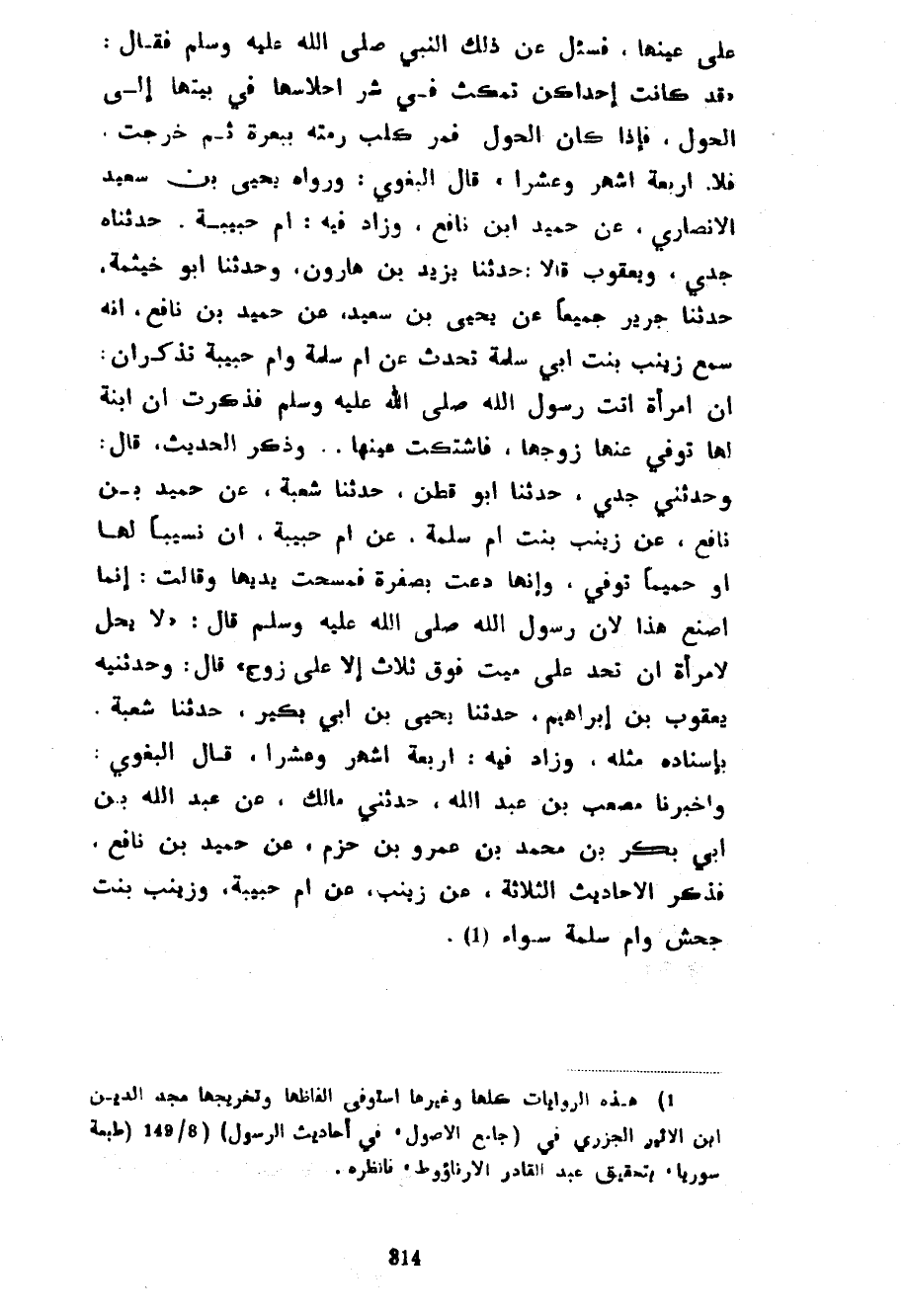 عَلَى عَيْنِهَا فَسُئِلَ عَنْ ذَلِكَ النَّبِيُّ صَلَّى اللَّهُ عَلَيْهِ وَسَلَّمَ فَقَالَ قَدْ كَانَتْ إِحْدَاكُنَّ تَمْكُثُ فِي شَرِّ أَحْلَاسِهَا فِي بَيْتِهَا إِلَى الْحَوْلِ فَإِذَا كَانَ الْحَوْلُ فَمَرَّ كَلْبٌ رَمَتْهُ بِبَعْرَةٍ ثُمَّ خَرَجَتْ فَلَا أَرْبَعَةَ أَشْهُرٍ وَعَشْرًا قَالَ الْبَغَوِيُّ وَرَوَاهُ يَحْيَى بْنُ سَعِيدٍ الْأَنْصَارِيُّ عَنْ حُمَيْدِ بْنِ نَافِعٍ وَزَادَ فِيهِ أُمَّ حَبِيبَةَ حَدَّثَنَاهُ جَدِّي وَيَعْقُوبُ قَالَا حَدَّثَنَا يَزِيدُ بْنُ هَارُونَ وَحَدَّثَنَا أَبُو خَيْثَمَةَ حَدَّثَنَا جَرِيرٌ جَمِيعًا عَنْ يَحْيَى بْنِ سَعِيدٍ عَنْ حُمَيْدِ بْنِ نَافِعٍ أَنَّهُ سَمِعَ زَيْنَبَ بِنْتَ أَبِي سَلَمَةَ تُحَدِّثُ عَنْ أُمِّ سَلَمَةَ وَأُمِّ حَبِيبَةَ تذكران أن امرأة أتت رسول اله صَلَّى اللَّهُ عَلَيْهِ وَسَلَّمَ فَذَكَرَتْ أَنَّ ابْنَةً لَهَا تُوُفِّيَ عَنْهَا زَوْجُهَا فَاشْتَكَتْ عَيْنَهَا وَذَكَرَ الْحَدِيثَ قَالَ وَحَدَّثَنِي جَدِّي حَدَّثَنَا أَبُو قَطَنٍ حَدَّثَنَا شُعْبَةُ عَنْ حُمَيْدِ بْنِ نَافِعٍ عَنْ زَيْنَبَ بِنْتِ أُمِّ سَلَمَةَ عَنْ أُمِّ حَبِيبَةَ أَنَّ نَسِيبًا لَهَا أَوْ حَمِيمًا تُوُفِّيَ وَأَنَّهَا دَعَتْ بِصُفْرَةٍ فَمَسَحَتْ يَدَيْهَا وَقَالَتْ إِنَّمَا أَصْنَعُ هَذَا لِأَنَّ رَسُولَ اللَّهِ صَلَّى اللَّهُ عَلَيْهِ وَسَلَّمَ قَالَ لَا يَحِلُّ لِامْرَأَةٍ أَنْ تَحُدَّ عَلَى مَيِّتٍ فَوْقَ ثَلَاثٍ إِلَّا عَلَى زَوْجٍ قَالَ وَحَدَّثَنِيهِ يَعْقُوبُ بْنُ إِبْرَاهِيمَ حَدَّثَنَا يَحْيَى بْنُ أَبِي بُكَيْرٍ حَدَّثَنَا شُعْبَةُ بِإِسْنَادِهِ مِثْلَهُ وَزَادَ فِيهِ أَرْبَعَةَ أَشْهُرٍ وَعَشْرًا قَالَ الْبَغَوِيُّ وَأَخْبَرَنَا مُصْعَبُ بْنُ عَبْدِ اللَّهِ حَدَّثَنِي مَالِكٌ عَنْ عَبْدِ اللَّهِ بْنِ أَبِي بَكْرٍ بْنِ مُحَمَّدِ بْنِ عَمْرِو بْنِ حَزْمٍ عَنْ حُمَيْدِ بْنِ نَافِعٍ فَذَكَرَ الْأَحَادِيثَ الثَّلَاثَةَ عَنْ زَيْنَبَ عَنْ أُمِّ حَبِيبَةَ وَزَيْنَبَ بِنْتِ جَحْشٍ وَأُمِّ سلمة سواء