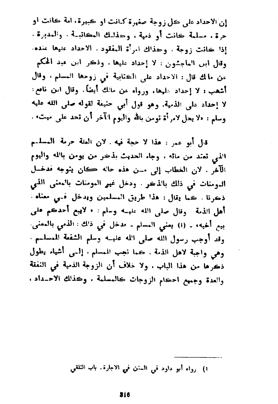 إِنَّ الْإِحْدَادَ عَلَى كُلِّ زَوْجَةٍ صَغِيرَةً كَانَتْ أَوْ كَبِيرَةً أَمَةً كَانَتْ أَوْ حُرَّةً مُسْلِمَةً كَانَتْ أَوْ ذِمِّيَّةً وَكَذَلِكَ الْمُكَاتِبَةُ وَالْمُدَبَّرَةُ إِذَا كَانَتْ زَوْجَةً وَكَذَلِكَ امْرَأَةُ الْمَفْقُودِ الْإِحْدَادُ عَلَيْهَا عِنْدَهُ وَقَالَ ابْنُ الْمَاجِشُونِ لَا إِحْدَادَ عَلَيْهَا وَذَكَرَ ابْنُ عَبْدِ الْحَكَمِ عَنْ مَالِكٍ قَالَ الْإِحْدَادُ عَلَى الْكِتَابِيَّةِ فِي زَوْجِهَا الْمُسْلِمِ وَقَالَ أَشْهَبُ لَا إِحْدَادَ عَلَيْهَا وَرَوَاهُ عَنْ مَالِكٍ أَيْضًا وَقَالَ ابْنُ نَافِعٍ لَا إِحْدَادَ عَلَى الذِّمِّيَّةِ وَهُوَ قَوْلُ أَبِي حَنِيفَةَ لِقَوْلِهِ صَلَّى اللَّهُ عَلَيْهِ وَسَلَّمَ لَا يَحِلُّ لِامْرَأَةٍ تُؤْمِنُ بِاللَّهِ وَالْيَوْمِ الْآخِرِ أَنْ تَحُدَّ عَلَى مَيِّتٍ قَالَ أَبُو عُمَرَ هَذَا لَا حُجَّةَ فِيهِ لِأَنَّ الْعِلَّةَ حُرْمَةُ الْمُسْلِمِ الَّذِي تَعْتَدُّ مِنْ مَائِهِ وَجَاءَ الْحَدِيثُ بِذِكْرِ مَنْ يُؤْمِنُ بِاللَّهِ وَالْيَوْمِ الْآخِرِ لِأَنَّ الْخِطَابَ إِلَى مَنْ هَذِهِ حَالُهُ كَانَ يَتَوَجَّهُ فَدَخَلَ الْمُؤْمِنَاتُ فِي ذَلِكَ بِالذِّكْرِ وَدَخَلَ غَيْرُ الْمُؤْمِنَاتِ بِالْمَعْنَى الَّذِي ذَكَرْنَا كَمَا يُقَالُ هَذَا طَرِيقُ الْمُسْلِمِينَ وَيَدْخُلُ فِي مَعْنَاهُ أَهْلُ الذِّمَّةِ وَقَالَ صَلَّى اللَّهُ عَلَيْهِ وَسَلَّمَ لَا يَبِعْ أَحَدُكُمْ عَلَى بَيْعِ أَخِيهِ يَعْنِي الْمُسْلِمَ فَدَخَلَ فِي ذَلِكَ الذِّمِّيُّ بِالْمَعْنَى وَقَدْ أَوْجَبَ رَسُولُ اللَّهِ صَلَّى اللَّهُ عَلَيْهِ وَسَلَّمَ الشُّفْعَةَ لِلْمُسْلِمِ وَهِيَ وَاجِبَةٌ لِأَهْلِ الذِّمَّةِ كَمَا تَجِبُ لِلْمُسْلِمِ إِلَى أَشْيَاءَ يَطُولُ ذِكْرُهَا مِنْ هَذَا الْبَابِ وَلَا خِلَافَ أَنَّ الزَّوْجَةَ الذِّمِّيَّةَ فِي النَّفَقَةِ وَالْعِدَّةِ وَجَمِيعِ أَحْكَامِ الزَّوْجَاتِ كَالْمُسْلِمَةِ وَكَذَلِكَ الْإِحْدَادُ