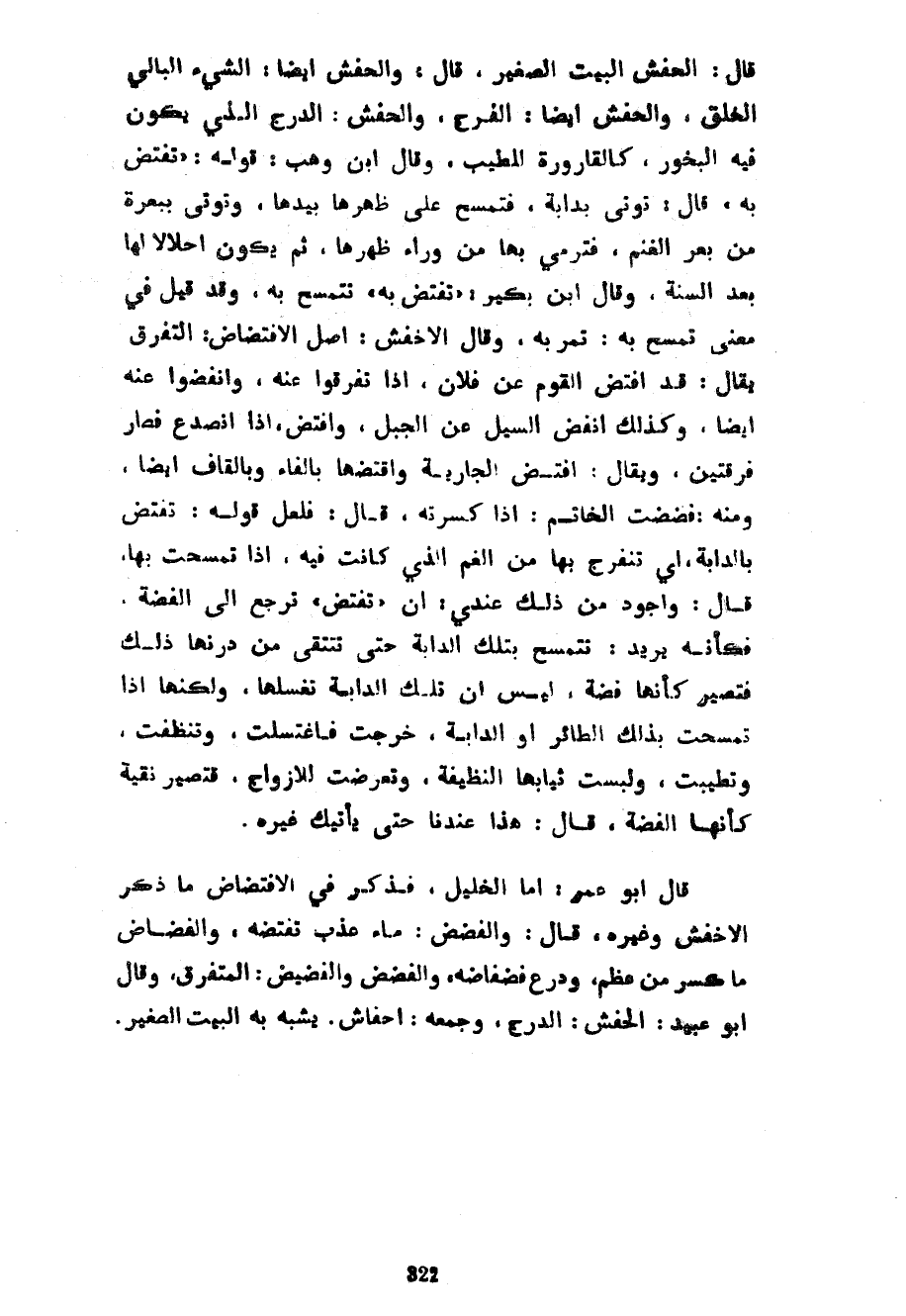 قَالَ الْحِفْشُ الْبَيْتُ الصَّغِيرُ قَالَ وَالْحِفْشُ أَيْضًا الشَّيْءُ الْبَالِي الْخَلَقُ وَالْحِفْشُ أَيْضًا الْفَرْجُ وَالْحِفْشُ الدُّرْجُ الَّذِي يَكُونُ فِيهِ الْبَخُورُ كَالْقَارُورَةِ لِلطِّيبِ وَقَالَ ابْنُ وَهْبٍ قَوْلُهُ تَفْتَضُّ بِهِ قَالَ تُؤْتَى بِدَابَّةٍ فَتَمْسَحُ عَلَى ظَهْرِهَا بِيَدِهَا وَتُؤْتَى بِبَعْرَةٍ مِنْ بَعْرِ الْغَنَمِ فَتَرْمِي بِهَا مِنْ وَرَاءِ ظَهْرِهَا ثُمَّ يَكُونُ إِحْلَالًا لَهَا بَعْدَ السَّنَةِ وَقَالَ ابْنُ بُكَيْرٍ تَفْتَضُّ بِهِ تَتَمَسَّحُ بِهِ وَقَدْ قِيلَ فِي مَعْنَى تَمْسَحُ بِهِ تَمُرُّ بِهِ وَقَالَ الْأَخْفَشُ أَصْلُ الِافْتِضَاضِ التَّفَرُّقُ يُقَالُ قَدِ افْتَضَّ الْقَوْمُ عَنْ فُلَانٍ إِذَا تَفَرَّقُوا عَنْهُ وَانْفَضُّوا عَنْهُ أَيْضًا وَكَذَلِكَ انْفَضَّ السَّيْلُ عَنِ الْجَبَلِ وَافْتَضَّ إِذَا انْصَدَعَ فَصَارَ فِرْقَتَيْنِ وَيُقَالُ افْتَضَّ الْجَارِيَةَ وَاقْتَضَّهَا بِالْفَاءِ وَبِالْقَافِ أَيْضًا وَمِنْهُ فَضَضْتُ الْخَاتَمَ إِذَا كَسَرْتُهُ قَالَ فَلَعَلَّ قَوْلَهُ تَفْتَضُّ بِالدَّابَّةِ أَيْ تَنْفَرِجُ بِهَا مِنَ الْغَمِّ الَّذِي كَانَتْ فِيهِ إِذَا تَمَسَّحَتْ بِهَا قَالَ وَأَجْوَدُ مِنْ ذَلِكَ عِنْدِي أَنَّ تَفْتَضُّ تَرْجِعُ إِلَى الْفِضَّةِ فَكَأَنَّهُ يُرِيدُ تَتَمَسَّحُ بتلك الدابة حتى تتنقى مِنْ دَرَنِهَا ذَلِكَ فَتَصِيرَ كَأَنَّهَا فِضَّةٌ لَيْسَ أَنَّ تِلْكَ الدَّابَّةَ تَغْسِلُهَا وَلَكِنَّهَا إِذَا تَمَسَّحَتْ بِذَلِكَ الطَّائِرِ أَوِ الدَّابَّةِ خَرَجَتْ فَاغْتَسَلَتْ وَتَنَظَّفَتْ وَتَطَيَّبَتْ وَلَبِسَتْ ثِيَابَهَا النَّظِيفَةَ وَتَعَرَّضَتْ لِلْأَزْوَاجِ فَتَصِيرُ نَقِيَّةً كَأَنَّهَا الْفِضَّةُ قَالَ هَذَا عِنْدَنَا حَتَّى يَأْتِيَكَ غَيْرُهُ قَالَ أَبُو عُمَرَ أَمَّا الْخَلِيلُ فَذَكَرَ فِي الِافْتِضَاضِ مَا ذَكَرَ الْأَخْفَشُ وَغَيْرُهُ قَالَ وَالْفَضَضُ مَاءٌ عَذْبٌ تَفْتَضُّهُ وَالْفُضَاضُ مَا كُسِرَ مِنْ عَظْمٍ وَدِرْعٌ فَضْفَاضَةٌ وَالْفَضَضُ وَالْفَضِيضُ الْمُتَفَرِّقُ وَقَالَ أَبُو عُبَيْدٍ الْحِفْشُ الدُّرْجُ وَجَمْعُهُ أَحْفَاشٌ يُشَبَّهُ بِهِ الْبَيْتُ الصَّغِيرُ