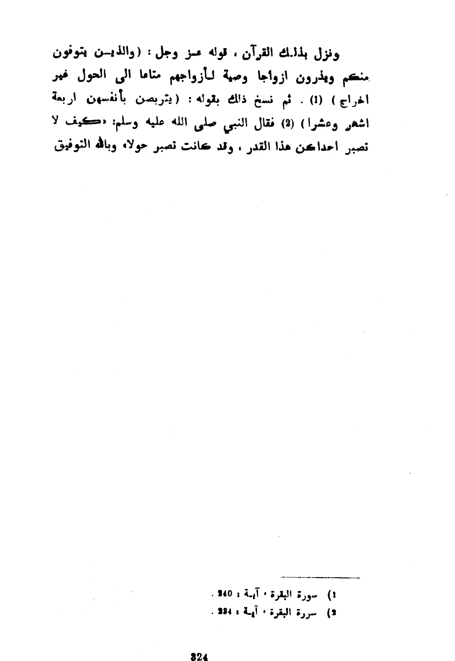 وَنَزَلَ بِذَلِكَ الْقُرْآنُ قَوْلِهِ عَزَّ وَجَلَّ وَالَّذِينَ يُتَوَفَّوْنَ مِنْكُمْ وَيَذَرُونَ أَزْوَاجًا وَصِيَّةً لِأَزْوَاجِهِمْ مَتَاعًا إِلَى الْحَوْلِ غَيْرَ إِخْرَاجٍ ثُمَّ نُسِخَ ذَلِكَ بِقَوْلِهِ يَتَرَبَّصْنَ بِأَنْفُسِهِنَّ أَرْبَعَةَ أَشْهُرٍ وَعَشْرًا فَقَالَ النَّبِيُّ صَلَّى اللَّهُ عَلَيْهِ وَسَلَّمَ كَيْفَ لَا تَصْبِرُ إِحْدَاكُنَّ هَذَا الْقَدْرَ وَقَدْ كَانَتْ تَصْبِرُ حَوْلًا وَبِاللَّهِ التَّوْفِيقُ