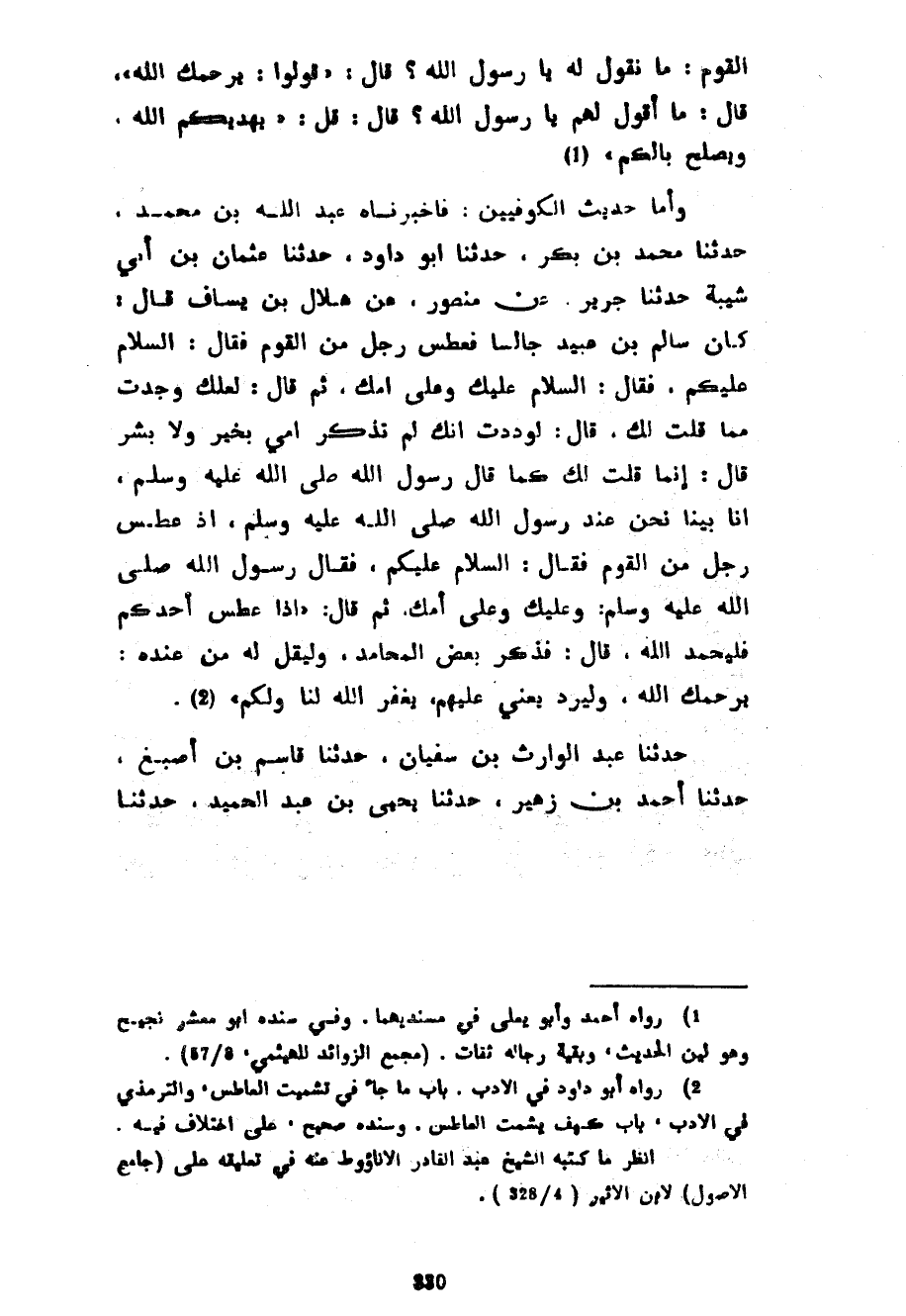 الْقَوْمُ مَا نَقُولُ لَهُ يَا رَسُولَ اللَّهِ قَالَ قُولُوا يَرْحَمُكَ اللَّهُ قَالَ مَا أَقُولُ لَهُمْ يَا رَسُولَ اللَّهِ قَالَ قُلْ يَهْدِيكُمُ اللَّهُ وَيُصْلِحُ بَالَكُمْ وَأَمَّا حَدِيثُ الْكُوفِيِّينَ فَأَخْبَرَنَاهُ عَبْدُ اللَّهِ بْنُ مُحَمَّدٍ حَدَّثَنَا مُحَمَّدُ بْنُ بَكْرٍ حَدَّثَنَا أَبُو دَاوُدَ حَدَّثَنَا عُثْمَانُ بْنُ أَبِي شَيْبَةَ حَدَّثَنَا جَرِيرٌ عَنْ مَنْصُورٍ عَنْ هِلَالِ بْنِ يَسَافٍ قَالَ كَانَ سَالِمُ بْنُ عُبَيْدٍ جَالِسًا فَعَطَسَ رَجُلٌ مِنَ الْقَوْمِ فَقَالَ السَّلَامُ عَلَيْكُمْ فَقَالَ السَّلَامُ عَلَيْكَ وَعَلَى أُمِّكَ ثُمَّ قَالَ لَعَلَّكَ وَجَدْتَ مِمَّا قُلْتُ لَكَ قَالَ لَوَدِدْتُ أَنَّكَ لَمْ تَذْكُرْ أُمِّي بِخَيْرٍ وَلَا بِشَرٍّ قَالَ إِنَّمَا قُلْتُ لَكَ كَمَا قَالَ رَسُولُ اللَّهِ صَلَّى اللَّهُ عَلَيْهِ وَسَلَّمَ إِنَّا بَيْنَا نَحْنُ عِنْدَ رَسُولِ اللَّهِ صَلَّى اللَّهُ عَلَيْهِ وَسَلَّمَ إِذْ عَطَسَ رَجُلٌ مِنَ الْقَوْمِ فَقَالَ السَّلَامُ عَلَيْكُمْ فَقَالَ رَسُولُ اللَّهِ صَلَّى اللَّهُ عَلَيْهِ وَسَلَّمَ وَعَلَيْكَ وَعَلَى أُمِّكَ ثُمَّ قَالَ إِذَا عَطَسَ أَحَدُكُمْ فَلْيَحْمَدِ اللَّهَ قَالَ فَذَكَرَ بَعْضَ الْمَحَامِدِ وَلْيَقُلْ لَهُ مَنْ عِنْدَهُ يَرْحَمُكَ اللَّهُ وَلْيَرُدَّ يَعْنِي عَلَيْهِمْ يَغْفِرُ اللَّهُ لَنَا وَلَكُمْ حَدَّثَنَا عَبْدُ الْوَارِثِ بْنُ سُفْيَانَ حَدَّثَنَا قَاسِمُ بْنُ أَصْبَغَ حَدَّثَنَا أَحْمَدُ بْنُ زُهَيْرٍ حَدَّثَنَا يَحْيَى بْنُ عَبْدِ الْحَمِيدِ حدثنا