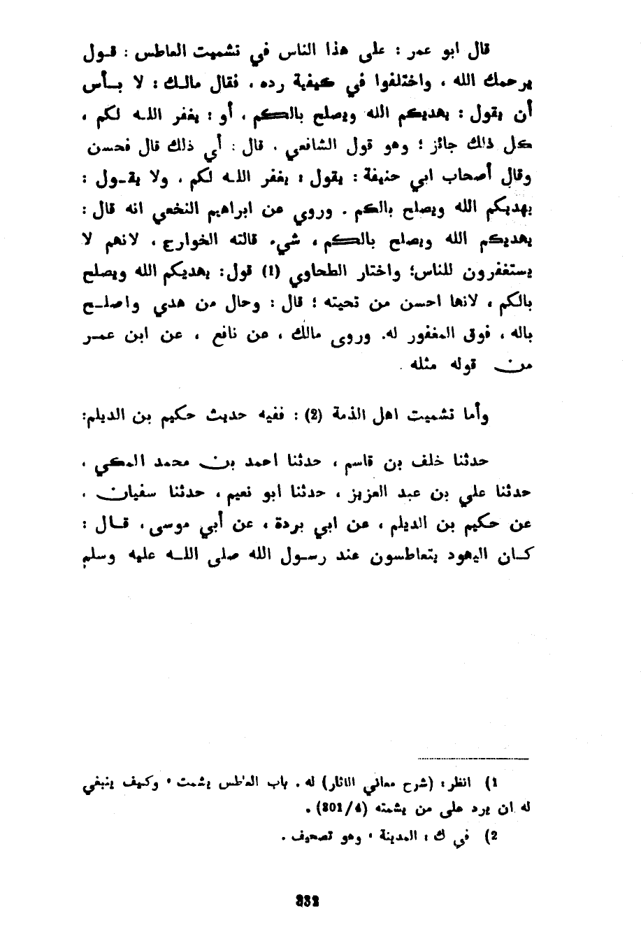 قَالَ أَبُو عُمَرَ عَلَى هَذَا النَّاسُ فِي تَشْمِيتِ الْعَاطِسِ قَوْلُ يَرْحَمُكَ اللَّهُ وَاخْتَلَفُوا فِي كَيْفِيَّةِ رَدِّهِ فَقَالَ مَالِكٌ لَا بَأْسَ أَنْ يَقُولَ يَهْدِيكُمُ اللَّهُ وَيُصْلِحُ بَالَكُمْ أَوْ يَغْفِرُ اللَّهُ لَكُمْ كُلُّ ذَلِكَ جَائِزٌ وَهُوَ قَوْلُ الشَّافِعِيِّ قَالَ أَيُّ ذَلِكَ قَالَ فَحَسُنٌ وَقَالَ أَصْحَابُ أَبِي حَنِيفَةَ يَقُولُ يَغْفِرُ اللَّهُ لَكُمْ وَلَا يَقُولُ يَهْدِيكُمُ اللَّهُ وَيُصْلِحُ بَالَكُمْ وَرُوِيَ عَنْ إِبْرَاهِيمَ النَّخَعِيِّ أَنَّهُ قَالَ يَهْدِيكُمُ اللَّهُ وَيُصْلِحُ بَالَكُمْ شَيْءٌ قَالَتْهُ الْخَوَارِجُ لِأَنَّهُمْ لَا يَسْتَغْفِرُونَ لِلنَّاسِ وَاخْتَارَ الطَّحَاوِيُّ قَوْلَ يَهْدِيكُمُ اللَّهُ وَيُصْلِحُ بَالَكُمْ لِأَنَّهَا أَحْسَنُ مِنْ تَحِيَّتِهِ قَالَ وَحَالُ مَنْ هُدِيَ وَأُصْلِحَ بَالُهُ فَوْقَ الْمَغْفُورِ لَهُ وَرَوَى مَالِكٌ عَنْ نَافِعٍ عَنِ ابْنِ عُمَرَ مِنْ قَوْلِهِ مِثْلَهُ وَأَمَّا تَشْمِيتُ أَهْلِ الذِّمَّةِ فَفِيهِ حَدِيثُ حَكِيمِ بْنِ الدَّيْلَمِ حَدَّثَنَا خَلَفُ بْنُ قَاسِمٍ حَدَّثَنَا أَحْمَدُ بْنُ مُحَمَّدِ الْمَكِّيُّ حَدَّثَنَا عَلِيُّ بْنُ عَبْدِ الْعَزِيزِ حَدَّثَنَا أَبُو نُعَيْمٍ حَدَّثَنَا سُفْيَانُ عَنْ حَكِيمِ بْنِ الدَّيْلَمِ عَنْ أَبِي بُرْدَةَ عَنْ أَبِي مُوسَى قَالَ كَانَ الْيَهُودُ يَتَعَاطَسُونَ عِنْدَ رَسُولِ اللَّهِ صَلَّى اللَّهُ عَلَيْهِ وَسَلَّمَ