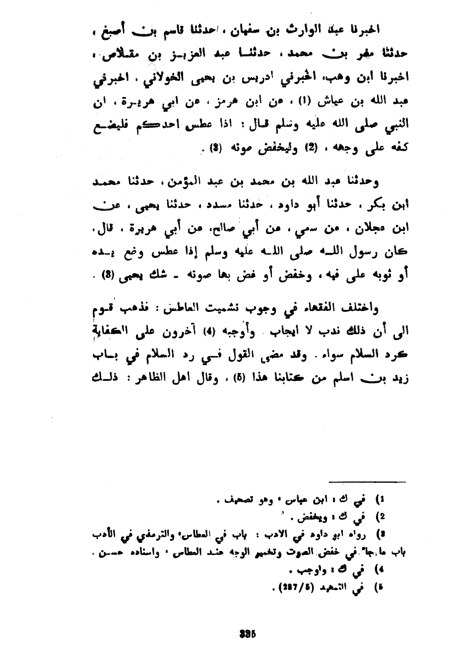 أَخْبَرَنَا عَبْدُ الْوَارِثِ بْنُ سُفْيَانَ حَدَّثَنَا قَاسِمُ بْنُ أَصْبَغَ حَدَّثَنَا مُضَرُ بْنُ مُحَمَّدٍ حَدَّثَنَا عَبْدُ الْعَزِيزِ بْنُ مِقْلَاصٍ أَخْبَرَنَا ابْنُ وَهْبٍ أَخْبَرَنِي إِدْرِيسُ بْنُ يَحْيَى الْخَوْلَانِيُّ أَخْبَرَنِي عَبْدُ اللَّهِ بْنُ عَيَّاشٍ عَنِ ابْنِ هُرْمُزَ عَنْ أَبِي هُرَيْرَةَ أَنَّ النَّبِيَّ صَلَّى اللَّهُ عَلَيْهِ وَسَلَّمَ قَالَ إِذَا عَطَسَ أَحَدُكُمْ فَلْيَضَعْ كَفَّهُ عَلَى وَجْهِهِ وَلْيَخْفِضْ صَوْتَهُ وَحَدَّثَنَا عَبْدُ اللَّهِ بْنُ مُحَمَّدِ بْنِ عَبْدِ الْمُؤْمِنِ حَدَّثَنَا مُحَمَّدُ بْنُ بَكْرٍ حَدَّثَنَا أَبُو دَاوُدَ حَدَّثَنَا مُسَدَّدٌ حَدَّثَنَا يَحْيَى عَنِ ابْنِ عَجْلَانَ عَنْ سُمَيٍّ عَنْ أَبِي صَالِحٍ عَنْ أَبِي هُرَيْرَةَ قَالَ كَانَ رَسُولُ اللَّهِ صَلَّى اللَّهُ عَلَيْهِ وَسَلَّمَ إِذَا عَطَسَ وَضَعَ يَدَهُ أَوْ ثَوْبَهُ عَلَى فِيهِ وَخَفَضَ أَوْ غَضَّ بِهَا صَوْتَهُ شَكَّ يَحْيَى وَاخْتَلَفَ الْفُقَهَاءُ فِي وُجُوبِ تَشْمِيتِ الْعَاطِسِ فَذَهَبَ قَوْمٌ إِلَى أَنَّ ذَلِكَ نَدْبٌ لَا إِيجَابٌ وَأَوْجَبَهُ آخَرُونَ عَلَى الْكِفَايَةِ كَرَدِّ السَّلَامِ سَوَاءً وَقَدْ مَضَى الْقَوْلُ فِي رَدِّ السَّلَامِ فِي بَابِ زَيْدِ بْنِ أَسْلَمَ مِنْ كِتَابِنَا هَذَا وَقَالَ أَهْلُ الظَّاهِرِ ذَلِكَ