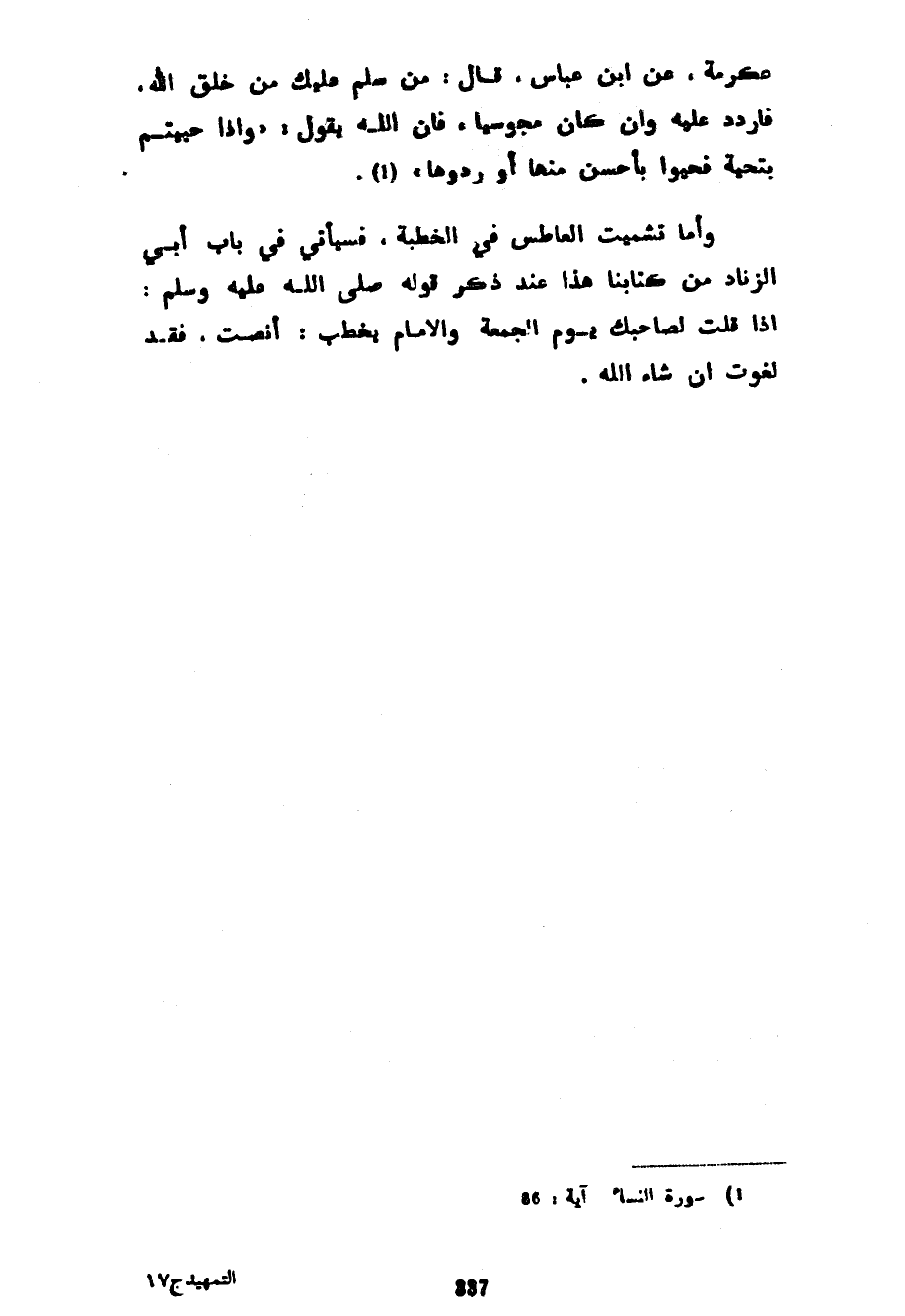عِكْرِمَةَ عَنِ ابْنِ عَبَّاسٍ قَالَ مَنْ سَلَّمَ عَلَيْكَ مِنْ خَلْقِ اللَّهِ فَارْدُدْ عَلَيْهِ وَإِنْ كَانَ مَجُوسِيًّا فَإِنَّ اللَّهَ يَقُولُ وَإِذَا حُيِّيتُمْ بِتَحِيَّةٍ فَحَيُّوا بِأَحْسَنَ مِنْهَا أَوْ رُدُّوهَا وَأَمَّا تَشْمِيتُ الْعَاطِسِ فِي الْخُطْبَةِ فَسَيَأْتِي فِي بَابِ أَبِي الزِّنَادِ مِنْ كِتَابِنَا هَذَا عِنْدَ ذِكْرِ قَوْلِهِ صَلَّى اللَّهُ عَلَيْهِ وَسَلَّمَ إِذَا قُلْتَ لِصَاحِبِكَ يَوْمَ الْجُمُعَةِ وَالْإِمَامُ يَخْطُبُ أَنْصِتْ فَقَدْ لَغَوْتَ إِنْ شَاءَ اللَّهُ