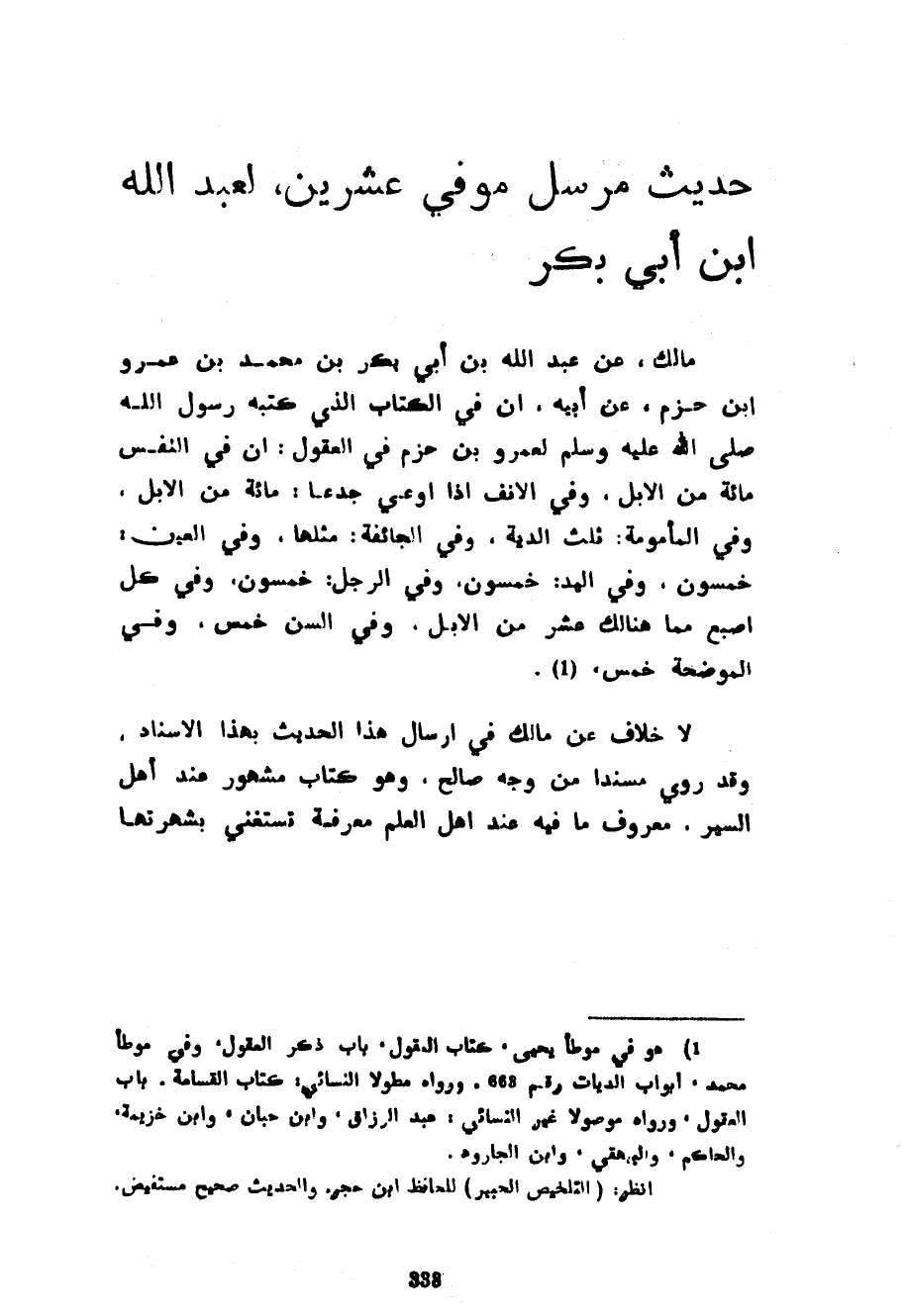 حَدِيثٌ مُرْسَلٌ مُوفِي عِشْرِينَ لِعَبْدِ اللَّهِ بْنِ أَبِي بَكْرٍ مَالِكٌ عَنْ عَبْدِ اللَّهِ بْنِ أَبِي بَكْرٍ بْنِ مُحَمَّدِ بْنِ عَمْرِو بْنِ حَزْمٍ عَنْ أَبِيهِ إِنَّ فِي الْكِتَابِ الَّذِي كَتَبَهُ رَسُولُ اللَّهِ صَلَّى اللَّهُ عَلَيْهِ وَسَلَّمَ لِعَمْرِو بْنِ حَزْمٍ فِي الْعُقُولِ إِنَّ فِي النفس مائة من الإبل وفي الأنف إذ أُوعِيَ جَدْعًا مِائَةٌ مِنَ الْإِبِلِ وَفِي الْمَأْمُومَةِ ثُلُثُ الدِّيَةِ وَفِي الْجَائِفَةِ مِثْلُهَا وَفِي الْعَيْنِ خَمْسُونَ وَفِي الْيَدِ خَمْسُونَ وَفِي الرِّجْلِ خَمْسُونَ وَفِي كُلِّ أُصْبُعٍ مِمَّا هُنَالِكَ عَشْرٌ مِنَ الْإِبِلِ وَفِي السِّنِّ خَمْسٌ وَفِي الْمُوَضِّحَةِ خَمْسٌ لَا خِلَافَ عَنْ مَالِكٍ فِي إِرْسَالِ هَذَا الْحَدِيثِ بِهَذَا الْإِسْنَادِ وَقَدْ رُوِيَ مُسْنَدًا مِنْ وَجْهٍ صَالِحٍ وَهُوَ كِتَابٌ مَشْهُورٌ عِنْدَ أَهْلِ السِّيَرِ مَعْرُوفٌ مَا فِيهِ عِنْدَ أَهْلِ الْعِلْمِ مَعْرِفَةً تَسْتَغْنِي بِشُهْرَتِهَا