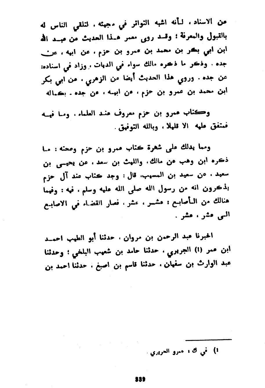 عَنِ الْإِسْنَادِ لِأَنَّهُ أَشْبَهَ التَّوَاتُرَ فِي مَجِيئِهِ لِتَلَقِّي النَّاسِ لَهُ بِالْقَبُولِ وَالْمَعْرِفَةِ وَقَدْ رَوَى مَعْمَرٌ هَذَا الْحَدِيثَ عَنْ عَبْدِ اللَّهِ بْنِ أَبِي بَكْرِ بْنِ مُحَمَّدِ بْنِ عَمْرِو بْنِ حَزْمٍ عَنْ أَبِيهِ عَنْ جَدِّهِ وَذَكَرَ مَا ذَكَرَهُ مَالِكٌ سَوَاءً فِي الدِّيَاتِ وَزَادَ فِي إِسْنَادِهِ عَنْ جَدِّهِ وَرُوِيَ هَذَا الْحَدِيثُ أَيْضًا عَنِ الزُّهْرِيِّ عَنْ أَبِي بَكْرِ بْنِ مُحَمَّدِ بْنِ عَمْرِو بْنِ حَزْمٍ عَنْ أَبِيهِ عَنْ جَدِّهِ بِكَمَالِهِ وَكِتَابُ عَمْرِو بْنِ حَزْمٍ مَعْرُوفٌ عِنْدَ الْعُلَمَاءِ وَمَا فِيهِ فَمُتَّفَقٌ عَلَيْهِ إِلَّا قَلِيلًا وَبِاللَّهِ التَّوْفِيقُ وَمِمَّا يَدُلُّكَ عَلَى شُهْرَةِ كِتَابِ عَمْرِو بْنِ حَزْمٍ وَصِحَّتِهِ مَا ذَكَرَهُ ابْنُ وَهْبٍ عَنْ مَالِكٍ وَاللَّيْثِ بْنُ سَعْدٍ عَنْ يَحْيَى بْنِ سَعِيدٍ عَنْ سَعِيدِ بْنِ الْمُسَيَّبِ قَالَ وُجِدَ كِتَابٌ عِنْدَ آلِ حَزْمٍ يَذْكُرُونَ أَنَّهُ مِنْ رَسُولِ اللَّهِ صَلَّى اللَّهُ عَلَيْهِ وَسَلَّمَ فِيهِ وَفِيمَا هُنَالِكَ مِنَ الْأَصَابِعِ عَشْرٌ عَشْرٌ فَصَارَ الْقَضَاءُ فِي الْأَصَابِعِ إِلَى عَشْرٍ عَشْرٍ أَخْبَرَنَا عَبْدُ الرَّحْمَنِ بْنُ مَرْوَانَ حَدَّثَنَا أَبُو الطَّيِّبِ أَحْمَدُ بْنُ عُمَرَ الْجُرَيْرِيُّ حدثنا حامد بن شعيب البخلي وَحَدَّثَنَا عَبْدُ الْوَارِثِ بْنُ سُفْيَانَ حَدَّثَنَا قَاسِمُ بْنُ أَصْبَغَ حَدَّثَنَا أَحْمَدُ بْنُ