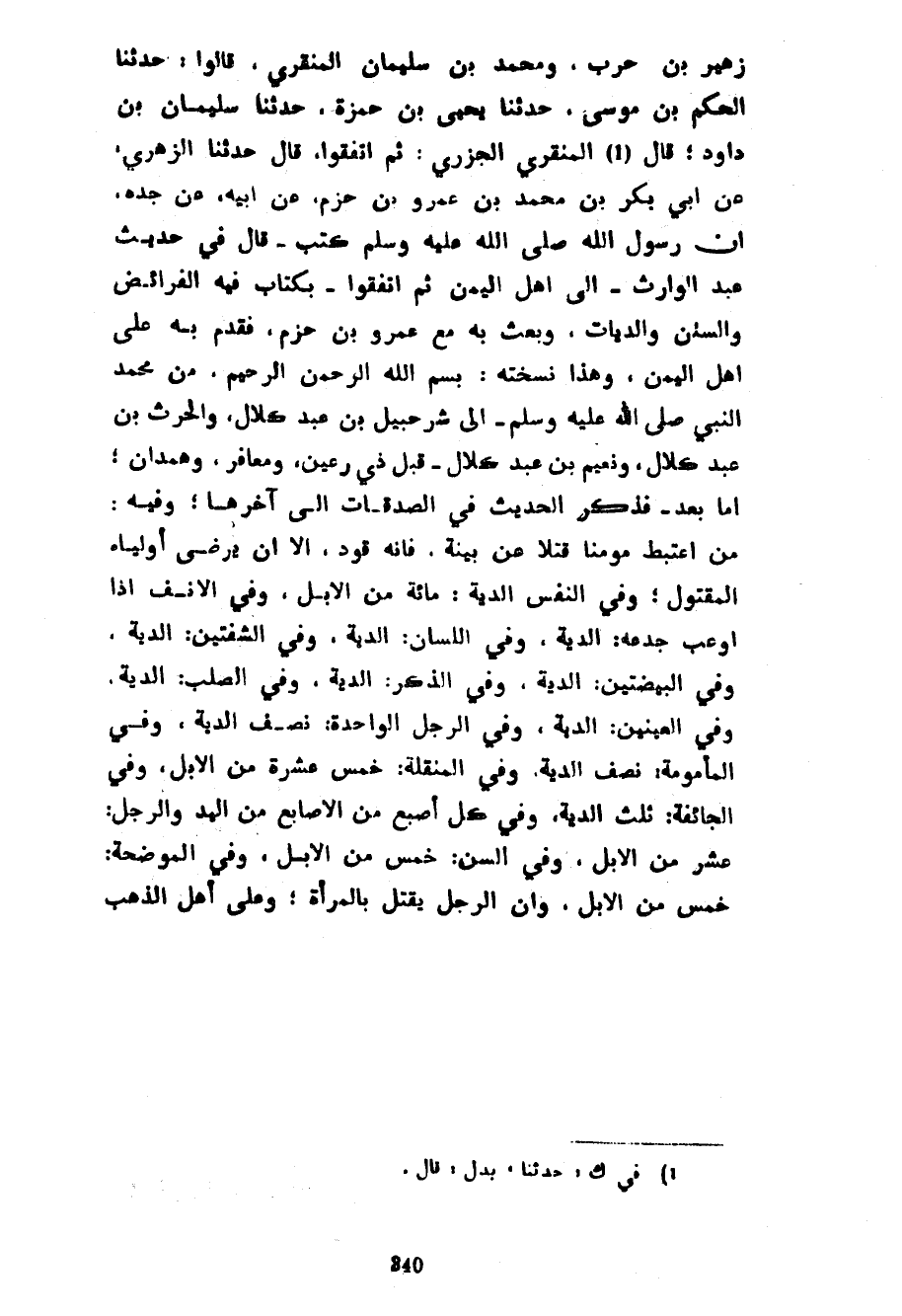 زُهَيْرِ بْنِ حَرْبٍ وَمُحَمَّدُ بْنُ سُلَيْمَانَ الْمِنْقَرِيُّ قَالُوا حَدَّثَنَا الْحَكَمُ بْنُ مُوسَى حَدَّثَنَا يَحْيَى بْنُ حَمْزَةَ حَدَّثَنَا سُلَيْمَانُ بْنُ دَاوُدَ قَالَ الْمِنْقَرِيُّ الْجَزَرِيُّ ثُمَّ اتَّفَقُوا قَالَ حَدَّثَنَا الزُّهْرِيُّ عَنْ أَبِي بَكْرِ بْنِ مُحَمَّدِ بْنِ عَمْرِو بْنِ حَزْمٍ عَنْ أَبِيهِ عَنْ جَدِّهِ أَنَّ رَسُولَ اللَّهِ صَلَّى اللَّهُ عَلَيْهِ وَسَلَّمَ كَتَبَ قَالَ فِي حَدِيثِ عَبْدِ الْوَارِثِ إِلَى أَهْلِ الْيَمَنِ ثُمَّ اتَّفَقُوا بِكِتَابٍ فِيهِ الْفَرَائِضُ وَالسُّنَنُ وَالدِّيَاتُ وَبَعَثَ بِهِ مَعَ عَمْرِو بْنِ حَزْمٍ فَقَدِمَ بِهِ عَلَى أَهْلِ الْيَمَنِ وَهَذَا نُسْخَتُهُ بِسْمِ اللَّهِ الرَّحْمَنِ الرَّحِيمِ مِنْ مُحَمَّدٍ النَّبِيِّ صَلَّى اللَّهُ عَلَيْهِ وَسَلَّمَ إِلَى شُرَحْبِيلَ بْنِ عبد كلال والحرث بْنِ عَبْدِ كُلَالٍ وَنُعَيْمِ بْنِ عَبْدِ كُلَالٍ قبل ذِي رُعَيْنٍ وَمَعَافِرَ وَهَمْدَانَ أَمَّا بَعْدُ فَذَكَرَ الْحَدِيثَ فِي الصَّدَقَاتِ إِلَى آخِرِهَا وَفِيهِ مَنِ اعْتَبَطَ مُؤْمِنًا قَتْلًا عَنْ بَيِّنَةٍ فَإِنَّهُ قَوَدٌ إِلَّا أَنْ يَرْضَى أَوْلِيَاءُ الْمَقْتُولِ وَفِي النَّفْسِ الدِّيَةُ مِائَةٌ مِنَ الْإِبِلِ وَفِي الْأَنْفِ إِذَا أُوعِبَ جَدْعُهُ الدِّيَةُ وَفِي اللِّسَانِ الدِّيَةُ وَفِي الشَّفَتَيْنِ الدِّيَةُ وَفِي الْبَيْضَتَيْنِ الدِّيَةُ وَفِي الذَّكَرِ الدِّيَةُ وَفِي الصُّلْبِ الدِّيَةُ وَفِي الْعَيْنَيْنِ الدِّيَةُ وَفِي الرِّجْلِ الْوَاحِدَةِ نِصْفُ الدِّيَةِ وَفِي الْمَأْمُومَةِ نِصْفُ الدِّيَةِ وَفِي الْمُنْقِلَةِ خَمْسَ عَشْرَةَ مِنَ الْإِبِلِ وَفِي الْجَائِفَةِ ثُلُثُ الدِّيَةِ وَفِي كُلِّ أُصْبُعٍ مِنَ الْأَصَابِعِ مِنَ الْيَدِ وَالرِّجْلِ عَشْرٌ مِنَ الْإِبِلِ وَفِي السِّنِّ خَمْسٌ مِنَ الْإِبِلِ وَفِي الْمُوضِحَةِ خَمْسٌ مِنَ الْإِبِلِ وَأَنَّ الرَّجُلَ يُقْتَلُ بِالْمَرْأَةِ وَعَلَى أَهْلِ الذَّهَبِ
