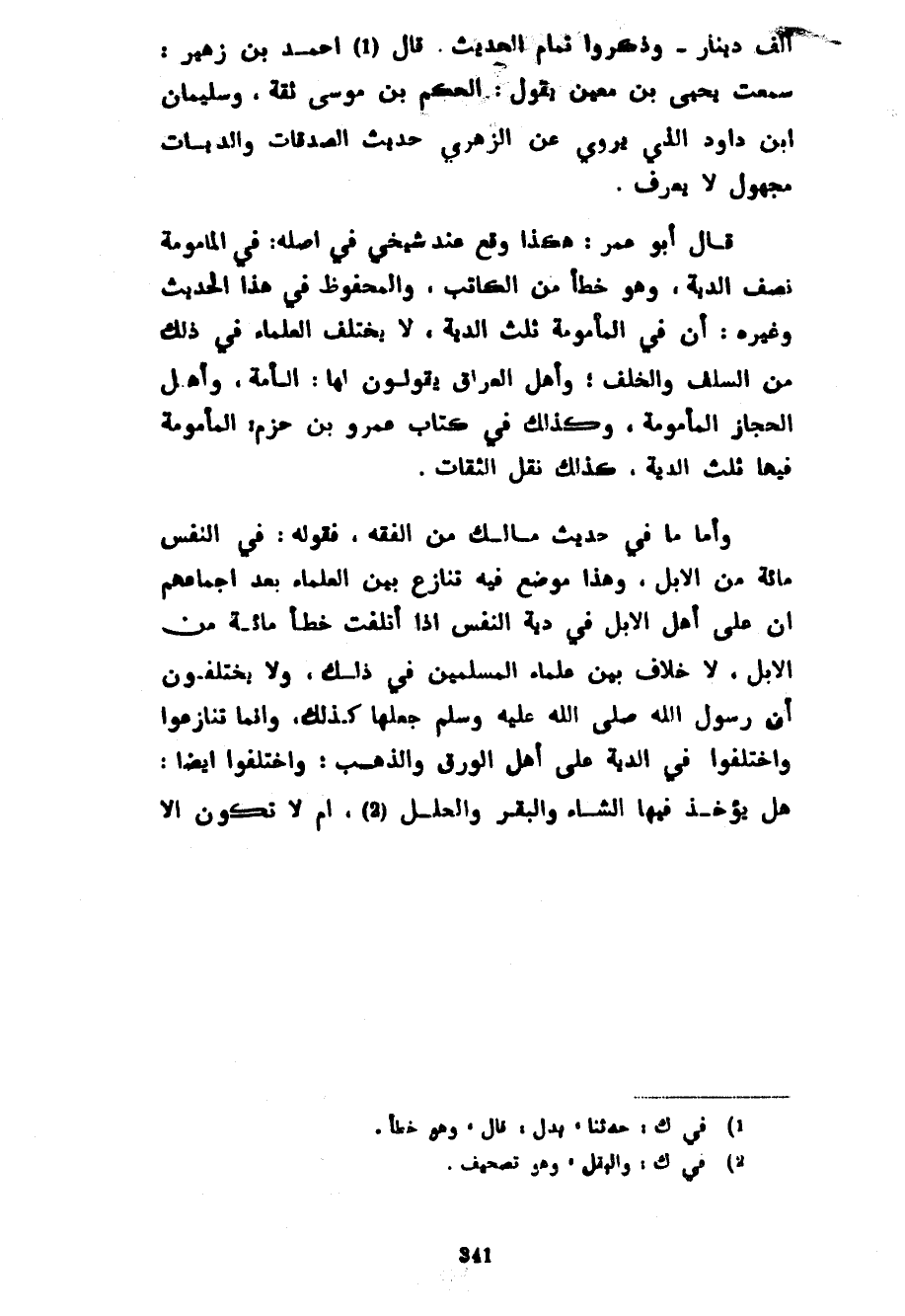 أَلْفُ دِينَارٍ وَذَكَرُوا تَمَامَ الْحَدِيثِ قَالَ أَحْمَدُ بْنُ زُهَيْرٍ سَمِعْتُ يَحْيَى بْنَ مَعِينٍ يَقُولُ الْحَكَمُ بْنُ مُوسَى ثِقَةٌ وَسُلَيْمَانُ بْنُ دَاوُدَ الَّذِي يَرْوِي عَنِ الزُّهْرِيِّ حَدِيثَ الصَّدَقَاتِ وَالدِّيَاتِ مَجْهُولٌ لَا يُعْرَفُ قَالَ أَبُو عُمَرَ هَكَذَا وَقَعَ عِنْدَ شَيْخِي فِي أَصْلِهِ فِي الْمَأْمُومَةِ نِصْفُ الدِّيَةِ وَهُوَ خَطَأٌ مِنَ الْكَاتِبِ وَالْمَحْفُوظُ فِي هَذَا الْحَدِيثِ وَغَيْرِهِ أَنَّ فِي الْمَأْمُومَةِ ثُلُثَ الدِّيَةِ لَا يَخْتَلِفُ الْعُلَمَاءُ فِي ذَلِكَ مِنَ السَّلَفِ وَالْخَلَفِ وَأَهْلُ الْعِرَاقِ يَقُولُونَ لَهَا الْآمَّةُ وَأَهْلُ الْحِجَازِ الْمَأْمُومَةُ وَكَذَلِكَ فِي كِتَابِ عَمْرِو بْنِ حَزْمٍ الْمَأْمُومَةُ فِيهَا ثُلُثُ الدِّيَةِ كَذَلِكَ نَقَلَ الثِّقَاتُ وَأَمَّا مَا فِي حَدِيثِ مَالِكٍ مِنَ الْفِقْهِ فَقَوْلُهُ فِي النَّفْسِ مِائَةٌ مِنَ الْإِبِلِ وَهَذَا مَوْضِعٌ فِيهِ تَنَازُعٌ بَيْنَ الْعُلَمَاءِ بَعْدَ إِجْمَاعِهِمْ أَنَّ عَلَى أَهْلِ الْإِبِلِ فِي دِيَةِ النَّفْسِ إِذَا أُتْلِفَتْ خَطَأً مِائَةً مِنَ الْإِبِلِ لَا خِلَافَ بَيْنَ عُلَمَاءِ الْمُسْلِمِينَ فِي ذَلِكَ وَلَا يَخْتَلِفُونَ أَنَّ رَسُولَ اللَّهِ صَلَّى اللَّهُ عَلَيْهِ وَسَلَّمَ جَعَلَهَا كَذَلِكَ وَإِنَّمَا تَنَازَعُوا وَاخْتَلَفُوا فِي الدِّيَةِ عَلَى أَهْلِ الْوَرِقِ وَالذَّهَبِ وَاخْتَلَفُوا أَيْضًا هَلْ يُؤْخَذُ فِيهَا الشَّاءُ وَالْبَقَرُ وَالْحُلَلُ أَمْ لَا تَكُونُ إِلَّا