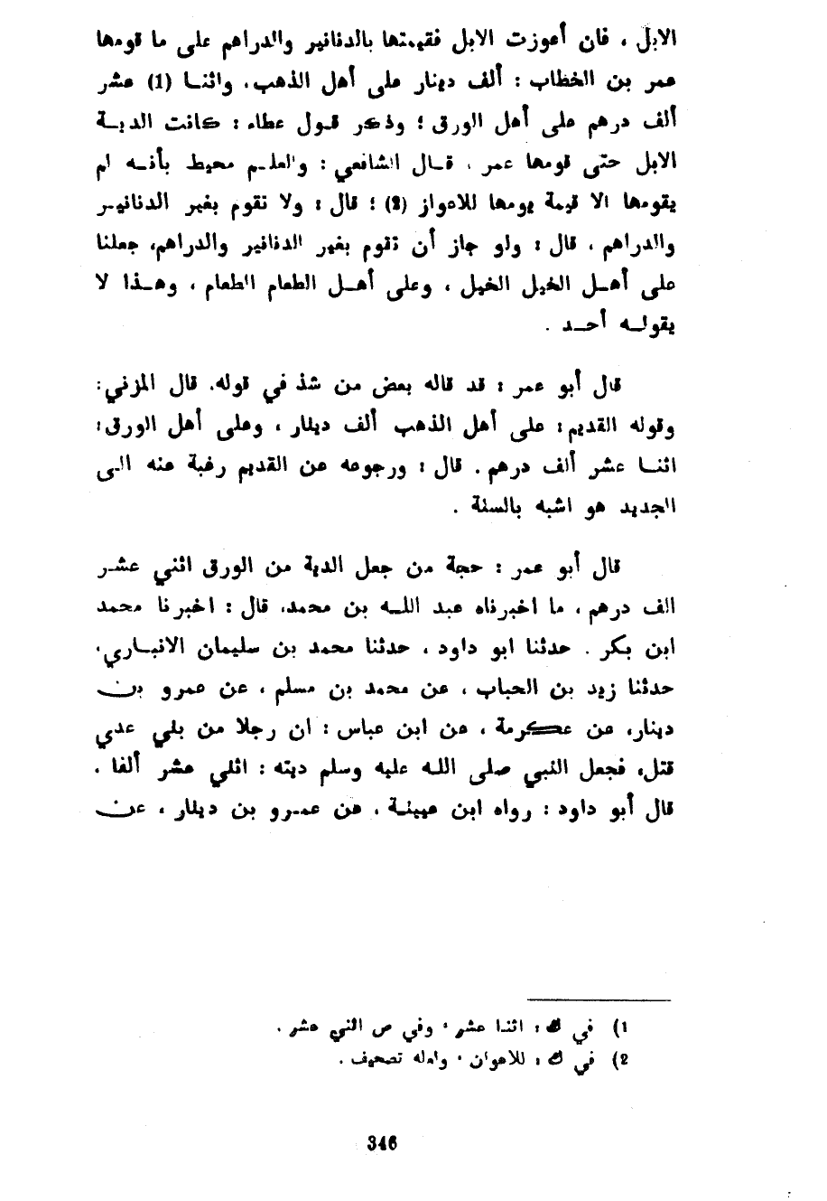 الْإِبِلُ فَإِنْ أَعْوَزَتِ الْإِبِلُ فَقِيمَتُهَا بِالدَّنَانِيرِ وَالدَّرَاهِمِ عَلَى مَا قَوَّمَهَا عُمَرُ بْنُ الْخَطَّابِ أَلْفُ دِينَارٍ عَلَى أَهْلِ الذَّهَبِ وَاثْنَا عَشَرَ أَلْفَ دِرْهَمٍ عَلَى أَهْلِ الْوَرِقِ وَذَكَرَ قَوْلَ عَطَاءٍ كَانَتِ الدِّيَةُ الْإِبِلَ حَتَّى قَوَّمَهَا عُمَرُ قَالَ الشَّافِعِيُّ وَالْعِلْمُ مُحِيطٌ بِأَنَّهُ لَمْ يُقَوِّمْهَا إِلَّا قِيمَةَ يَوْمِهَا لِلْإِعْوَازِ قَالَ وَلَا تُقَوَّمُ بِغَيْرِ الدَّنَانِيرِ وَالدَّرَاهِمِ قَالَ وَلَوْ جَازَ أَنْ تُقَوَّمَ بِغَيْرِ الدَّنَانِيرِ وَالدَّرَاهِمِ جَعَلْنَا عَلَى أَهْلِ الْخَيْلِ الْخَيْلَ وَعَلَى أَهْلِ الطَّعَامِ الطَّعَامَ وَهَذَا لَا يَقُولُهُ أَحَدٌ قَالَ أَبُو عُمَرَ قَدْ قَالَهُ بَعْضُ مَنْ شَذَّ فِي قَوْلِهِ قَالَ الْمُزَنِيُّ وَقَوْلُهُ الْقَدِيمُ عَلَى أَهْلِ الذَّهَبِ أَلْفُ دِينَارٍ وَعَلَى أَهْلِ الْوَرِقِ اثْنَا عَشَرَ أَلْفَ دِرْهَمٍ قَالَ وَرُجُوعُهُ عَنِ الْقَدِيمِ رَغْبَةً عَنْهُ إِلَى الْجَدِيدِ هُوَ أَشْبَهُ بِالسُّنَّةِ قَالَ أَبُو عُمَرَ حُجَّةُ مَنْ جَعَلَ الدِّيَةَ مِنَ الْوَرِقِ اثْنَيْ عَشَرَ أَلْفَ دِرْهَمٍ مَا أَخْبَرَنَاهُ عَبْدُ اللَّهِ بْنُ مُحَمَّدٍ قَالَ أَخْبَرَنَا مُحَمَّدُ بْنُ بَكْرٍ حَدَّثَنَا أَبُو دَاوُدَ حَدَّثَنَا مُحَمَّدُ بْنُ سُلَيْمَانَ الْأَنْبَارِيُّ حَدَّثَنَا زَيْدُ بْنُ الْحُبَابِ عَنْ مُحَمَّدُ بْنُ مُسْلِمٍ عَنْ عَمْرِو بْنِ دِينَارٍ عَنْ عِكْرِمَةَ عَنِ ابْنِ عَبَّاسٍ أَنَّ رَجُلًا مِنْ بَنِي عَدِيٍّ قُتِلَ فَجَعَلَ النَّبِيُّ صَلَّى اللَّهُ عَلَيْهِ وَسَلَّمَ دِيَتَهُ اثْنَيْ عَشَرَ أَلْفًا قَالَ أَبُو دَاوُدَ رَوَاهُ ابْنُ عُيَيْنَةَ عَنْ عَمْرِو بْنِ دِينَارٍ عَنْ