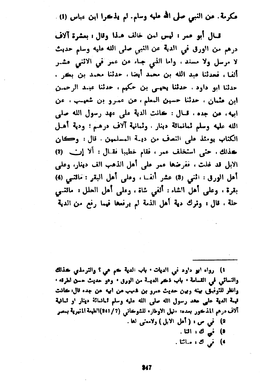 عِكْرِمَةَ عَنِ النَّبِيِّ صَلَّى اللَّهُ عَلَيْهِ وَسَلَّمَ لَمْ يَذْكُرَا ابْنَ عَبَّاسٍ قَالَ أَبُو عُمَرَ لَيْسَ لِمَنْ خَالَفَ هَذَا وَقَالَ بِعَشَرَةِ آلَافِ دِرْهَمٍ مِنَ الْوَرِقِ فِي الدِّيَةِ عَنِ النَّبِيِّ صَلَّى اللَّهُ عَلَيْهِ وَسَلَّمَ حَدِيثٌ لَا مُرْسَلٌ وَلَا مُسْنَدٌ وَأَمَّا الَّذِي جَاءَ عَنْ عُمَرَ فِي الِاثْنَيْ عَشَرَ أَلْفًا فَحَدَّثَنَا عَبْدُ اللَّهِ بْنُ مُحَمَّدٍ أَيْضًا حَدَّثَنَا مُحَمَّدُ بْنُ بَكْرٍ حَدَّثَنَا أَبُو دَاوُدَ حَدَّثَنَا يَحْيَى بْنُ حَكِيمٍ حَدَّثَنَا عَبْدُ الرَّحْمَنِ بْنُ عُثْمَانَ حَدَّثَنَا حُسَيْنٍ الْمُعَلِّمِ عَنْ عَمْرِو بْنِ شُعَيْبٍ عَنْ أَبِيهِ عَنْ جَدِّهِ قَالَ كَانَتِ الدِّيَةُ عَلَى عَهْدِ رَسُولِ اللَّهِ صَلَّى اللَّهُ عَلَيْهِ وَسَلَّمَ ثَمَانِمِائَةِ دِينَارٍ وَثَمَانِيَةَ آلَافِ دِرْهَمٍ وَدِيَةُ أَهْلِ الْكِتَابِ يَوْمَئِذٍ عَلَى النِّصْفِ مِنْ دِيَةِ الْمُسْلِمِينَ قَالَ وَكَانَ كَذَلِكَ حَتَّى اسْتُخْلِفَ عُمَرُ فَقَامَ خَطِيبًا فَقَالَ أَلَا إِنَّ الْإِبِلَ قَدْ غَلَتْ فَفَرَضَهَا عُمَرُ عَلَى أَهْلِ الذَّهَبِ أَلْفَ دِينَارٍ وَعَلَى أَهْلِ الْوَرِقِ اثْنَيْ عَشَرَ أَلْفًا وَعَلَى أَهْلِ الْبَقَرِ مِائَتَيْ بَقَرَةٍ وَعَلَى أَهْلِ الشَّاءِ أَلْفَيْ شَاةٍ وَعَلَى أَهْلِ الْحُلَلِ مِائَتَيْ حُلَّةٍ قَالَ وَتَرَكَ دِيَةَ أَهْلِ الذِّمَّةِ لَمْ يَرْفَعْهَا فِيمَا رَفَعَ مِنَ الدِّيَةِ