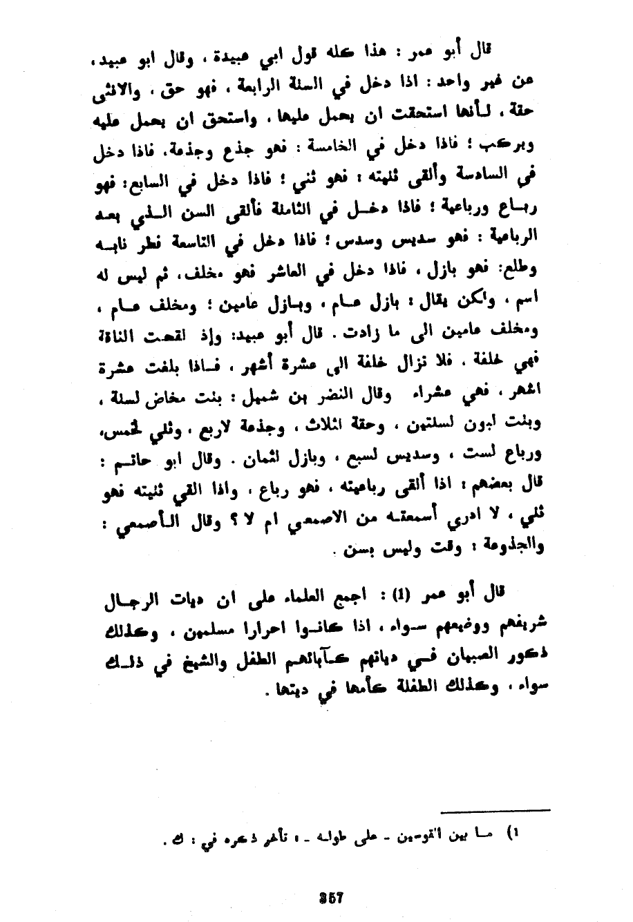 قَالَ أَبُو عُمَرَ هَذَا كُلُّهُ قَوْلُ أَبِي عُبَيْدَةَ وَقَالَ أَبُو عُبَيْدٍ عَنْ غَيْرِ وَاحِدٍ إِذَا دَخَلَ فِي السَّنَةِ الرَّابِعَةِ فَهُوَ حِقٌّ وَالْأُنْثَى حِقَّةٌ لِأَنَّهَا اسْتَحَقَّتْ أَنْ يُحْمَلَ عَلَيْهَا وَاسْتَحَقَّ أَنْ يُحْمَلَ عَلَيْهِ وَيُرْكَبَ فَإِذَا دَخَلَ فِي الْخَامِسَةِ فَهُوَ جَذَعٌ وَجَذَعَةٌ فَإِذَا دَخَلَ فِي السَّادِسَةِ وَأَلْقَى ثَنِيَّتَهُ فَهُوَ ثَنِيٌّ فَإِذَا دَخَلَ فِي السَّابِعِ فَهُوَ رَبَاعٌ وَرَبَاعِيَةٌ فَإِذَا دَخَلَ فِي الثَّامِنَةِ فَأَلْقَى السِّنَّ الَّذِي بَعْدَ الرَّبَاعِيَةِ فَهُوَ سَدِيسٌ وَسُدُسٌ فَإِذَا دَخَلَ فِي التَّاسِعَةِ فَطَرَ نَابُهُ وَطَلَعَ فَهُوَ بَازِلٌ فَإِذَا دخل في العشار فَهُوَ مُخْلِفٌ ثُمَّ لَيْسَ لَهُ اسْمٌ وَلَكِنْ يُقَالُ بَازِلُ عَامٍ وَبَازِلُ عَامَيْنِ وَمُخْلِفُ عَامٍ وَمُخْلِفُ عَامَيْنِ إِلَى مَا زَادَتْ قَالَ أَبُو عُبَيْدٍ وَإِذَا لُقِّحَتِ النَّاقَةُ فَهِيَ خَلِفَةٌ فَلَا تَزَالُ خَلِفَةً إِلَى عَشَرَةِ أَشْهُرٍ فَإِذَا بَلَغَتْ عَشَرَةَ أَشْهُرٍ فَهِيَ عُشَرَاءُ وَقَالَ النَّضْرُ بْنُ شُمَيْلٍ بِنْتُ مَخَاضٍ لِسَنَةٍ وَبِنْتُ لَبُونٍ لِسَنَتَيْنِ وَحِقَّةٌ لِثَلَاثٍ وَجَذَعَةٌ لِأَرْبَعٍ وَثَنِيٌّ لِخَمْسٍ وَرَبَاعٌ لَسْتٍ وَسَدِيسٌ لِسَبْعٍ وَبَازِلٌ لِثَمَانٍ وَقَالَ أَبُو حَاتِمٍ قَالَ بَعْضُهُمْ إِذَا أَلْقَى رَبَاعِيَتَهُ فَهُوَ رَبَاعٌ وَإِذَا أَلْقَى ثَنِيَّتَهُ فَهُوَ ثَنِيٌّ لَا أَدْرِي أَسَمِعْتُهُ مِنَ الْأَصْمَعِيِّ أَمْ لَا وَقَالَ الْأَصْمَعِيُّ وَالْجُذُوعَةُ وَقْتٌ وَلَيْسَ بِسِنٍّ قَالَ أَبُو عُمَرَ أَجْمَعَ الْعُلَمَاءُ عَلَى أَنَّ دِيَاتِ الرِّجَالِ شَرِيفِهِمْ وَوَضِيعِهِمْ سَوَاءٌ إِذَا كَانُوا أَحْرَارًا مُسْلِمِينَ وَكَذَلِكَ ذُكُورُ الصِّبْيَانِ فِي دِيَاتِهِمْ كَآبَائِهِمُ الطِّفْلُ وَالشَّيْخُ فِي ذَلِكَ سَوَاءٌ وَكَذَلِكَ الطِّفْلَةُ كَأُمِّهَا في ديتها