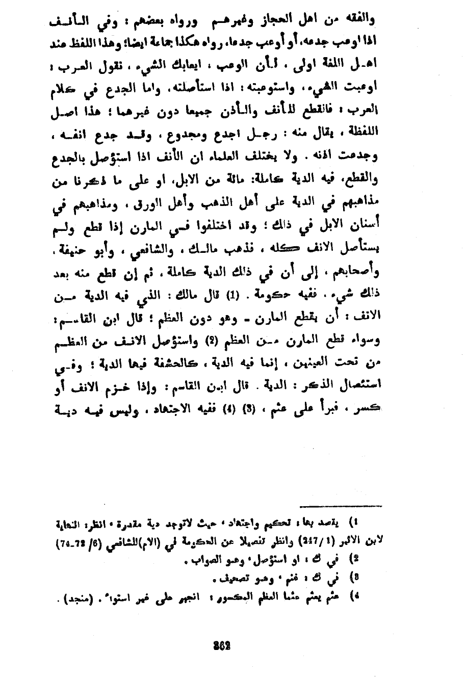 وَالْفِقْهِ مِنْ أَهْلِ الْحِجَازِ وَغَيْرِهِمْ وَرَوَاهُ بَعْضُهُمْ وفي الأنف إذا أوعب جدع أَوْ أُوعِبَ جَدْعًا رَوَاهُ هَكَذَا جَمَاعَةٌ أَيْضًا وَهَذَا اللَّفْظُ عِنْدَ أَهْلِ اللُّغَةِ أَوْلَى لِأَنَّ الْوَعْبَ إِيعَابُكَ الشَّيْءَ تَقُولُ الْعَرَبُ أَوْعَبْتُ الشَّيْءَ وَاسْتَوْعَبْتَهُ إِذَا اسْتَأْصَلْتُهُ وَأَمَّا الْجَدْعُ فِي كَلَامِ الْعَرَبِ فَالْقَطْعُ لِلْأَنْفِ وَالْأُذُنِ جَمِيعًا دُونَ غَيْرِهِمَا هَذَا أَصْلُ اللَّفْظَةِ يُقَالُ مِنْهُ رَجُلٌ أَجْدَعُ وَمَجْدُوعٌ وَقَدْ جُدِعَ أَنْفُهُ وَجُدِعَتْ أُذُنُهُ وَلَا يَخْتَلِفُ الْعُلَمَاءُ أَنَّ الْأَنْفَ إِذَا اسْتُؤْصِلَ بِالْجَدْعِ وَالْقَطْعِ فِيهِ الدِّيَةُ كَامِلَةٌ مِائَةٌ مِنَ الْإِبِلِ أَوْ عَلَى مَا ذَكَرْنَا مِنْ مَذَاهِبِهِمْ فِي الدِّيَةِ عَلَى أَهْلِ الذَّهَبِ وَأَهْلِ الْوَرِقِ وَمَذَاهِبِهِمْ فِي أَسْنَانِ الْإِبِلِ فِي ذَلِكَ وَقَدِ اخْتَلَفُوا فِي الْمَارِنِ إِذَا قُطِعَ وَلَمْ يُسْتَأْصَلِ الْأَنْفُ كُلُّهُ فَذَهَبَ مَالِكٌ وَالشَّافِعِيُّ وَأَبُو حَنِيفَةَ وَأَصْحَابُهُمْ إِلَى أَنَّ فِي ذَلِكَ الدِّيَةَ كَامِلَةً ثُمَّ إِنْ قُطِعَ مِنْهُ بَعْدَ ذَلِكَ شَيْءٌ فَفِيهِ حُكُومَةٌ قَالَ مَالِكٌ الَّذِي فِيهِ الدِّيَةُ مِنَ الْأَنْفِ أَنْ يُقْطَعَ الْمَارِنُ وَهُوَ دُونَ الْعَظْمِ قَالَ ابْنُ الْقَاسِمِ وَسَوَاءٌ قُطِعَ الْمَارِنُ مِنَ الْعَظْمِ وَاسْتُؤْصِلَ الْأَنْفُ مِنَ الْعَظْمِ مِنْ تَحْتِ الْعَيْنَيْنِ إِنَّمَا فِيهِ الدِّيَةُ كَالْحَشَفَةِ فِيهَا الدِّيَةُ وَفِي اسْتِئْصَالِ الذَّكَرِ الدِّيَةُ قَالَ ابْنُ الْقَاسِمِ وإذا خزم الأنف أو كسر فبرأ عَلَى عَثْمٍ فَفِيهِ الِاجْتِهَادُ وَلَيْسَ فِيهِ دِيَةٌ