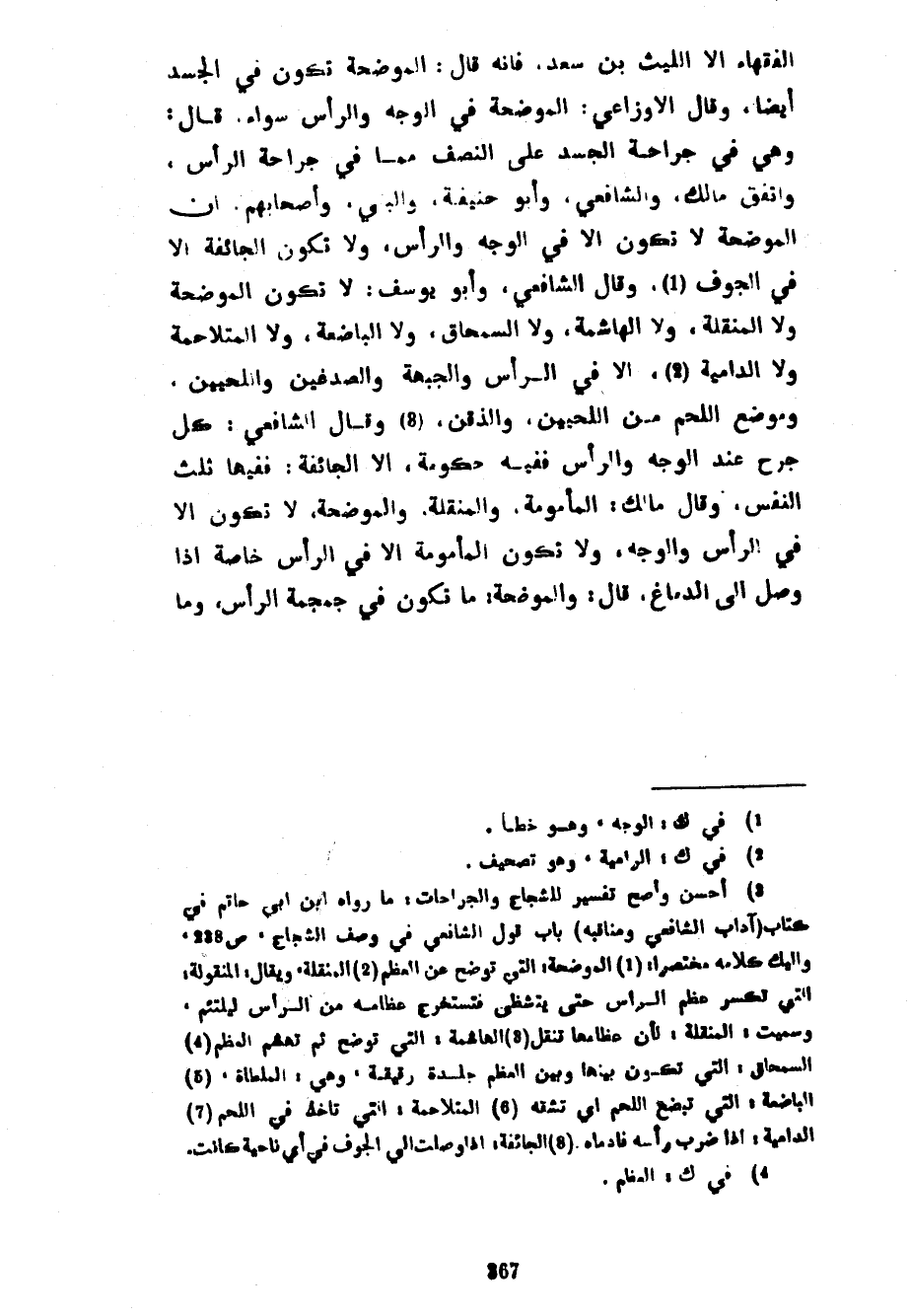 الْفُقَهَاءِ إِلَّا اللَّيْثَ بْنَ سَعْدٍ فَإِنَّهُ قَالَ الْمُوضِحَةُ تَكُونُ فِي الْجَسَدِ أَيْضًا وَقَالَ الْأَوْزَاعِيُّ الْمُوضِحَةُ فِي الْوَجْهِ وَالرَّأْسِ سَوَاءٌ قَالَ وَهِيَ فِي جِرَاحَةِ الْجَسَدِ عَلَى النِّصْفِ مِمَّا فِي جِرَاحَةِ الرَّأْسِ وَاتَّفَقَ مَالِكٌ وَالشَّافِعِيُّ وَأَبُو حَنِيفَةَ وَالْبَتِّيُّ وَأَصْحَابُهُمْ أَنَّ الْمُوضِحَةَ لَا تَكُونُ إِلَّا فِي الْوَجْهِ وَالرَّأْسِ وَلَا تَكُونُ الْجَائِفَةُ إِلَّا فِي الْجَوْفِ وَقَالَ الشَّافِعِيُّ وَأَبُو يُوسُفَ لَا تَكُونُ الْمُوضِحَةُ وَلَا الْمُنَقِّلَةُ وَلَا الْهَاشِمَةُ وَلَا السِّمْحَاقُ وَلَا الْبَاضِعَةُ وَلَا الْمُتَلَاحِمَةُ وَلَا الدَّامِيَةُ إِلَّا فِي الرَّأْسِ وَالْجَبْهَةِ وَالصُّدْغَيْنِ وَاللَّحْيَيْنِ وَمَوْضِعِ اللَّحْمِ مِنَ اللَّحْيَيْنِ وَالذَّقَنِ وَقَالَ الشَّافِعِيُّ كُلُّ جُرْحٍ عِنْدَ الْوَجْهِ وَالرَّأْسِ فَفِيهِ حُكُومَةٌ إِلَّا الْجَائِفَةَ فَفِيهَا ثُلُثُ النَّفْسِ وَقَالَ مَالِكٌ الْمَأْمُومَةُ وَالْمُنَقِّلَةُ وَالْمُوضِحَةُ لَا تَكُونُ إِلَّا فِي الرَّأْسِ وَالْوَجْهِ وَلَا تَكُونُ الْمَأْمُومَةُ إِلَّا فِي الرَّأْسِ خَاصَّةً إِذَا وَصَلَ إِلَى الدِّمَاغِ قَالَ وَالْمُوضِحَةُ مَا تَكُونُ فِي جُمْجُمَةِ الرَّأْسِ وَمَا