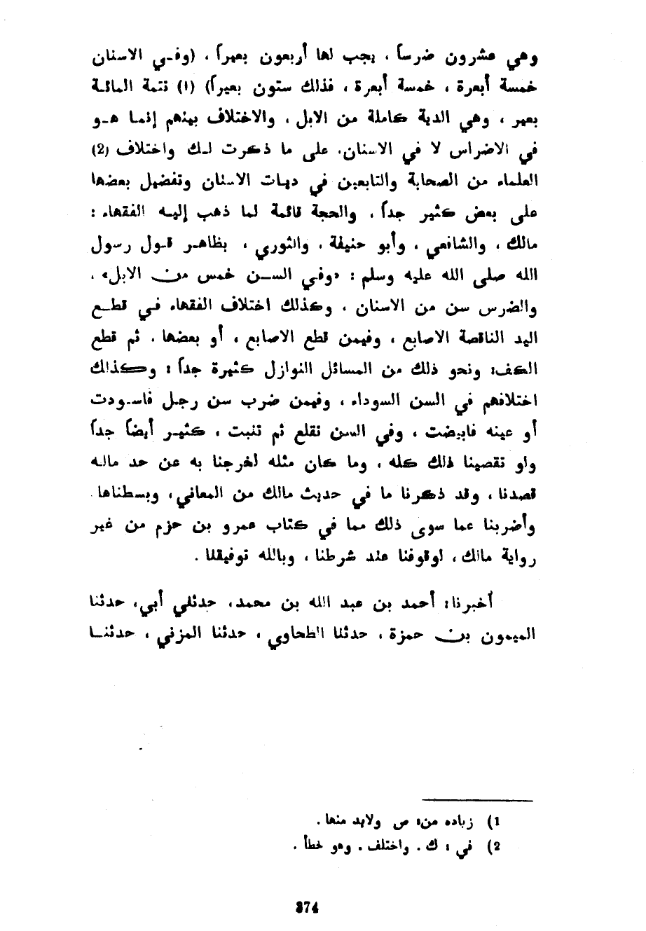 وَهِيَ عِشْرُونَ ضِرْسًا يَجِبُ لَهَا أَرْبَعُونَ بَعِيرًا (وَفِي الْأَسْنَانِ خَمْسَةُ أَبْعِرَةٍ خَمْسَةُ أَبْعِرَةٍ فَذَلِكَ سِتُّونَ بَعِيرًا) تَتِمَّةُ الْمِائَةِ بَعِيرٍ وَهِيَ الدِّيَةُ كَامِلَةً مِنَ الْإِبِلِ وَالِاخْتِلَافُ بَيْنَهُمْ إِنَّمَا هُوَ فِي الْأَضْرَاسِ لَا فِي الْأَسْنَانِ عَلَى مَا ذَكَرْتُ لَكَ وَاخْتِلَافُ الْعُلَمَاءِ مِنَ الصَّحَابَةِ وَالتَّابِعِينَ فِي دِيَاتِ الْأَسْنَانِ وَتَفْضِيلِ بَعْضِهَا عَلَى بَعْضٍ كَثِيرٌ جِدًّا وَالْحُجَّةُ قَائِمَةٌ لِمَا ذَهَبَ إِلَيْهِ الْفُقَهَاءُ مَالِكٌ وَالشَّافِعِيُّ وَأَبُو حَنِيفَةَ وَالثَّوْرِيُّ بِظَاهِرِ قَوْلِ رَسُولِ اللَّهِ صَلَّى اللَّهُ عَلَيْهِ وسلم وَفِي السِّنِّ خَمْسٌ مِنَ الْإِبِلِ وَالضِّرْسُ سِنٌّ مِنَ الْأَسْنَانِ وَكَذَلِكَ اخْتِلَافُ الْفُقَهَاءِ فِي قَطْعِ الْيَدِ النَّاقِصَةِ الْأَصَابِعِ وَفِيمَنْ قُطِعَ الْأَصَابِعَ أَوْ بَعْضَهَا ثُمَّ قُطِعَ الْكَفَّ وَنَحْوُ ذَلِكَ مِنَ الْمَسَائِلِ النَّوَازِلِ كَثِيرَةٌ جِدًّا وَكَذَلِكَ اخْتِلَافُهُمْ فِي السِّنِّ السَّوْدَاءِ وَفِيمَنْ ضَرَبَ سِنَّ رَجُلٍ فَاسْوَدَّتْ أَوْ عَيْنَهُ فَابْيَضَّتْ وَفِي السِّنِّ تُقْلَعُ ثُمَّ تَنْبُتُ كَثِيرٌ أَيْضًا جِدًّا وَلَوْ تَقَصَّيْنَا ذَلِكَ كُلَّهُ وَمَا كَانَ مِثْلَهُ لَخَرَجْنَا بِهِ عَنْ حَدِّ مَا لَهُ قَصَدْنَا وَقَدْ ذَكَرْنَا مَا فِي حَدِيثِ مَالِكٍ مِنَ الْمَعَانِي وَبَسَطْنَاهَا وَأَضْرَبْنَا عَمَّا سِوَى ذَلِكَ مِمَّا فِي كِتَابِ عَمْرِو بْنِ حَزْمٍ مِنْ غَيْرِ رِوَايَةِ مَالِكٍ لِوُقُوفِنَا عِنْدَ شَرْطِنَا وَبِاللَّهِ تَوْفِيقُنَا أَخْبَرَنَا أَحْمَدُ بْنُ عَبْدِ اللَّهِ بْنِ مُحَمَّدِ حَدَّثَنِي أَبِي حَدَّثَنَا الْمَيْمُونُ بْنُ حَمْزَةَ حَدَّثَنَا الطَّحَاوِيُّ حَدَّثَنَا الْمُزَنِيُّ حدثنا