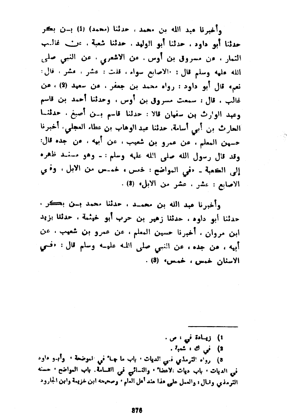 وَأَخْبَرَنَا عَبْدُ اللَّهِ بْنُ مُحَمَّدٍ حَدَّثَنَا (مُحَمَّدُ) بْنُ بَكْرٍ حَدَّثَنَا أَبُو دَاوُدَ حَدَّثَنَا أَبُو الْوَلِيدِ حَدَّثَنَا شُعْبَةُ عَنْ غَالِبٍ التَّمَّارِ عَنْ مَسْرُوقِ بْنِ أَوْسٍ عَنِ الْأَشْعَرِيِّ عَنِ النَّبِيِّ صَلَّى اللَّهُ عَلَيْهِ وَسَلَّمَ قَالَ الْأَصَابِعُ سَوَاءٌ قُلْتُ عَشْرٌ عَشْرٌ قَالَ نَعَمْ قَالَ أَبُو دَاوُدَ رَوَاهُ مُحَمَّدُ بْنُ جَعْفَرٍ عَنْ سَعِيدٍ عَنْ غَالِبٍ قَالَ سَمِعْتُ مَسْرُوقَ بْنَ أَوْسٍ وَحَدَّثَنَا أَحْمَدُ بْنُ قَاسِمٍ وَعَبْدُ الْوَارِثِ بْنُ سُفْيَانَ قَالَا حَدَّثَنَا قَاسِمُ بْنُ أَصْبَغَ حَدَّثَنَا الْحَارِثُ بْنُ أَبِي أُسَامَةَ حَدَّثَنَا عَبْدُ الْوَهَّابِ بن عطاءالعجلي أَخْبَرَنَا حُسَيْنٍ الْمُعَلِّمِ عَنْ عَمْرِو بْنِ شُعَيْبٍ عَنْ أَبِيهِ عَنْ جَدِّهِ قَالَ وَقَدْ قَالَ رَسُولُ اللَّهِ صَلَّى اللَّهُ عَلَيْهِ وسلم وهو مُسْنِدٌ ظَهْرَهُ إِلَى الْكَعْبَةِ فِي الْمَوَاضِحِ خَمْسٌ خَمْسٌ مِنَ الْإِبِلِ وَفِي الْأَصَابِعِ عَشْرٌ عَشْرٌ مِنَ الْإِبِلِ وَأَخْبَرَنَا عَبْدُ اللَّهِ بْنُ مُحَمَّدٍ حَدَّثَنَا مُحَمَّدُ بْنُ بَكْرٍ حَدَّثَنَا أَبُو دَاوُدَ حَدَّثَنَا زُهَيْرُ بْنُ حَرْبٍ أَبُو خَيْثَمَةَ حَدَّثَنَا يَزِيدُ بْنُ مَرْوَانَ أَخْبَرَنَا حُسَيْنٍ الْمُعَلِّمِ عَنْ عَمْرِو بْنِ شُعَيْبٍ عَنْ أَبِيهِ عَنْ جَدِّهِ عَنِ النَّبِيِّ صَلَّى اللَّهُ عَلَيْهِ وَسَلَّمَ قَالَ فِي الْأَسْنَانِ خَمْسٌ خَمْسٌ