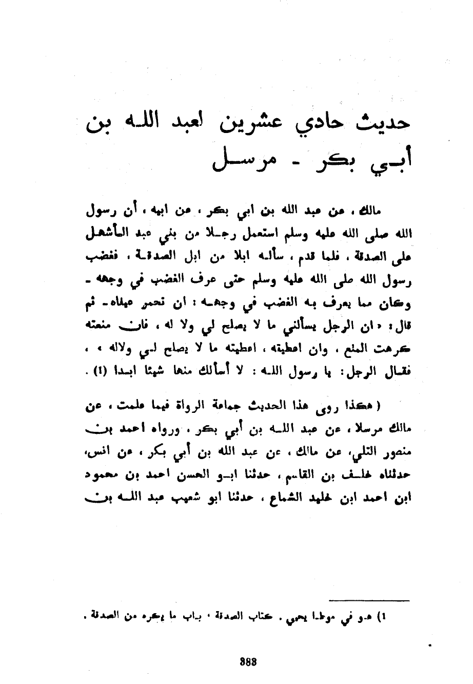 حَدِيثٌ حَادِي عِشْرِينَ لِعَبْدِ اللَّهِ بْنِ أَبِي بَكْرٍ مُرْسَلٌ مَالِكٌ عَنْ عَبْدِ اللَّهِ بْنِ أَبِي بَكْرٍ عَنْ أَبِيهِ أَنَّ رَسُولَ اللَّهِ صَلَّى اللَّهُ عَلَيْهِ وَسَلَّمَ اسْتَعْمَلَ رَجُلًا مِنْ بَنِي عَبْدِ الْأَشْهَلِ عَلَى الصَّدَقَةِ فَلَمَّا قَدِمَ سَأَلَهُ إِبِلًا مِنْ إِبِلِ الصَّدَقَةِ فَغَضِبَ رَسُولُ اللَّهِ صَلَّى اللَّهُ عَلَيْهِ وَسَلَّمَ حَتَّى عُرِفَ الْغَضَبُ فِي وَجْهِهِ وَكَانَ مِمَّا يُعْرَفُ بِهِ الْغَضَبُ فِي وَجْهِهِ أَنْ تَحْمَرَّ عَيْنَاهُ ثُمَّ قَالَ إِنَّ الرَّجُلَ يَسْأَلُنِي مَا لَا يَصْلُحُ لِي وَلَا لَهُ فَإِنْ مَنَعْتُهُ كَرِهْتُ الْمَنْعَ وَإِنْ أَعْطَيْتُهُ أَعْطَيْتُهُ مَا لَا يَصْلُحُ لِي وَلَا لَهُ فَقَالَ الرَّجُلُ يَا رَسُولَ اللَّهِ لَا أَسْأَلُكَ مِنْهَا شَيْئًا أَبَدًا (هَكَذَا رَوَى هَذَا الْحَدِيثَ جَمَاعَةُ الرُّوَاةِ فِيمَا عَلِمْتُ عَنْ مَالِكٍ مُرْسَلًا عَنْ عَبْدِ اللَّهِ بْنِ أَبِي بَكْرٍ وَرَوَاهُ أَحْمَدُ بْنُ مَنْصُورٍ التَّلِّيُّ عَنْ مَالِكٌ عَنْ عَبْدِ اللَّهِ بْنِ أَبِي بَكْرٍ عَنْ أَنَسٍ حَدَّثَنَاهُ خَلَفُ بْنُ الْقَاسِمِ حَدَّثَنَا أَبُو الْحَسَنِ أَحْمَدُ بْنُ مَحْمُودِ بْنِ أَحْمَدَ بْنِ خُلَيْدٍ الشَّمَّاعُ حَدَّثَنَا أَبُو شُعَيْبٍ عَبْدُ الله بن