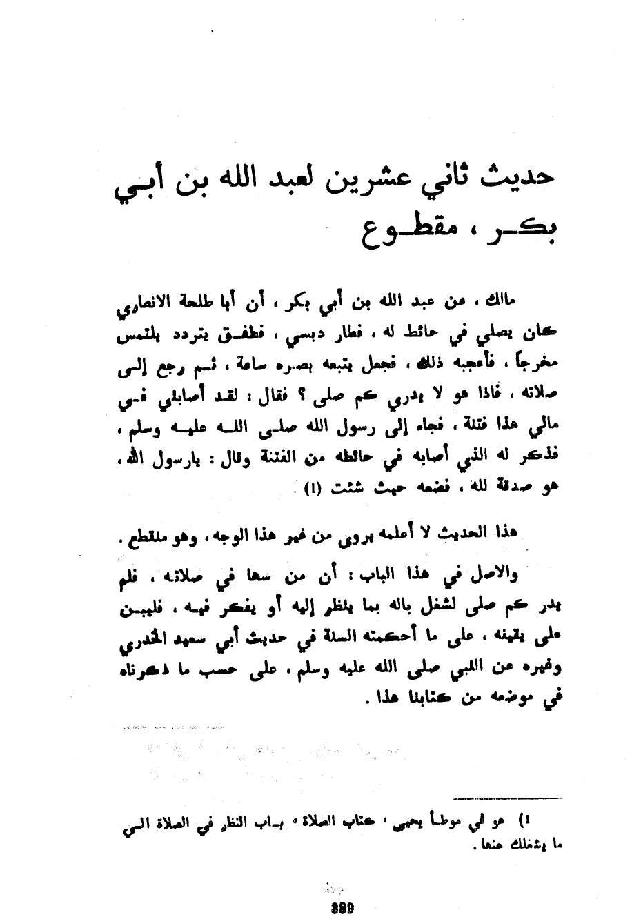 حَدِيثٌ ثَانِي عِشْرِينَ لِعَبْدِ اللَّهِ بْنِ أَبِي بَكْرٍ مَقْطُوعٌ مَالِكٌ عَنْ عَبْدِ اللَّهِ بْنِ أَبِي بَكْرٍ أَنَّ أَبَا طَلْحَةَ الْأَنْصَارِيَّ كَانَ يُصَلِّي فِي حَائِطٍ لَهُ فَطَارَ دُبْسِيٌّ فَطَفِقَ يَتَرَدَّدُ يَلْتَمِسُ مَخْرَجًا فَأَعْجَبَهُ ذَلِكَ فَجَعَلَ يُتْبِعُهُ بَصَرَهُ سَاعَةً ثُمَّ رَجَعَ إِلَى صَلَاتِهِ فَإِذَا هُوَ لَا يَدْرِي كَمْ صَلَّى فَقَالَ لَقَدْ أَصَابَنِي فِي مَالِي هَذَا فِتْنَةٌ فَجَاءَ إِلَى رَسُولِ اللَّهِ صَلَّى اللَّهُ عَلَيْهِ وَسَلَّمَ فذكر لَهُ الَّذِي أَصَابَهُ فِي حَائِطِهِ مِنَ الْفِتْنَةِ وَقَالَ يَا رَسُولَ اللَّهِ هُوَ صَدَقَةٌ لِلَّهِ فَضَعْهُ حَيْثُ شِئْتَ هَذَا الْحَدِيثُ لَا أَعْلَمُهُ يُرْوَى مِنْ غَيْرِ هَذَا الْوَجْهِ وَهُوَ مُنْقَطِعٌ وَالْأَصْلُ فِي هَذَا الْبَابِ أَنَّ مَنْ سَهَا فِي صَلَاتِهِ فَلَمْ يَدْرِ كَمْ صَلَّى لِشُغْلِ بَالِهِ بِمَا يَنْظُرُ إِلَيْهِ أَوْ يُفَكِّرُ فِيهِ فَلْيَبْنِ عَلَى يَقِينِهِ عَلَى مَا أَحْكَمَتْهُ السُّنَّةُ فِي حَدِيثِ أَبِي سَعِيدٍ الْخُدْرِيِّ وَغَيْرُهُ عَنِ النَّبِيِّ صَلَّى اللَّهُ عَلَيْهِ وَسَلَّمَ عَلَى حَسَبِ مَا ذَكَرْنَاهُ فِي مَوْضِعِهِ مِنْ كِتَابِنَا هَذَا