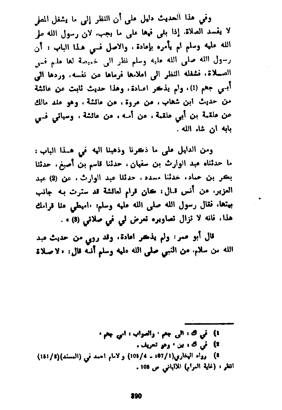 وَفِي هَذَا الْحَدِيثِ دَلِيلٌ عَلَى أَنَّ النَّظَرَ إِلَى مَا يُشْغِلُ الْمُصَلِّي لَا يُفْسِدُ الصَّلَاةَ إِذَا بَنَى فِيهَا عَلَى مَا يَجِبُ لِأَنَّ رَسُولَ اللَّهِ صَلَّى اللَّهُ عَلَيْهِ وَسَلَّمَ لم يَأْمُرْهُ بِإِعَادَةٍ وَالْأَصْلُ فِي هَذَا الْبَابِ أَنَّ رَسُولَ اللَّهِ صَلَّى اللَّهُ عَلَيْهِ وَسَلَّمَ نَظَرَ إِلَى خَمِيصَةٍ لَهَا عَلَمٌ فِي الصَّلَاةِ فَشَغَلَهُ النَّظَرُ إِلَى أَعْلَامِهَا فَرَمَاهَا عَنْ نَفْسِهِ وَرَدَّهَا إِلَى أَبِي جَهْمٍ وَلَمْ يَذْكُرْ إِعَادَةً وَهَذَا حَدِيثٌ ثَابِتٌ عَنْ عَائِشَةَ مِنْ حَدِيثِ ابْنِ شِهَابٍ عَنْ عُرْوَةَ عَنْ عَائِشَةَ وَهُوَ عِنْدَ مَالِكٍ عَنْ عَلْقَمَةَ بْنِ أَبِي عَلْقَمَةَ عَنْ أُمِّهِ عَنْ عَائِشَةَ وَسَيَأْتِي فِي بَابِهِ إِنْ شَاءَ اللَّهُ وَمِنَ الدَّلِيلِ عَلَى مَا ذَكَرْنَا وَذَهَبْنَا إِلَيْهِ فِي هَذَا الْبَابِ مَا حَدَّثَنَاهُ عَبْدُ الْوَارِثِ بْنُ سُفْيَانَ حَدَّثَنَا قَاسِمُ بْنُ أَصْبَغَ حَدَّثَنَا بَكْرُ بْنُ حَمَّادٍ حَدَّثَنَا مُسَدَّدٌ حَدَّثَنَا عَبْدُ الْوَارِثِ عَنْ عَبْدِ الْعَزِيزِ عَنْ أَنَسٍ قَالَ كَانَ قِرَامٌ لِعَائِشَةَ قَدْ سَتَرَتْ بِهِ جَانِبَ بَيْتِهَا فَقَالَ رَسُولُ اللَّهِ صَلَّى اللَّهُ عَلَيْهِ وَسَلَّمَ أَمِيطِي عَنَّا قِرَامَكِ هَذَا فَإِنَّهُ لَا تَزَالُ تَصَاوِيرُهُ تَعْرِضُ لِي فِي صَلَاتِي قَالَ أَبُو عُمَرَ وَلَمْ يَذْكُرْ إِعَادَةً وَقَدْ رُوِيَ مِنْ حَدِيثِ عَبْدِ اللَّهِ بْنِ سَلَامٍ عَنِ النَّبِيِّ صَلَّى اللَّهُ عَلَيْهِ وَسَلَّمَ أَنَّهُ قَالَ لَا صَلَاةَ