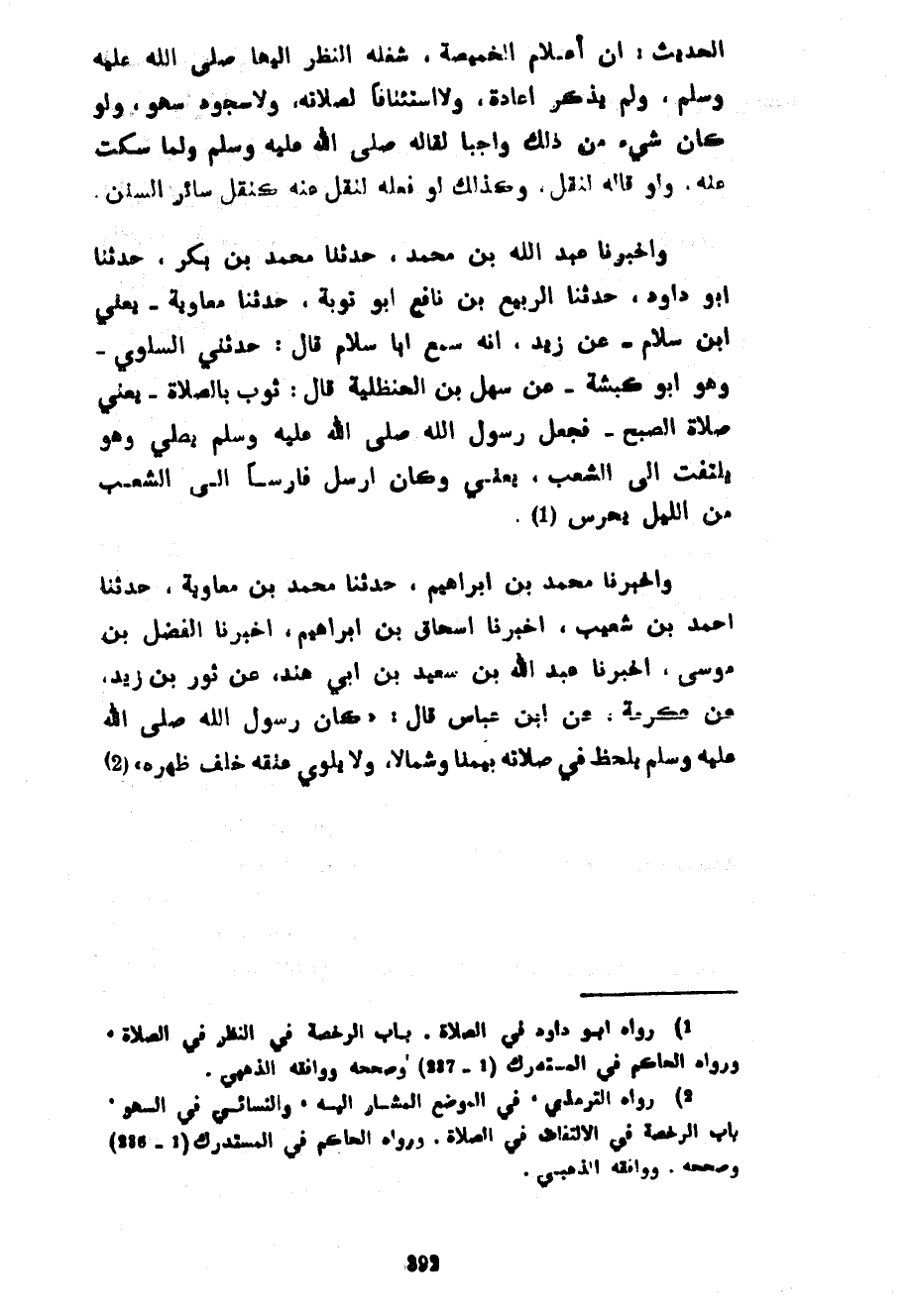 الْحَدِيثِ أَنَّ أَعْلَامَ الْخَمِيصَةِ شَغَلَهُ النَّظَرُ إِلَيْهَا صَلَّى اللَّهُ عَلَيْهِ وَسَلَّمَ وَلَمْ يَذْكُرْ إِعَادَةً وَلَا اسْتِئْنَافًا لِصَلَاتِهِ وَلَا سُجُودَ سَهْوٍ وَلَوْ كَانَ شَيْءٌ مِنْ ذَلِكَ وَاجِبًا لَقَالَهُ صَلَّى اللَّهُ عَلَيْهِ وَسَلَّمَ وَلَمَا سَكَتَ عَنْهُ وَلَوْ قَالَهُ لَنُقِلَ وَكَذَلِكَ لَوْ فَعَلَهُ لَنُقِلَ عَنْهُ كَنَقْلِ سَائِرِ السُّنَنِ وَأَخْبَرَنَا عَبْدُ اللَّهِ بْنُ مُحَمَّدٍ حَدَّثَنَا مُحَمَّدُ بْنُ بَكْرٍ حَدَّثَنَا أَبُو دَاوُدَ حَدَّثَنَا الرَّبِيعُ بْنُ نَافِعٍ أَبُو تَوْبَةَ حَدَّثَنَا مُعَاوِيَةُ يَعْنِي ابْنَ سَلَامٍ عَنْ زَيْدٍ أنه سمع أبا سلام قال حدثني السلوي وَهُوَ أَبُو كَبْشَةَ عَنْ سَهْلِ بْنِ الْحَنْظَلِيَّةِ قَالَ ثُوِّبَ بِالصَّلَاةِ يَعْنِي صَلَاةَ الصُّبْحِ فَجَعَلَ رَسُولُ اللَّهِ صَلَّى اللَّهُ عَلَيْهِ وَسَلَّمَ يُصَلِّي وَهُوَ يَلْتَفِتُ إِلَى الشِّعْبِ يَعْنِي وَكَانَ أَرْسَلَ فَارِسًا إِلَى الشِّعْبِ مِنَ اللَّيْلِ يَحْرُسُ وَأَخْبَرَنَا مُحَمَّدُ بْنُ إِبْرَاهِيمَ حَدَّثَنَا مُحَمَّدُ بْنُ مُعَاوِيَةَ حدثنا أحمد بن شعيب أخبرنا إسحاق بن إِبْرَاهِيمَ أَخْبَرَنَا الْفَضْلُ بْنُ مُوسَى أَخْبَرَنَا عَبْدِ اللَّهِ بْنِ سَعِيدِ بْنِ أَبِي هِنْدٍ عَنْ ثَوْرِ بْنِ زَيْدٍ عَنْ عِكْرِمَةَ عَنِ ابْنِ عَبَّاسٍ قَالَ كَانَ رَسُولُ اللَّهِ صَلَّى اللَّهُ عَلَيْهِ وَسَلَّمَ يَلْحَظُ فِي صَلَاتِهِ يَمِينًا وَشِمَالًا وَلَا يَلْوِي عُنُقَهُ خَلْفَ ظَهْرِهِ