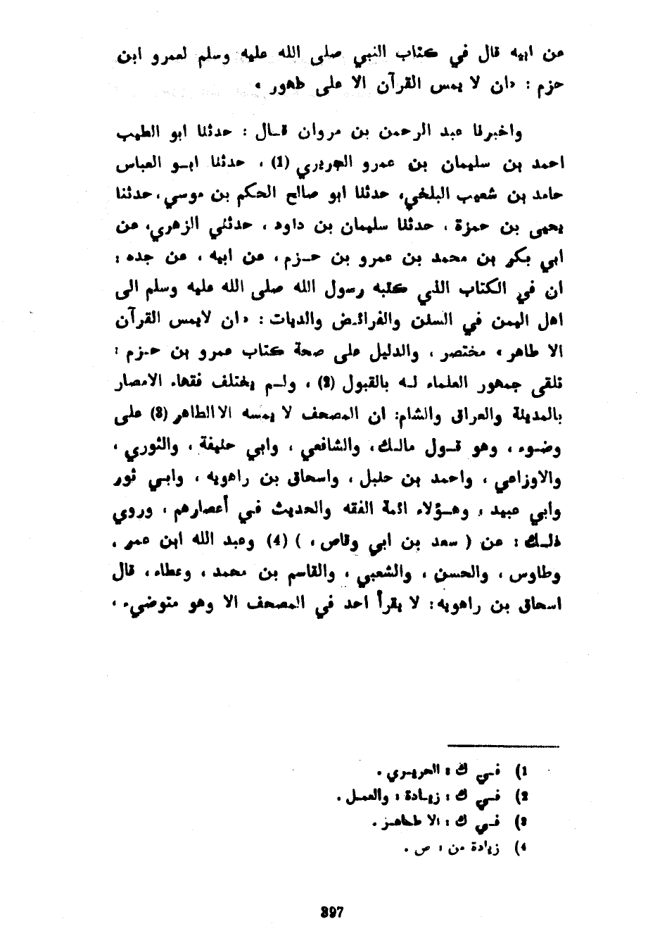 عَنْ أَبِيهِ قَالَ فِي كِتَابِ النَّبِيِّ صَلَّى اللَّهُ عَلَيْهِ وَسَلَّمَ لِعَمْرِو بْنِ حَزْمٍ أَنْ لَا يُمَسَّ الْقُرْآنُ إِلَّا عَلَى طَهُورٍ وَأَخْبَرَنَا عَبْدُ الرَّحْمَنِ بْنُ مَرْوَانَ قَالَ حَدَّثَنَا أَبُو الطَّيِّبِ أَحْمَدُ بْنُ سُلَيْمَانَ بْنِ عَمْرٍو الْجُرَيْرِيُّ حَدَّثَنَا أَبُو الْعَبَّاسِ حَامِدُ بْنُ شُعَيْبٍ الْبَلْخِيُّ حدثنا أبوصالح الْحَكَمُ بْنُ مُوسَى حَدَّثَنَا يَحْيَى بْنُ حَمْزَةَ حَدَّثَنَا سُلَيْمَانُ بْنُ دَاوُدَ حَدَّثَنِي الزُّهْرِيُّ عَنْ أَبِي بَكْرِ بْنِ مُحَمَّدِ بْنِ عَمْرِو بْنِ حَزْمٍ عَنْ أَبِيهِ عَنْ جَدِّهِ أَنَّ فِي الْكِتَابِ الَّذِي كَتَبَهُ رَسُولُ اللَّهِ صَلَّى اللَّهُ عَلَيْهِ وَسَلَّمَ إِلَى أَهْلِ الْيَمَنِ فِي السُّنَنِ وَالْفَرَائِضِ وَالدِّيَاتِ أَنْ لَا يَمَسَّ الْقُرْآنَ إِلَّا طَاهِرٌ مُخْتَصَرٌ وَالدَّلِيلُ عَلَى صِحَّةِ كِتَابِ عَمْرِو بْنِ حَزْمٍ تَلَقِّي جُمْهُورِ الْعُلَمَاءِ لَهُ بِالْقَبُولِ وَلَمْ يَخْتَلِفْ فُقَهَاءُ الْأَمْصَارِ بِالْمَدِينَةِ وَالْعِرَاقِ وَالشَّامِ أَنَّ الْمُصْحَفَ لَا يَمَسُّهُ إِلَّا الطَّاهِرُ عَلَى وُضُوءٍ وَهُوَ قَوْلُ مَالِكٍ وَالشَّافِعِيِّ وَأَبِي حَنِيفَةَ وَالثَّوْرِيِّ وَالْأَوْزَاعِيِّ وَأَحْمَدُ بْنِ حَنْبَلٍ وَإِسْحَاقَ بْنِ رَاهَوَيْهِ وَأَبِي ثَوْرٍ وَأَبِي عُبَيْدٍ وَهَؤُلَاءِ أَئِمَّةُ الْفِقْهِ وَالْحَدِيثِ فِي أَعْصَارِهِمْ وَرُوِيَ ذَلِكَ عَنْ (سَعْدِ بْنُ أَبِي وَقَّاصٍ) وَعَبْدُ اللَّهِ بْنُ عُمَرَ وَطَاوُسٍ وَالْحَسَنِ وَالشَّعْبِيِّ وَالْقَاسِمِ بْنِ مُحَمَّدٍ وعطاء قال إسحاق بن رَاهَوَيْهِ لَا يَقْرَأُ أَحَدٌ فِي الْمُصْحَفِ إِلَّا وهو متوضئ