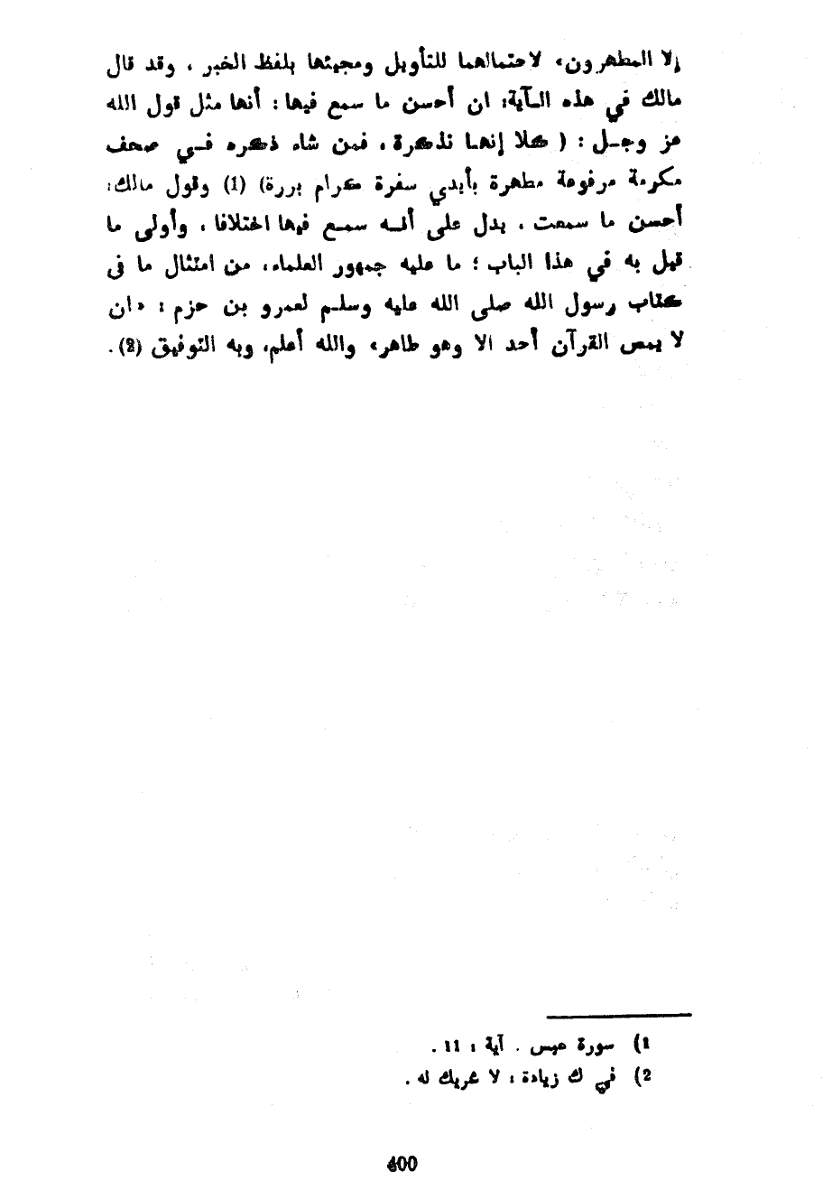 إلا المطهرون لاحتمالهما للتأويل ومجيئها بِلَفْظِ الْخَبَرِ وَقَدْ قَالَ مَالِكٌ فِي هَذِهِ الْآيَةِ إِنَّ أَحْسَنَ مَا سَمِعَ فِيهَا أَنَّهَا مِثْلُ قَوْلِ اللَّهِ عَزَّ وَجَلَّ كَلَّا إِنَّهَا تَذْكِرَةٌ فَمَنْ شَاءَ ذَكَرَهُ فِي صُحُفٍ مُكَرَّمَةٍ مَرْفُوعَةٍ مُطَهَّرَةٍ بِأَيْدِي سَفَرَةٍ كِرَامٍ بَرَرَةٍ وَقَوْلُ مَالِكٍ أَحْسَنُ مَا سَمِعْتُ يَدُلُّ عَلَى أَنَّهُ سَمِعَ فِيهَا اخْتِلَافًا وَأَوْلَى مَا قِيلَ بِهِ فِي هَذَا الْبَابِ مَا عَلَيْهِ جُمْهُورُ الْعُلَمَاءِ مِنِ امْتِثَالِ مَا فِي كِتَابُ رَسُولِ اللَّهِ صَلَّى اللَّهُ عَلَيْهِ وَسَلَّمَ لِعَمْرِو بْنِ حَزْمٍ أَنْ لَا يَمَسَّ الْقُرْآنَ أَحَدٌ إِلَّا وَهُوَ طاهر والله أعلمي وبه التوفيق