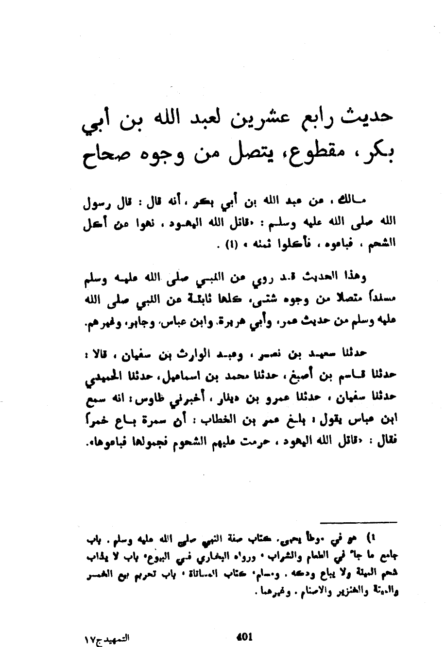 حَدِيثٌ رَابِعُ عِشْرِينَ لِعَبْدِ اللَّهِ بْنِ أَبِي بَكْرٍ مَقْطُوعٌ يَتَّصِلُ مِنْ وُجُوهٍ صِحَاحٍ مَالِكٌ عَنْ عَبْدِ اللَّهِ بْنِ أَبِي بَكْرٍ أَنَّهُ قَالَ قَالَ رَسُولُ اللَّهِ صَلَّى اللَّهُ عَلَيْهِ وَسَلَّمَ قَاتَلَ اللَّهُ الْيَهُودَ نُهُوا عَنْ أَكْلِ الشَّحْمِ فَبَاعُوهُ فَأَكَلُوا ثَمَنَهُ وَهَذَا الْحَدِيثُ قَدْ رُوِيَ عَنِ النَّبِيِّ صَلَّى اللَّهُ عَلَيْهِ وَسَلَّمَ مُسْنَدًا مُتَّصِلًا مِنْ وُجُوهٍ شَتَّى كُلُّهَا ثَابِتَةٌ عَنِ النَّبِيِّ صَلَّى اللَّهُ عَلَيْهِ وَسَلَّمَ من حَدِيثِ عُمَرَ وَأَبِي هُرَيْرَةَ وَابْنِ عَبَّاسٍ وَجَابِرٍ وَغَيْرِهِمْ حَدَّثَنَا سَعِيدُ بْنُ نَصْرٍ وَعَبْدُ الْوَارِثِ بْنُ سُفْيَانَ قَالَا حَدَّثَنَا قَاسِمُ بْنُ أَصْبَغَ حَدَّثَنَا مُحَمَّدُ بْنُ إِسْمَاعِيلَ حَدَّثَنَا الْحُمَيْدِيُّ حَدَّثَنَا سُفْيَانُ حَدَّثَنَا عَمْرُو بْنُ دِينَارٍ أَخْبَرَنِي طَاوُسٌ أَنَّهُ سَمِعَ ابْنَ عَبَّاسٍ يَقُولُ بَلَغَ عُمَرَ بْنَ الْخَطَّابِ أَنَّ سَمُرَةَ بَاعَ خَمْرًا فَقَالَ قَاتَلَ اللَّهُ الْيَهُودَ حُرِّمَتْ عَلَيْهِمُ الشُّحُومُ فَجَمَّلُوهَا فباعوها
