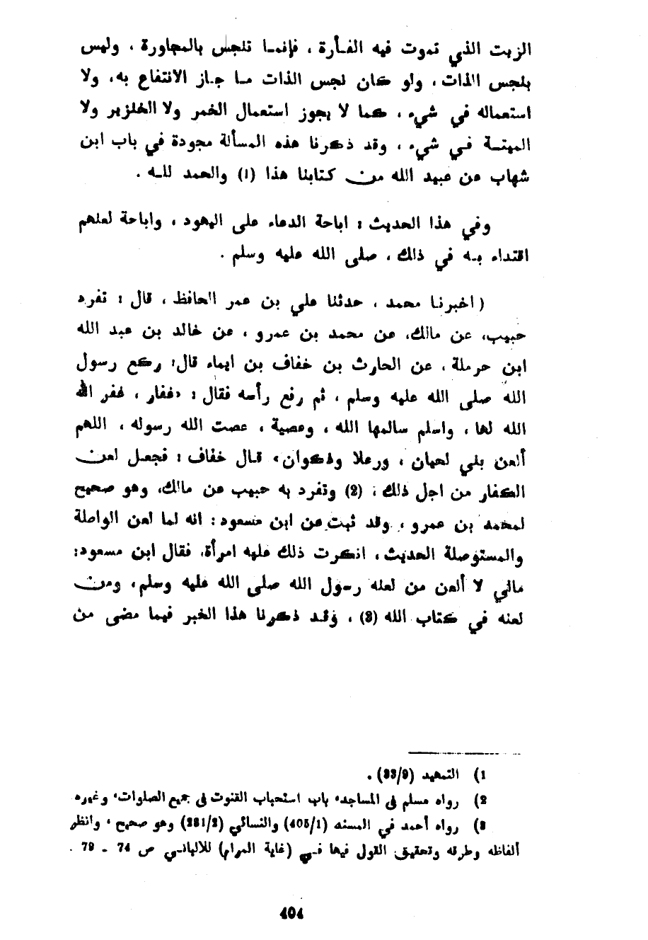 الزَّيْتُ الَّذِي تَمُوتُ فِيهِ الْفَأْرَةُ فَإِنَّمَا تَنَجَّسَ بِالْمُجَاوَرَةِ وَلَيْسَ بِنَجَسِ الذَّاتِ وَلَوْ كَانَ نَجِسَ الذَّاتِ مَا جَازَ الِانْتِفَاعُ بِهِ وَلَا اسْتِعْمَالُهُ فِي شَيْءٍ كَمَا لَا يَجُوزُ اسْتِعْمَالُ الْخَمْرِ وَلَا الْخِنْزِيرِ وَلَا الْمَيْتَةِ فِي شَيْءٍ وَقَدْ ذَكَرْنَا هَذِهِ الْمَسْأَلَةَ مُجَوَّدَةً فِي بَابِ ابْنِ شِهَابٍ عَنْ عُبَيْدِ اللَّهِ مِنْ كِتَابِنَا هَذَا وَالْحَمْدُ لِلَّهِ وَفِي هَذَا الْحَدِيثِ إِبَاحَةُ الدُّعَاءِ عَلَى الْيَهُودِ وَإِبَاحَةُ لَعْنِهِمْ اقْتِدَاءً بِهِ فِي ذَلِكَ صَلَّى اللَّهُ عَلَيْهِ وَسَلَّمَ (أَخْبَرَنَا مُحَمَّدٌ حَدَّثَنَا عَلِيُّ بْنُ عُمَرَ الْحَافِظُ قَالَ تَفَرَدَّ حَبِيبٌ عَنْ مَالِكٍ عَنْ مُحَمَّدِ بْنِ عَمْرِو عَنْ خَالِدِ بْنِ عَبْدِ اللَّهِ بْنِ حَرْمَلَةَ عَنِ الْحَارِثِ بْنِ خُفَافِ بْنِ إِيمَاءٍ قَالَ رَكَعَ رَسُولُ اللَّهِ صَلَّى اللَّهُ عَلَيْهِ وَسَلَّمَ ثُمَّ رَفَعَ رَأْسَهُ فَقَالَ غِفَارٌ غَفَرَ اللَّهُ لَهَا وَأَسْلَمُ سَالَمَهَا اللَّهُ وَعُصَيَّةُ عَصَتِ اللَّهَ وَرَسُولَهُ اللَّهُمَّ الْعَنْ بَنِي لِحْيَانَ وَرِعْلًا وَذَكْوَانَ قَالَ خُفَافٌ فَجُعِلَ لَعْنُ الْكُفَّارِ مِنْ أَجْلِ ذَلِكَ (2) وَتَفَرَّدَ بِهِ حَبِيبٌ عَنْ مَالِكٍ وَهُوَ صَحِيحٌ لِمُحَمَّدِ بْنِ عَمْرٍو وَقَدْ ثَبَتَ عَنِ ابْنِ مَسْعُودٍ أَنَّهُ لَمَّا لَعَنَ الْوَاصِلَةَ وَالْمُسْتَوْصِلَةَ الْحَدِيثَ أَنْكَرَتْ ذَلِكَ عَلَيْهِ امْرَأَةٌ فَقَالَ ابْنُ مسعود مالي لَا أَلْعَنُ مَنْ لَعَنَهُ رَسُولِ اللَّهِ صَلَّى اللَّهُ عَلَيْهِ وَسَلَّمَ وَمِنْ لَعْنُهُ فِي كِتَابِ اللَّهِ وَقَدْ ذَكَرْنَا هَذَا الْخَبَرَ فِيمَا مَضَى من