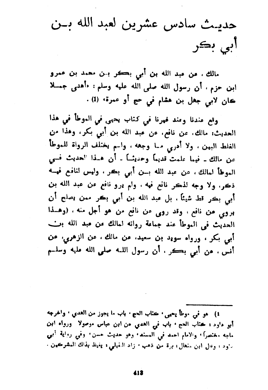 حَدِيثٌ سَادِسُ عِشْرِينَ لِعَبْدِ اللَّهِ بْنِ أَبِي بَكْرٍ مَالِكٌ عَنْ عَبْدِ اللَّهِ بْنِ أَبِي بَكْرٍ بْنِ محمد بن عمرو بْنِ حَزْمٍ أَنَّ رَسُولَ اللَّهِ صَلَّى اللَّهُ عَلَيْهِ وَسَلَّمَ أَهْدَى جَمَلًا كَانَ لِأَبِي جَهْلِ بْنِ هِشَامٍ فِي حَجٍّ أَوْ عُمْرَةٍ وَقَعَ عِنْدَنَا وَعِنْدَ غَيْرِنَا فِي كِتَابِ يَحْيَى فِي الْمُوَطَّأِ فِي هَذَا الْحَدِيثِ مَالِكٌ عَنْ نَافِعٍ عَنْ عَبْدِ اللَّهِ بْنِ أَبِي بَكْرٍ وَهَذَا مِنَ الْغَلَطِ الْبَيِّنِ وَلَا أَدْرِي مَا وَجْهُهُ وَلَمْ يَخْتَلِفِ الرُّوَاةُ لِلْمُوَطَّأِ عَنْ مَالِكٍ فِيمَا عَلِمْتُ قَدِيمًا وحديثا أن هذا الحديث في الموطأ لِمَالِكٍ عَنْ عَبْدِ اللَّهِ بْنِ أَبِي بَكْرٍ وَلَيْسَ لِنَافِعٍ فِيهِ ذِكْرٌ وَلَا وَجْهَ لِذِكْرِ نَافِعٍ فِيهِ وَلَمْ يَرْوِ نَافِعٍ عَنْ عَبْدِ اللَّهِ بْنِ أَبِي بَكْرِ قَطُّ شَيْئًا بَلْ عَبْدُ اللَّهِ بْنُ أَبِي بَكْرٍ مِمَّنْ يَصْلُحُ أَنْ يَرْوِيَ عَنْ نَافِعٍ وَقَدْ رَوَى عَنْ نَافِعٍ مَنْ هُوَ أَجَلُّ مِنْهُ (وَهَذَا الْحَدِيثُ فِي الْمُوَطَّأِ عِنْدَ جَمَاعَةِ رُوَاتِهِ لِمَالِكٍ عَنْ عَبْدِ اللَّهِ بْنِ أَبِي بَكْرٍ وَرَوَاهُ سُوِيدُ بْنُ سَعِيدٍ عَنْ مَالِكٍ عَنِ الزُّهْرِيِّ عَنْ أَنَسٍ عَنْ أَبِي بَكْرٍ أَنَّ رَسُولَ اللَّهِ صَلَّى اللَّهُ عَلَيْهِ وَسَلَّمَ