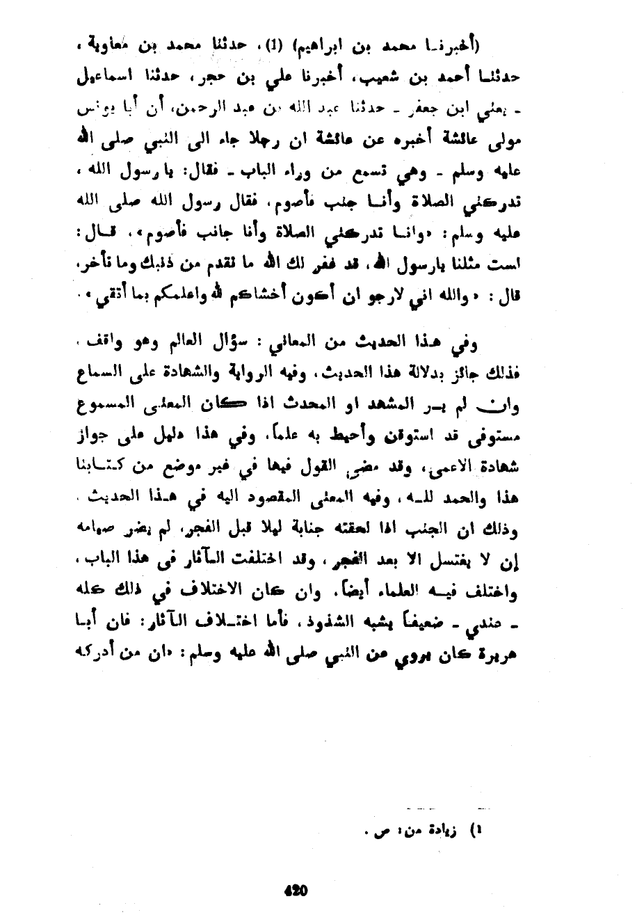 (أَخْبَرَنَا مُحَمَّدُ بْنُ إِبْرَاهِيمَ) حَدَّثَنَا مُحَمَّدُ بْنُ مُعَاوِيَةَ حَدَّثَنَا أَحْمَدُ بْنُ شُعَيْبٍ أَخْبَرَنَا عَلِيُّ بْنُ حُجْرٍ حَدَّثَنَا إِسْمَاعِيلُ يَعْنِي ابْنَ جَعْفَرٍ حَدَّثَنَا عَبْدُ اللَّهِ بْنُ عَبْدِ الرَّحْمَنِ أَنَّ أَبَا يُونُسَ مَوْلَى عَائِشَةَ أَخْبَرَهُ عَنْ عَائِشَةَ أن رجلا جَاءَ إِلَى النَّبِيِّ صَلَّى اللَّهُ عَلَيْهِ وَسَلَّمَ وَهِيَ تَسْمَعُ مِنْ وَرَاءِ الْبَابِ فَقَالَ يَا رَسُولَ اللَّهِ تُدْرِكُنِي الصَّلَاةُ وَأَنَا جُنُبٌ فَأَصُومُ فَقَالَ رَسُولُ اللَّهِ صَلَّى اللَّهُ عَلَيْهِ وَسَلَّمَ وَأَنَا تُدْرِكُنِي الصَّلَاةُ وَأَنَا جُنُبٌ فَأَصُومُ قَالَ لَسْتَ مِثْلَنَا يَا رَسُولَ اللَّهِ قَدْ غَفَرَ لَكَ اللَّهُ مَا تَقَدَّمَ مِنْ ذَنْبِكَ وَمَا تَأَخَّرَ قَالَ وَاللَّهِ إِنِّي لَأَرْجُو أَنْ أَكُونَ أَخْشَاكُمْ لِلَّهِ وَأَعْلَمَكُمْ بِمَا أَتَّقِي وَفِي هَذَا الْحَدِيثِ مِنَ الْمَعَانِي سُؤَالُ الْعَالِمِ وَهُوَ وَاقِفٌ فَذَلِكَ جَائِزٌ بِدَلَالَةِ هَذَا الْحَدِيثِ وَفِيهِ الرِّوَايَةُ وَالشَّهَادَةُ عَلَى السَّمَاعِ وَإِنْ لَمْ يَرَ الْمُشْهِدُ أَوِ الْمُحَدِّثَ إِذَا كَانَ الْمَعْنَى الْمَسْمُوعُ مُسْتَوْفًى قَدِ اسْتُوْقِنَ وَأُحِيطَ بِهِ عِلْمًا وَفِي هَذَا دَلِيلٌ عَلَى جَوَازِ شَهَادَةِ الْأَعْمَى وَقَدْ مَضَى الْقَوْلُ فِيهَا فِي غَيْرِ مَوْضِعٍ من كتابا هَذَا وَالْحَمْدُ لِلَّهِ وَفِيهِ الْمَعْنَى الْمَقْصُودُ إِلَيْهِ فِي هَذَا الْحَدِيثِ وَذَلِكَ أَنَّ الْجُنُبَ إِذَا لَحِقَتْهُ جَنَابَةٌ لَيْلًا قَبْلَ الْفَجْرِ لَمْ يَضُرَّ صِيَامَهُ أَنْ لَا يَغْتَسِلَ إِلَّا بَعْدَ الْفَجْرِ وَقَدِ اخْتَلَفَتِ الْآثَارُ فِي هَذَا الْبَابِ وَاخْتَلَفَ فِيهِ الْعُلَمَاءُ أَيْضًا وَإِنْ كَانَ الِاخْتِلَافُ فِي ذَلِكَ كُلِّهِ عِنْدِي ضَعِيفًا يُشْبِهُ الشُّذُوذَ فَأَمَّا اخْتِلَافُ الْآثَارِ فَإِنَّ أَبَا هُرَيْرَةَ كَانَ يُرْوَى عَنِ النَّبِيِّ صَلَّى اللَّهُ عَلَيْهِ وَسَلَّمَ أن من أدركه