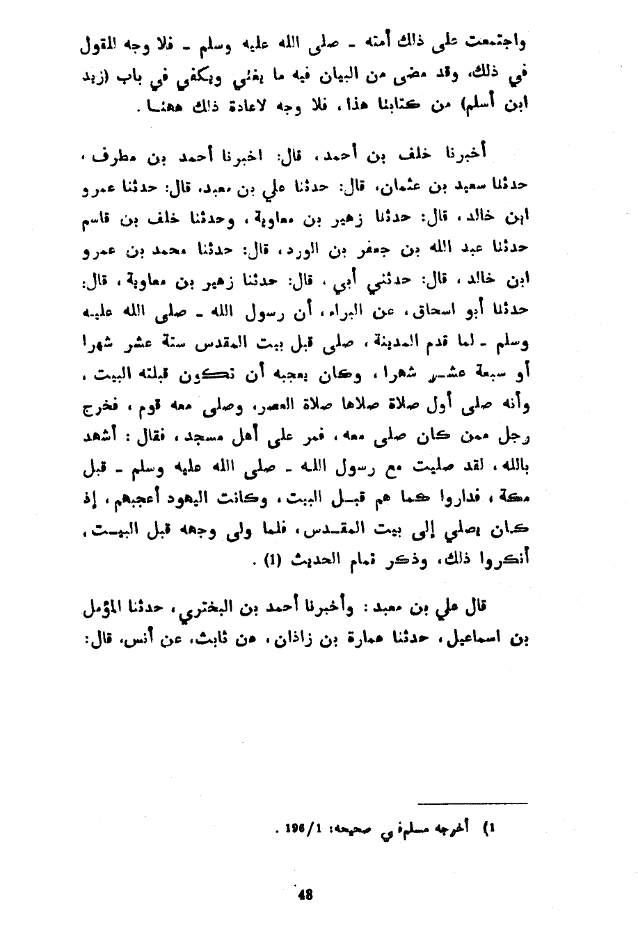 وَاجْتَمَعَتْ عَلَى ذَلِكَ أُمَّتُهُ صَلَّى اللَّهُ عَلَيْهِ وَسَلَّمَ فَلَا وَجْهَ لِلْقَوْلِ فِي ذَلِكَ وَقَدْ مَضَى مِنَ الْبَيَانِ فِيهِ مَا يُغْنِي وَيَكْفِي فِي بَابِ (زَيْدِ بْنِ أَسْلَمَ) مِنْ كِتَابِنَا هَذَا فَلَا وجه لإعادة ذلك ههنا أَخْبَرَنَا خَلَفُ بْنُ أَحْمَدَ قَالَ أَخْبَرَنَا أَحْمَدُ بْنُ مُطَرِّفٍ حَدَّثَنَا سَعِيدُ بْنُ عُثْمَانَ قَالَ حَدَّثَنَا عَلِيُّ بْنُ مَعْبَدٍ قَالَ حَدَّثَنَا عَمْرُو بْنُ خَالِدٍ قَالَ حَدَّثَنَا زُهَيْرُ بْنُ مُعَاوِيَةَ وَحَدَّثَنَا خَلَفُ بْنُ قَاسِمٍ حَدَّثَنَا عَبْدُ اللَّهِ بْنُ جَعْفَرِ بْنِ الْوَرْدِ قَالَ حَدَّثَنَا مُحَمَّدُ بْنُ عَمْرِو بْنِ خَالِدٍ قَالَ حَدَّثَنِي أَبِي قَالَ حَدَّثَنَا زُهَيْرُ بْنُ مُعَاوِيَةَ قَالَ حَدَّثَنَا أَبُو إِسْحَاقَ عَنِ الْبَرَاءِ أَنَّ رَسُولَ اللَّهِ صَلَّى اللَّهُ عَلَيْهِ وَسَلَّمَ لِمَا قَدِمَ الْمَدِينَةَ صَلَّى قِبَلَ بَيْتِ الْمَقْدِسِ سِتَّةَ عَشَرَ شَهْرًا أَوْ سَبْعَةَ عَشَرَ شَهْرًا وَكَانَ يُعْجِبُهُ أَنْ تكون قبلته البيت وأنه صلى أو صَلَاةٍ صَلَّاهَا صَلَاةَ الْعَصْرِ وَصَلَّى مَعَهُ قَوْمٌ فَخَرَجَ رَجُلٌ مِمَّنْ كَانَ صَلَّى مَعَهُ فَمَرَّ عَلَى أَهْلِ مَسْجِدٍ فَقَالَ أَشْهَدُ بِاللَّهِ لَقَدْ صَلَّيْتُ مَعَ رَسُولِ اللَّهِ صَلَّى اللَّهُ عَلَيْهِ وَسَلَّمَ قِبَلَ مَكَّةَ فَدَارُوا كَمَا هُمْ قِبَلَ الْبَيْتِ وَكَانَتِ الْيَهُودُ أَعْجَبَهُمْ إِذْ كَانَ يُصَلِّي إِلَى بَيْتِ الْمَقْدِسِ فَلَمَّا وَلَّى وَجْهَهُ قِبَلَ الْبَيْتِ أَنْكَرُوا ذَلِكَ وَذَكَرَ تَمَامَ الْحَدِيثِ قَالَ عَلِيُّ بْنُ مَعْبَدٍ وَأَخْبَرَنَا أَحْمَدُ بْنُ الْبَخْتَرِيِّ حَدَّثَنَا الْمُؤَمَّلُ بْنُ إِسْمَاعِيلَ حَدَّثَنَا عِمَارَةُ بْنُ زَاذَانَ عَنْ ثَابِتٍ عَنْ أَنَسٍ قَالَ