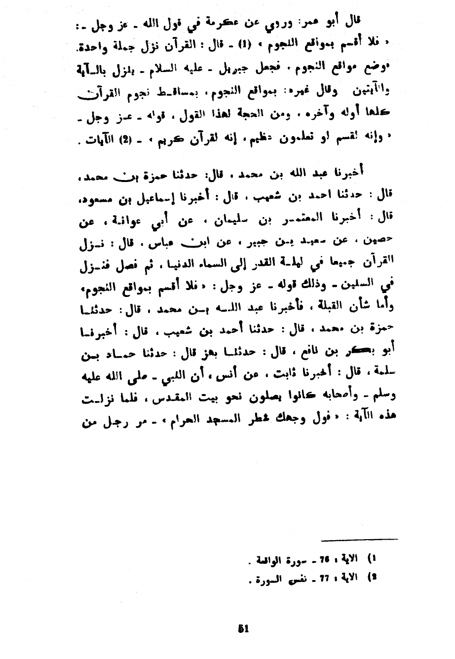 قَالَ أَبُو عُمَرَ وَرُوِيَ عَنْ عِكْرِمَةَ فِي قَوْلِ اللَّهِ عَزَّ وَجَلَّ فَلَا أُقْسِمُ بِمَوَاقِعِ النُّجُومِ قَالَ الْقُرْآنُ نَزَلَ جُمْلَةً وَاحِدَةً فَوُضِعَ مَوَاقِعَ النُّجُومِ فَجَعَلَ جِبْرِيلُ عَلَيْهِ السَّلَامُ يَنْزِلُ بِالْآيَةِ وَالْآيَتَيْنِ وَقَالَ غَيْرُهُ بِمَوَاقِعِ النُّجُومِ بِمَسَاقِطِ نُجُومِ الْقُرْآنِ كُلِّهَا أَوَّلِهِ وَآخِرِهِ وَمِنَ الْحُجَّةِ لِهَذَا الْقَوْلِ قَوْلُهُ عَزَّ وَجَلَّ وَإِنَّهُ لَقَسَمٌ لَوْ تَعْلَمُونَ عَظِيمٌ إِنَّهُ لَقُرْآنٌ كَرِيمٌ الْآيَاتِ أَخْبَرَنَا عَبْدُ اللَّهِ بْنُ مُحَمَّدٍ قَالَ حَدَّثَنَا حَمْزَةُ بْنُ مُحَمَّدٍ قَالَ حَدَّثَنَا أَحْمَدُ بْنُ شُعَيْبٍ قَالَ أَخْبَرَنَا إِسْمَاعِيلُ بْنُ مَسْعُودٍ قَالَ أَخْبَرَنَا الْمُعْتَمِرُ بْنُ سُلَيْمَانَ عَنْ أَبِي عَوَانَةَ عَنْ حُصَيْنٍ عَنْ سَعِيدِ بْنِ جُبَيْرٍ عَنِ ابْنِ عَبَّاسٍ قَالَ نَزَلَ الْقُرْآنُ جَمِيعًا فِي لَيْلَةِ الْقَدْرِ إِلَى السَّمَاءِ الدُّنْيَا ثُمَّ فُصِّلَ فَنَزَلَ فِي السِّنِينَ وَذَلِكَ قَوْلُهُ عَزَّ وَجَلَّ فَلَا أُقْسِمُ بِمَوَاقِعِ النُّجُومِ وَأَمَّا شَأْنُ الْقِبْلَةِ فَأَخْبَرَنَا عَبْدُ اللَّهِ بْنُ مُحَمَّدٍ قَالَ حَدَّثَنَا حَمْزَةُ بْنُ مُحَمَّدٍ قَالَ حَدَّثَنَا أَحْمَدُ بْنُ شُعَيْبٍ قَالَ أَخْبَرَنَا أَبُو بَكْرِ بْنُ نَافِعٍ قَالَ حَدَّثَنَا بَهْزٌ قَالَ حَدَّثَنَا حَمَّادُ بْنُ سَلَمَةَ قَالَ أَخْبَرَنَا ثَابِتٍ عَنْ أَنَسٍ أَنَّ النَّبِيَّ صَلَّى اللَّهُ عَلَيْهِ وَسَلَّمَ وَأَصْحَابَهُ كَانُوا يُصَلُّونَ نَحْوَ بَيْتِ الْمَقْدِسِ فَلَمَّا نَزَلَتْ هَذِهِ الْآيَةُ فَوَلِّ وَجْهَكَ شَطْرَ الْمَسْجِدِ الْحَرَامِ مَرَّ رجل من