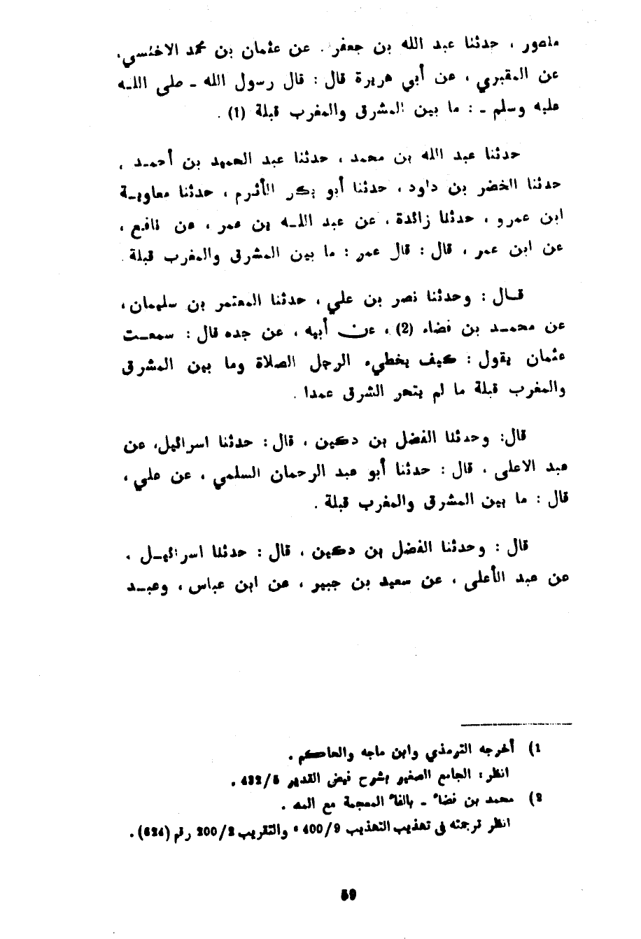 مَنْصُورٍ حَدَّثَنَا عَبْدُ اللَّهِ بْنُ جَعْفَرٍ عَنْ عُثْمَانَ بْنِ مُحَمَّدٍ الْأَخْنَسِيِّ عَنِ الْمَقْبُرِيِّ عَنْ أَبِي هُرَيْرَةَ قَالَ قَالَ رَسُولُ اللَّهِ صَلَّى اللَّهُ عَلَيْهِ وَسَلَّمَ مَا بَيْنَ الْمَشْرِقِ وَالْمَغْرِبِ قِبْلَةٌ حَدَّثَنَا عَبْدُ اللَّهِ بْنُ مُحَمَّدٍ حَدَّثَنَا عَبْدُ الْحَمِيدِ بْنُ أَحْمَدَ حَدَّثَنَا الْخَضِرُ بْنُ دَاوُدَ حَدَّثَنَا أَبُو بَكْرٍ الْأَثْرَمُ حَدَّثَنَا مُعَاوِيَةُ بْنُ عَمْرٍو حَدَّثَنَا زَائِدَةُ عَنْ عَبْدُ اللَّهِ بْنُ عُمَرَ عَنْ نَافِعٍ عَنِ ابن عمر قَالَ قَالَ عُمَرُ مَا بَيْنَ الْمَشْرِقِ وَالْمَغْرِبِ قِبْلَةٌ قَالَ وَحَدَّثَنَا نَصْرُ بْنُ عَلِيٍّ حَدَّثَنَا الْمُعْتَمِرُ بْنُ سُلَيْمَانَ عَنْ مُحَمَّدِ بْنِ فَضَاءٍ عَنْ أَبِيهِ عَنْ جَدِّهِ قَالَ سَمِعْتُ عُثْمَانَ يَقُولُ كَيْفَ يُخْطِئُ الرَّجُلُ الصَّلَاةَ وَمَا بَيْنَ الْمَشْرِقِ وَالْمَغْرِبِ قِبْلَةٌ مَا لَمْ يَتَحَرَّ الشَّرْقَ عَمْدًا قَالَ وَحَدَّثَنَا الْفَضْلُ بْنُ دُكَيْنٍ قَالَ حَدَّثَنَا إِسْرَائِيلُ عَنْ عَبْدِ الْأَعْلَى قَالَ حَدَّثَنَا أبو عبد الرحمان السُّلَمِيِّ عَنْ عَلِيٍّ قَالَ مَا بَيْنَ الْمَشْرِقِ وَالْمَغْرِبِ قِبْلَةٌ قَالَ وَحَدَّثَنَا الْفَضْلُ بْنُ دُكَيْنٍ قَالَ حَدَّثَنَا إِسْرَائِيلُ عَنْ عَبْدِ الْأَعْلَى عَنْ سَعِيدِ بْنِ جُبَيْرٍ عَنِ ابْنِ عَبَّاسٍ وَعَبْدِ