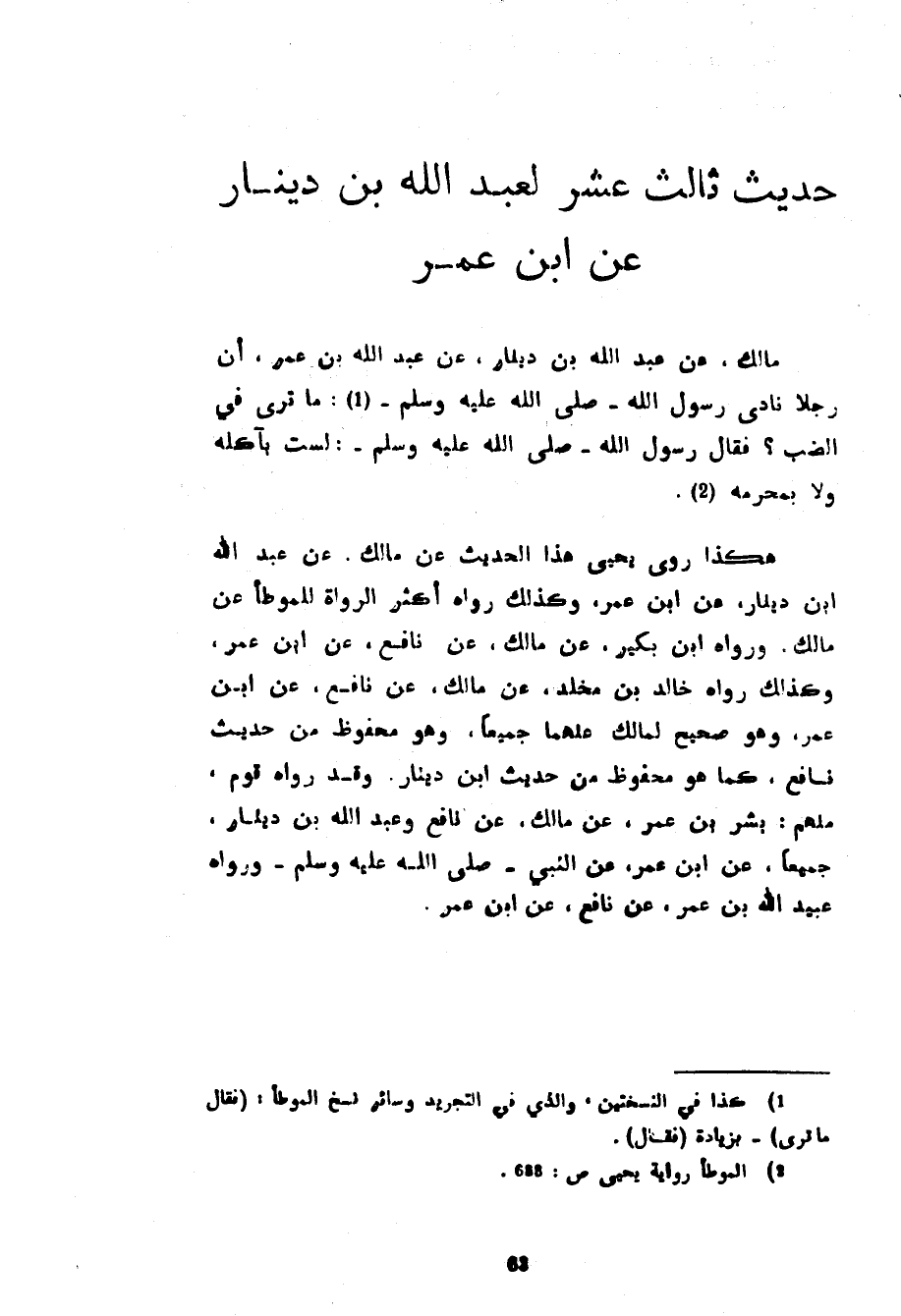 حَدِيثٌ ثَالِثَ عَشَرَ لِعَبْدِ اللَّهِ بْنِ دِينَارٍ عَنِ ابْنِ عُمَرَ مَالِكٌ عَنْ عَبْدِ اللَّهِ بْنِ دِينَارٍ عَنْ عَبْدِ اللَّهِ بْنِ عُمَرَ أَنَّ رَجُلًا نَادَى رَسُولَ اللَّهِ صَلَّى اللَّهُ عَلَيْهِ وَسَلَّمَ مَا تَرَى فِي الضَّبِّ فَقَالَ رَسُولُ اللَّهِ صَلَّى اللَّهُ عَلَيْهِ وَسَلَّمَ لَسْتُ بِآكِلِهِ وَلَا بِمُحَرِّمِهِ هَكَذَا رَوَى يَحْيَى هَذَا الْحَدِيثَ عَنْ مَالِكٍ عَنْ عَبْدِ اللَّهِ بْنِ دِينَارٍ عَنِ ابْنِ عُمَرَ وَكَذَلِكَ رَوَاهُ أَكْثَرُ الرُّوَاةِ لِلْمُوَطَّأِ عَنْ مَالِكٍ وَرَوَاهُ ابْنُ بُكَيْرٍ عَنْ مَالِكٍ عَنْ نَافِعٍ عَنِ ابْنِ عُمَرَ وَكَذَلِكَ رَوَاهُ خَالِدُ بْنُ مَخْلَدٍ عَنْ مَالِكٍ عَنْ نَافِعٍ عَنِ ابْنِ عُمَرَ وَهُوَ صَحِيحٌ لِمَالِكٍ عَنْهُمَا جَمِيعًا وَهُوَ مَحْفُوظٌ مِنْ حَدِيثِ نَافِعٍ كَمَا هُوَ مَحْفُوظٌ مِنْ حَدِيثِ ابْنِ دِينَارٍ وَقَدْ رَوَاهُ قَوْمٌ مِنْهُمْ بِشْرُ بْنُ عُمَرَ عَنْ مَالِكٍ عَنْ نَافِعٍ وَعَبْدِ اللَّهِ بْنِ دِينَارٍ جَمِيعًا عَنِ ابْنِ عُمَرَ عَنِ النَّبِيِّ صَلَّى اللَّهُ عَلَيْهِ وَسَلَّمَ وَرَوَاهُ عُبَيْدُ اللَّهِ بْنُ عُمَرَ عَنْ نَافِعٍ عَنِ ابْنِ عُمَرَ