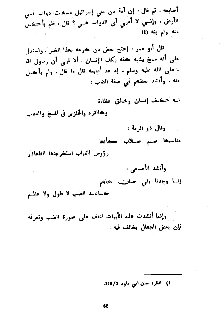 أَصَابِعَهُ ثُمَّ قَالَ إِنَّ أُمَّةً مِنْ بَنِي إِسْرَائِيلَ مُسِخَتْ دَوَابَّ فِي الْأَرْضِ وَإِنِّي لَا أَدْرِي أَيَّ الدَّوَابِّ هِيَ قَالَ فَلَمْ يَأْكُلْ مِنْهُ وَلَمْ يَنْهَ قَالَ أَبُو عُمَرَ احْتَجَّ بَعْضُ مَنْ كَرِهَهُ بِهَذَا الْخَبَرِ وَاسْتَدَلَّ عَلَى أنه مسخ يشبه كَفِّهِ بِكَفِّ الْإِنْسَانِ أَلَا تَرَى أَنَّ رَسُولَ اللَّهِ صَلَّى اللَّهُ عَلَيْهِ وَسَلَّمَ إِذْ عَدَّ أَصَابِعَهُ قَالَ مَا قَالَ وَلَمْ يَأْكُلْ مِنْهُ وَأَنْشَدُ بَعْضُهُمْ فِي صِفَةَ الضَّبِّ ... لَهُ كَفُّ إِنْسَانٍ وَخَلْقُ عَظَاءَةٍ ... وَكَالْقِرْدِ وَالْخِنْزِيرِ فِي الْمَسْخِ وَالْعَصْبِ ... وَقَالَ ذُو الرُّمَّةِ ... مَنَاسِمُهَا صُمٌّ صِلَابٌ كَأَنَّهَا ... رُؤُوسُ الضَّبَابِ اسْتَخْرَجَتْهَا الظَّهَائِرُ ... ... وَأَنْشَدَ الْأَصْمَعِيُّ ... إِنَّا وَجَدْنَا بَنِي حِمَّانَ كُلَّهُمُ ... كَسَاعِدِ الضَّبِّ لَا طُولٌ وَلَا عَظْمُ ... وَإِنَّمَا أَنْشَدْتُ هَذِهِ الأبيان لِتَقِفَ عَلَى صُورَةِ الضَّبِّ وَتَعْرِفَهُ فَإِنَّ بَعْضَ الْجُهَّالِ يُخَالِفُ فِيهِ