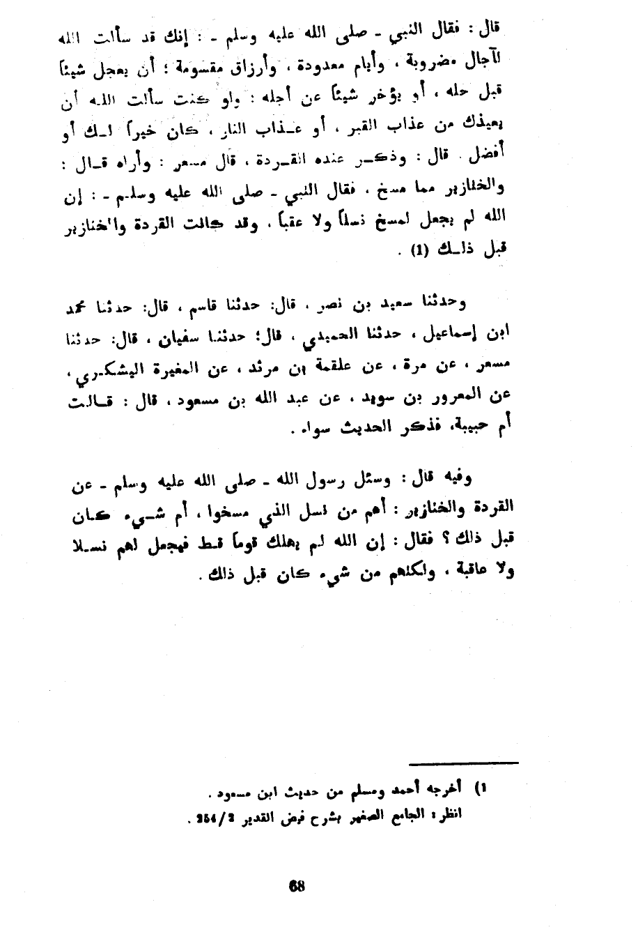 قَالَ فَقَالَ النَّبِيُّ صَلَّى اللَّهُ عَلَيْهِ وَسَلَّمَ إِنَّكِ قَدْ سَأَلْتِ اللَّهَ لِآجَالٍ مَضْرُوبَةٍ وَأَيَّامٍ مَعْدُودَةٍ وَأَرْزَاقٍ مَقْسُومَةٍ أَنْ يُعَجِّلَ شَيْئًا قَبْلَ حِلِّهِ أَوْ يُؤَخِّرَ شَيْئًا عَنْ أَجْلِهِ وَلَوْ كُنْتِ سَأَلْتِ اللَّهَ أَنْ يُعِيذَكِ مِنْ عَذَابِ الْقَبْرِ أَوْ عَذَابِ النَّارِ كَانَ خَيْرًا لَكِ أَوْ أَفْضَلَ قَالَ وَذُكِرَ عِنْدَهُ الْقِرَدَةُ قَالَ مِسْعَرٌ وَأَرَاهُ قَالَ وَالْخَنَازِيرُ مِمَّا مُسِخَ فَقَالَ النَّبِيُّ صَلَّى اللَّهُ عَلَيْهِ وَسَلَّمَ إِنَّ اله لَمْ يَجْعَلْ لَمَسْخٍ نَسْلًا وَلَا عَقِبًا وَقَدْ كَانَتِ الْقِرَدَةُ وَالْخَنَازِيرُ قَبْلَ ذَلِكَ وَحَدَّثَنَا سَعِيدُ بْنُ نَصْرٍ قَالَ حَدَّثَنَا قَاسِمُ قَالَ حَدَّثَنَا مُحَمَّدُ بْنُ إِسْمَاعِيلَ حَدَّثَنَا الْحُمَيْدِيُّ قَالَ حَدَّثَنَا سُفْيَانُ قَالَ حَدَّثَنَا مِسْعَرٌ عَنْ مُرَّةَ عَنْ عَلْقَمَةَ بْنِ مَرْثَدٍ عَنِ الْمُغِيرَةِ الْيَشْكُرِيِّ عَنِ الْمَعْرُورِ بْنِ سُوَيْدٍ عَنْ عَبْدِ اللَّهِ بْنِ مَسْعُودٍ قَالَ قَالَتْ أُمُّ حَبِيبَةَ فَذَكَرَ الْحَدِيثَ سَوَاءً وَفِيهِ قَالَ وَسُئِلَ رَسُولُ اللَّهِ صَلَّى اللَّهُ عَلَيْهِ وَسَلَّمَ عَنِ الْقِرَدَةِ وَالْخَنَازِيرِ أَهُمْ من نسل الذي مُسِخُوا أَمْ شَيْءٌ كَانَ قَبْلَ ذَلِكَ فَقَالَ إِنَّ اللَّهَ لَمْ يُهْلِكْ قَوْمًا قَطُّ فَيَجْعَلْ لَهُمْ نَسْلًا وَلَا عَاقِبَةً وَلَكِنَّهُمْ مِنْ شَيْءٍ كَانَ قَبْلَ ذَلِكَ