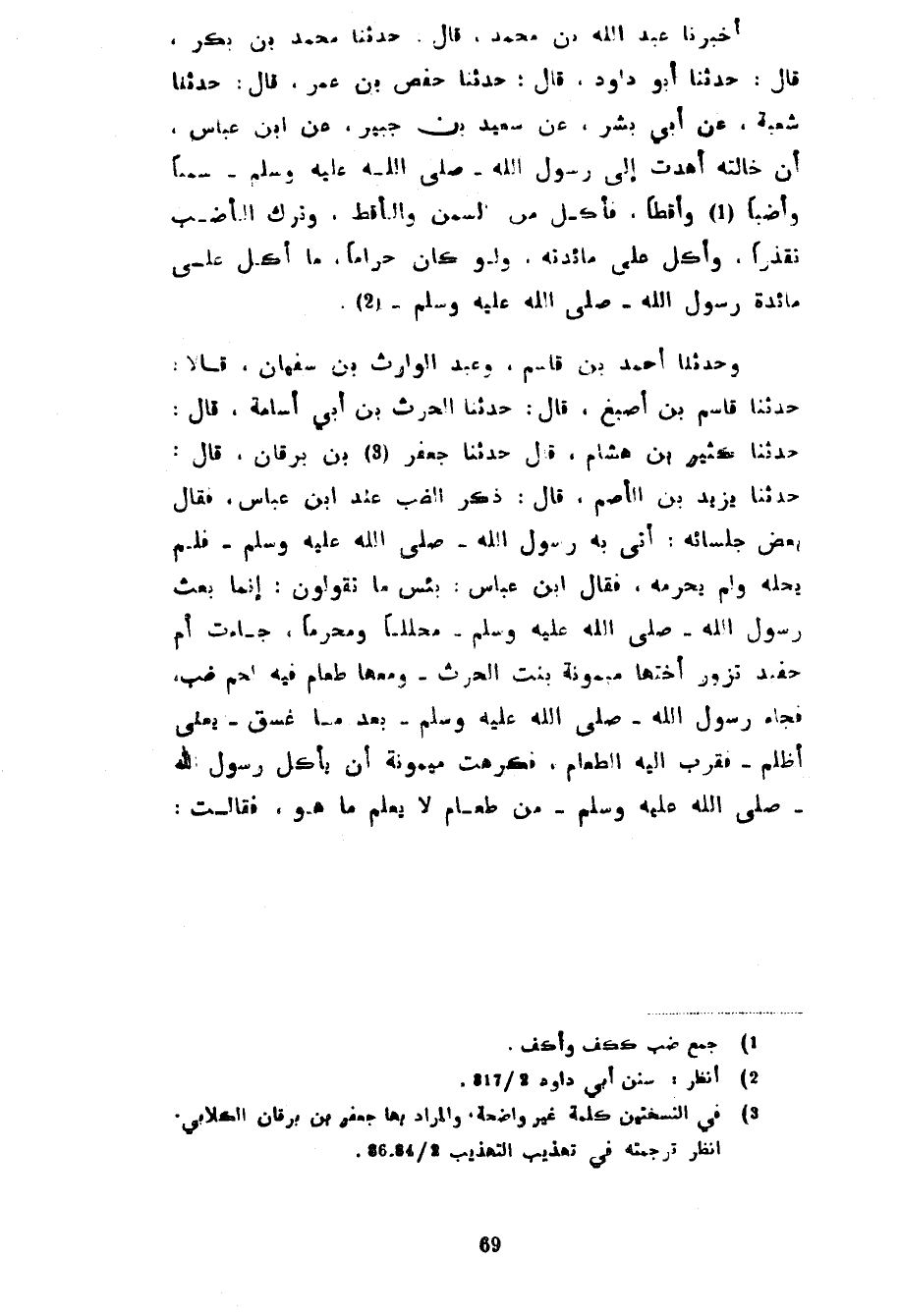 أَخْبَرَنَا عَبْدُ اللَّهِ بْنُ مُحَمَّدٍ قَالَ حَدَّثَنَا مُحَمَّدُ بْنُ بَكْرٍ قَالَ حَدَّثَنَا أَبُو دَاوُدَ قَالَ حَدَّثَنَا حَفْصُ بْنُ عُمَرَ قَالَ حَدَّثَنَا شُعْبَةُ عَنْ أَبِي بِشْرٍ عَنْ سَعِيدِ بْنِ جُبَيْرٍ عَنِ ابْنِ عَبَّاسٍ أَنَّ خَالَتَهُ أَهْدَتْ إِلَى رَسُولِ اللَّهِ صَلَّى اللَّهُ عَلَيْهِ وَسَلَّمَ سَمْنًا وَأَضُبًّا وَأَقِطًا فَأَكَلَ مِنَ السَّمْنِ وَالْأَقِطِ وَتَرَكَ الْأَضُبَّ تَقَذُّرًا وَأُكِلَ عَلَى مَائِدَتِهِ وَلَوْ كَانَ حَرَامًا مَا أُكِلَ عَلَى مَائِدَةِ رَسُولِ اللَّهِ صَلَّى اللَّهُ عَلَيْهِ وَسَلَّمَ وَحَدَّثَنَا أَحْمَدُ بْنُ قَاسِمٍ وَعَبْدُ الْوَارِثِ بْنُ سُفْيَانَ قَالَا حَدَّثَنَا قَاسِمُ بْنُ أَصْبَغَ قَالَ حَدَّثَنَا الْحَرْثُ بْنُ أَبِي أُسَامَةَ قَالَ حَدَّثَنَا كَثِيرُ بْنُ هِشَامٍ قَالَ حَدَّثَنَا جَعْفَرُ بْنُ بُرْقَانَ قَالَ حَدَّثَنَا يَزِيدُ بْنُ الْأَصَمِّ قَالَ ذُكِرَ الضَّبُّ عِنْدَ ابْنِ عَبَّاسٍ فَقَالَ بَعْضُ جُلَسَائِهِ أُتِيَ بِهِ رَسُولُ اللَّهِ صَلَّى اللَّهُ عَلَيْهِ وَسَلَّمَ فَلَمْ يُحِلَّهُ وَلَمْ يُحَرِّمْهُ فَقَالَ ابْنُ عَبَّاسٍ بِئْسَ مَا تَقُولُونَ إِنَّمَا بَعَثَ رَسُولُ اللَّهِ صَلَّى اللَّهُ عَلَيْهِ وَسَلَّمَ مُحَلِّلًا وَمُحَرَّمًا جَاءَتْ أم حفيد تزور أختها ميمونة بنت الحرث وَمَعَهَا طَعَامٌ فِيهِ لَحْمُ ضَبٍّ فَجَاءَ رَسُولُ اللَّهِ صَلَّى اللَّهُ عَلَيْهِ وَسَلَّمَ بَعْدَ مَا غَسَقَ يَعْنِي أَظْلَمَ فَقُرِّبَ إِلَيْهِ الطَّعَامُ فَكَرِهَتْ مَيْمُونَةُ أَنْ يَأْكُلَ رَسُولُ اللَّهِ صَلَّى اللَّهُ عَلَيْهِ وَسَلَّمَ مِنْ طَعَامٍ لَا يَعْلَمُ مَا هو فقالت