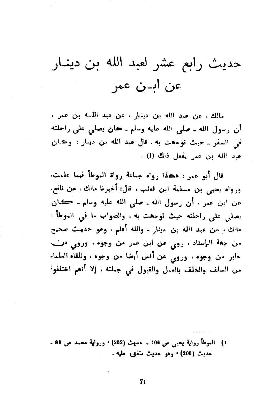 حَدِيثٌ رَابِعَ عَشَرَ لِعَبْدِ اللَّهِ بْنِ دِينَارٍ عَنِ ابْنِ عُمَرَ مَالِكٌ عَنْ عَبْدِ اللَّهِ بْنِ دِينَارٍ عَنْ عَبْدِ اللَّهِ بْنِ عُمَرَ أَنَّ رَسُولَ اللَّهِ صَلَّى اللَّهُ عَلَيْهِ وسلم كَانَ يُصَلِّي عَلَى رَاحِلَتِهِ فِي السَّفَرِ حَيْثُ تَوَجَّهَتْ بِهِ قَالَ عَبْدُ اللَّهِ بْنُ دِينَارٍ وَكَانَ عَبْدُ اللَّهِ بْنُ عُمَرَ يَفْعَلُ ذَلِكَ قَالَ أَبُو عُمَرَ هَكَذَا رَوَاهُ جَمَاعَةُ رُوَاةِ الْمُوَطَّأِ فِيمَا عَلِمْتُ وَرَوَاهُ يَحْيَى بْنُ مَسْلَمَةَ بْنِ قَعْنَبٍ قَالَ أَخْبَرَنَا مَالِكٍ عَنْ نَافِعٍ عَنِ ابْنِ عُمَرَ أَنَّ رَسُولَ اللَّهِ صَلَّى اللَّهُ عَلَيْهِ وَسَلَّمَ كَانَ يُصَلِّي عَلَى رَاحِلَتِهِ حَيْثُ تَوَجَّهَتْ بِهِ وَالصَّوَابُ مَا فِي الْمُوَطَّأِ مَالِكٌ عَنْ عَبْدِ اللَّهِ بْنِ دِينَارٍ وَاللَّهُ أَعْلَمُ وَهُوَ حَدِيثٌ صَحِيحٌ مِنْ جِهَةِ الْإِسْنَادِ رُوِيَ عَنِ ابْنِ عُمَرَ مِنْ وُجُوهٍ وَرُوِيَ عَنْ جَابِرٍ مِنْ وُجُوهٍ وَرُوِيَ عَنْ أَنَسٍ أَيْضًا مِنْ وُجُوهٍ وَتَلَقَّاهُ الْعُلَمَاءُ مِنَ السَّلَفِ وَالْخَلَفِ بِالْعَمَلِ وَالْقَبُولِ فِي جُمْلَتِهِ إِلَّا أَنَّهُمُ اختلفوا