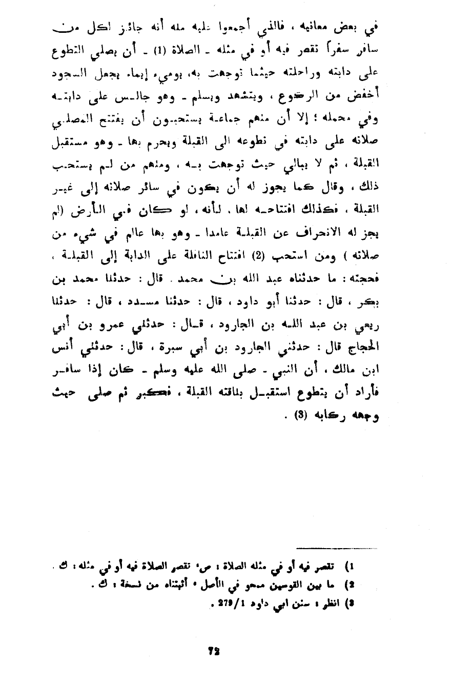 فِي بَعْضِ مَعَانِيهِ فَالَّذِي أَجْمَعُوا عَلَيْهِ مِنْهُ أَنَّهُ جَائِزٌ لِكُلِّ مَنْ سَافَرَ سَفَرًا تُقْصَرُ فِيهِ أَوْ فِي مِثْلِهِ الصَّلَاةُ أَنْ يُصَلِّيَ التَّطَوُّعَ عَلَى دَابَّتِهِ وَرَاحِلَتِهِ حَيْثُمَا تَوَجَّهَتْ بِهِ يُومِئُ إِيمَاءً يَجْعَلُ السُّجُودَ أَخْفَضَ مِنَ الرُّكُوعِ وَيَتَشَهَّدُ وَيُسَلِّمُ وَهُوَ جَالِسٌ عَلَى دَابَّتِهِ وَفِي مَحْمِلِهِ إِلَّا أَنَّ مِنْهُمْ جَمَاعَةً يَسْتَحِبُّونَ أَنْ يَفْتَتِحَ الْمُصَلِّي صَلَاتَهُ عَلَى دَابَّتِهِ فِي تَطَوُّعِهِ إِلَى الْقِبْلَةِ وَيُحْرِمَ بِهَا وَهُوَ مُسْتَقْبَلٌ الْقِبْلَةَ ثُمَّ لَا يُبَالِي حَيْثُ تَوَجَّهَتْ بِهِ وَمِنْهُمْ مَنْ لَمْ يَسْتَحِبَّ ذَلِكَ وَقَالَ كَمَا يَجُوزُ لَهُ أَنْ يَكُونَ فِي سَائِرِ صَلَاتِهِ إِلَى غَيْرِ الْقِبْلَةِ فَكَذَلِكَ افْتِتَاحُهُ لَهَا لِأَنَّهُ لَوْ كَانَ فِي الْأَرْضِ (لَمْ يَجُزْ لَهُ الِانْحِرَافُ عَنِ الْقِبْلَةِ عَامِدًا وَهُوَ بِهَا عَالِمٌ فِي شَيْءٍ مِنْ صَلَاتِهِ) وَمَنِ اسْتَحَبَّ افْتِتَاحَ النَّافِلَةِ عَلَى الدَّابَّةِ إِلَى الْقِبْلَةِ فَحُجَّتُهُ مَا حَدَّثَنَاهُ عَبْدُ اللَّهِ بْنُ مُحَمَّدٍ قَالَ حَدَّثَنَا مُحَمَّدُ بْنُ بَكْرٍ قَالَ حَدَّثَنَا أَبُو داود قال حَدَّثَنَا مُسَدَّدٌ قَالَ حَدَّثَنَا رِبْعِيُّ بْنُ عَبْدِ اللَّهِ بْنِ الْجَارُودِ قَالَ حَدَّثَنِي عَمْرُو بْنُ أَبِي الْحَجَّاجِ قَالَ حَدَّثَنِي الْجَارُودُ بْنُ أَبِي سَبْرَةَ قَالَ حَدَّثَنِي أَنَسِ بْنِ مَالِكٍ أَنَّ النَّبِيَّ صَلَّى اللَّهُ عَلَيْهِ وَسَلَّمَ كَانَ إذا سَافَرَ فَأَرَادَ أَنْ يَتَطَوَّعَ اسْتَقْبَلَ بِنَاقَتِهِ الْقِبْلَةَ فَكَبَّرَ ثُمَّ صَلَّى حَيْثُ وَجَّهَهُ رِكَابُهُ